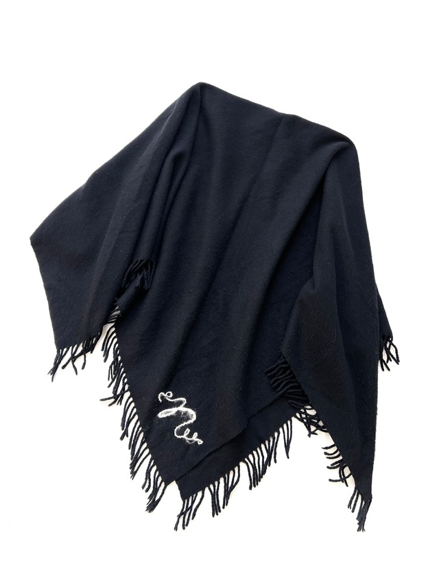 80年代当時の日本のモード界を支えてきた【Boutique NICOLE) 現代ではなかなかお目にかかれない贅沢な大判サイズのショールです。肩からバサリと羽織るだけで、コート代わりになるほどの圧倒的な存在感と保温性があります。膝掛け(ブランケット)としても十分な大きさです。漆黒のウール地に映える、アイボリーの太糸で施された流れるような刺繍。ブランドの頭文字「N」を抽象化したような、有機的なラインが都会的なアクセントを添えています。 ヴィンテージアイテムのため、長年大切にされてきたことがわかる、ウール特有の柔らかな毛羽立ちがあります。 装いに深みをもたらしてくれる、こなれ感としてお楽しみいただけたらと思います。今の時期はもちろん、春先の冷え込む夜など、永く寄り添ってくれるヴィンテージならではの良さが詰まった一枚です。 超大判なので、ベルトでウエストマークしてジレ風に、車移動の方の防寒着としても良いかと思います。 表記はありませんが、おそらくウールにカシミヤが少しブレンドされているのではないかとおもいます。 130cm×130cm