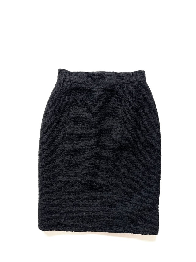 1999年秋冬、カール・ラガーフェルド時代のコレクションアーカイブです。 素材は太番手のウールをループ状に編み立てた、立体的なブークレのテクスチャで、黒を超えた深みのある表情を見せてくれます。 タイト&コンパクトなシルエット ミニマルなカッティングが、当時のモダンな女性像を象徴しています。 裏地にはココマークが繊細に織り込まれたシルク素材使用しています。 ヴィンテージ品のため、使用感や一部、糸飛びはありますが、目立つ汚れやダメージはありません。 size 36 ウエスト61cm スカート丈53cm ヒップ85cm 表地ウール100% 裏地シルク100%