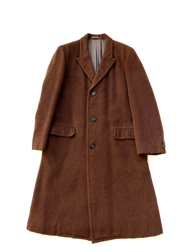 1960年代に香港・九龍の"MARILELA'S CUSTOM TAILORS"(マリレラズ・カスタム・テーラーズ)にて、特定のお客様のために仕立てられたオーダーメイドコート。 豊かなチョコレートブラウンのアニマルファーのような起毛感(おそらくモヘアやアルパカなどが考えられます)を持つ、ふっくらとした上質な素材。 当時のブリティッシュ・アメリカンな雰囲気を纏った、広がりを持たせたAラインのシルエットが特徴です。ノッチドラペル、3つボタン、そしてフラップ付きポケット、背面のサイドベンツ仕立てとディテールのクラシカルなデザインは、時代を超えてエレガントなスタイルを演出してくれます。 裏地には光沢のあるサテン生地が使用され、控えめなパターンが施されており、見えない部分にもカスタムテーラーとしてのこだわりが感じられます。半世紀以上の時を超えて、ヴィンテージならではの風格と、当時の贅沢な手仕事の温もりを今に伝える、希少価値の高い一品です。 長年の愛用によって生じた、生地表面の細かな素材の削げや微細な毛羽立ちや補強跡があります。こちらのコートが歩んだ歴史としての味わいとして、ヴィンテージ好きな方におすすめいたします。 女性にもおすすめです。 size L程度 着丈108cm 肩幅45cm 身幅58cm 袖丈64cm ウール