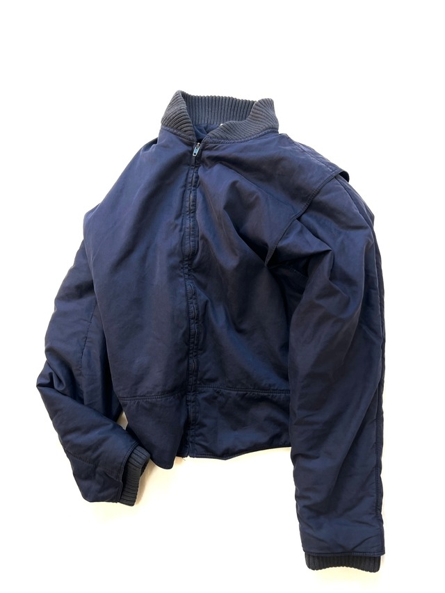 ジャンニ・ヴェルサーチ本人がブランドのクリエイティブを牽引していた時期の作品です。 当時のヴェルサーチ は大胆な色使いや華やかな柄のイメージが先行しがちですが、このようにシックなカラーリングのミリタリーやスポーティなアイテムにも前衛的な構築美を取り入れることで、他ブランドとは一線を画していました。 パフブルゾンにベストをレイヤードしたような立体的な構築美、カッティングによる陰影など、アーティスティックなデザインです。 深く美しいネイビーカラーは、ヴェルサーチらしい大胆なデザインを落ち着かせ、都会的で洗練された印象を感じる逸品です。 使用感はありますが、目立つ汚れやダメージはありません。袖口に少しキズありです。 size 48 着丈64cm 肩幅47cm 身幅60cm 袖丈65cm コットン