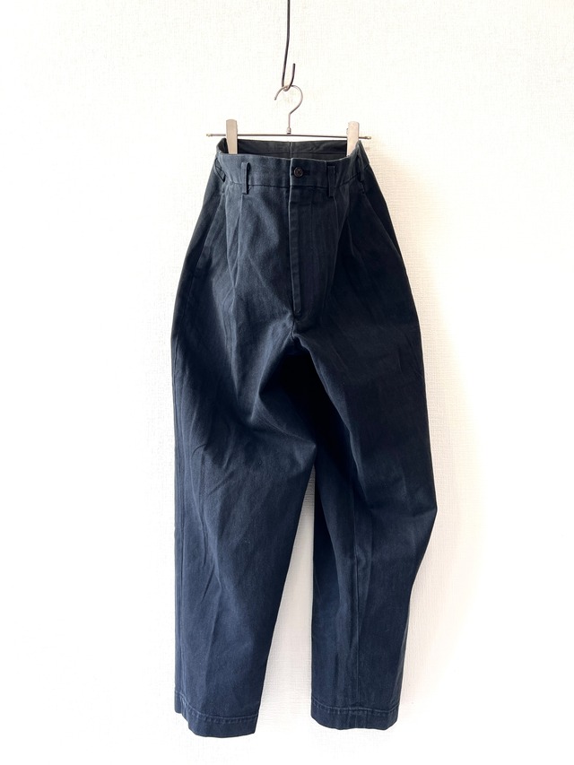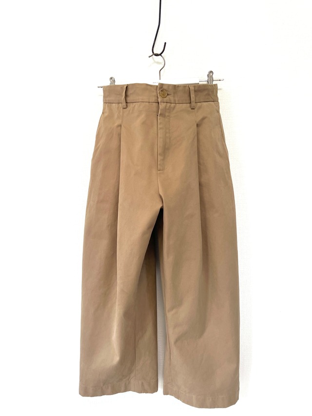STUDIO NICHOLSON(スタジオニコルソン)からペインターパンツのディティールを採用したワイドパンツ『BRIDGES』。 定価49,500円 生地の表面を桃の皮のように、短く細かい毛羽で覆うピーチ加工が施され、柔らかく滑らかな手触りのコットン素材。 腰回りはスッキリしながら、太腿から大きくボリュームを出した独特なシルエットが目を惹きます。 フロントのワンプリーツ、やや起毛感のある生地の質感で上品さもしっかりと組み込んでいます。 ハンマーループ、シンチベルト、大きなポケットとペインターパンツの要素を取り入れたデザインが特徴です。 表情のあるツイルの模様が魅力的で、ハリがあり、独特なシルエットを美しく表現しています。 内側のストラップボタンは代替えしてあります。多少の使用感はありますが、目立つ汚れやダメージはありません。 綺麗なコンディションです。 size S ウエスト84cm 股上35.5cm 股下63cm ワタリ幅40cm 裾幅28cm コットン100%