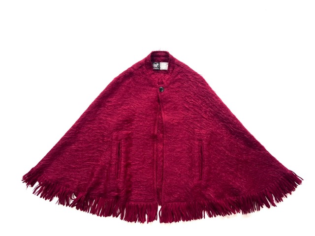 スコットランドの老舗テキスタイルメーカーであり、高品質なウール製品で知られるAndrew Stewart (アンドリュー・スチュワート) モヘア(アンゴラ山羊の毛)とウールの混紡のシャギーケープです。 1960年代のボヘミアンスタイルにも通じるモヘア特有の光沢とシャギー感。 裾周りにたっぷりと施されたフリンジは歩くたびに揺れ動き、フォークロア調の魅力と、深いワインレッドの美しい色合いは、クラシックな装いを華やかに彩ります。 首元は一つボタン仕様で、すっきりとした立ち襟のようなデザイン。 1960年代〜70年代のクラシカルなムードを纏い、現代のタートルネックやブーツ、デニムなどと合わせることで、モダンなボヘミアンスタイルやレトロシックなスタイルを完成させることができます。秋冬の主役となる、存在感のある一着です。 多少の使用感はありますが、ヴィンテージの良い風合いです。 size 着丈64cm モヘア40% ウール60%