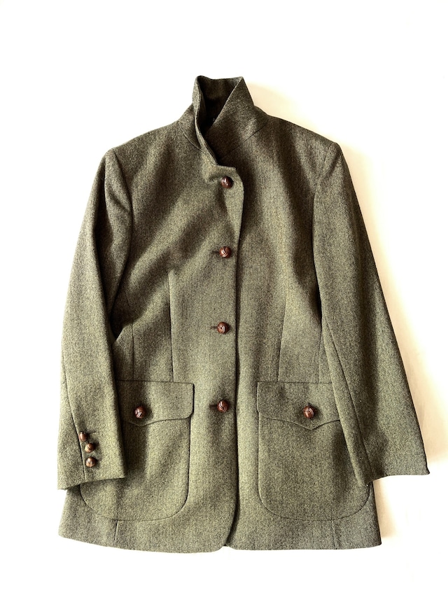 1980年代、中島伊津子氏によるブティックニコル。 英国伝統のハンティングウェアの様式美を、日本のトップデザイナーがモードに落とし込んだ作品。中島伊津子氏らしい「エレガンスとマニッシュの融合」が象徴された一着です。 ボディはヘリンボーンの織り目が非常に密で立体的、しっかりとした重厚感と弾力のあるウール地が使われていて堅牢なクオリティを誇ります。 前身頃から後ろ身頃にかけて垂直に走る「バーティカル・ストラップ(共布の帯)」の仕立て。柄合わせを完璧に行いながら立体的に縫い付けられており、高度なカッティング技術が証明されています。 同素材のウエストベルトを絞ることで生まれる美しいXラインは、無骨なハンティングウェアをエレガントなモードへと昇華させています。 背面には、激しい動きを妨げないための「インバーテッド・プリーツ」を配置。本格的なノーフォークジャケットの意匠を忠実に再現しており、機能美と造形美が共存しています。 フロントや袖口ボタンは重厚な編み込みレザーボタンを使用。使い込むほどに味わいが増す、ヴィンテージならではのパーツ選びです。 レディースウェアでここまで徹底したメンズライクな本物志向の仕立ては極めて稀です。どこを切り取っても当時のニコルの妥協なき物作りが凝縮されています。 目立つ汚れやダメージのないコンディションです。前の持ち主様が袖丈を短くしています。 size FREE 着丈70cm 肩幅45cm 身幅53cm 袖丈56cm 表地 毛100% 裏地 キュプラ100%