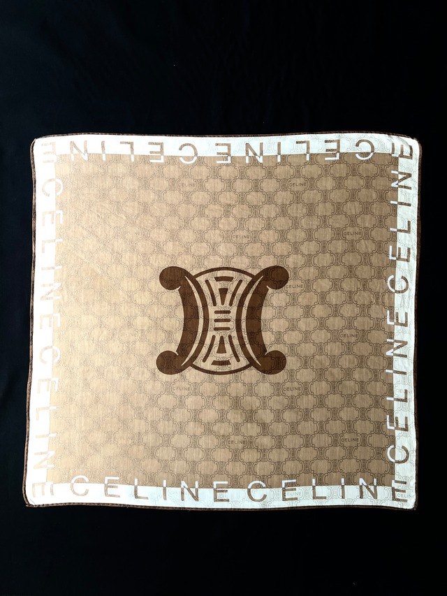 セリーヌのヴィンテージスカーフ 中央にセリーヌを象徴する大きなトリオンフ柄を配置、縁周りにはロゴ、さらに全面に細かく散りばめられたトリオンフ模様。 ブランドのアイデンティティを強く感じさせるクラシックなモノグラムは、時代を超えて愛されるセリーヌの魅力を凝縮しています。 上品なブラウン系の配色で全体的に落ち着いた色合いでまとめられており、どのようなスタイルにも合わせやすい汎用性の高さが魅力です。 コットン・シルク梱包素材は、なめらかな肌触りと美しいドレープ性、そして上品な光沢が特徴です。 バンダナ、スカーフ、ハンカチと多様な用途でご使用いただけ、首元やバッグのアクセント、へアアクセサリー、ほっかむり等、様々なスタイリングを可能にしてくれます。 目立つ汚れやダメージはありません。 品質表示タグ等はありません。 横57cm 縦55cm 素材 綿57% 絹43%