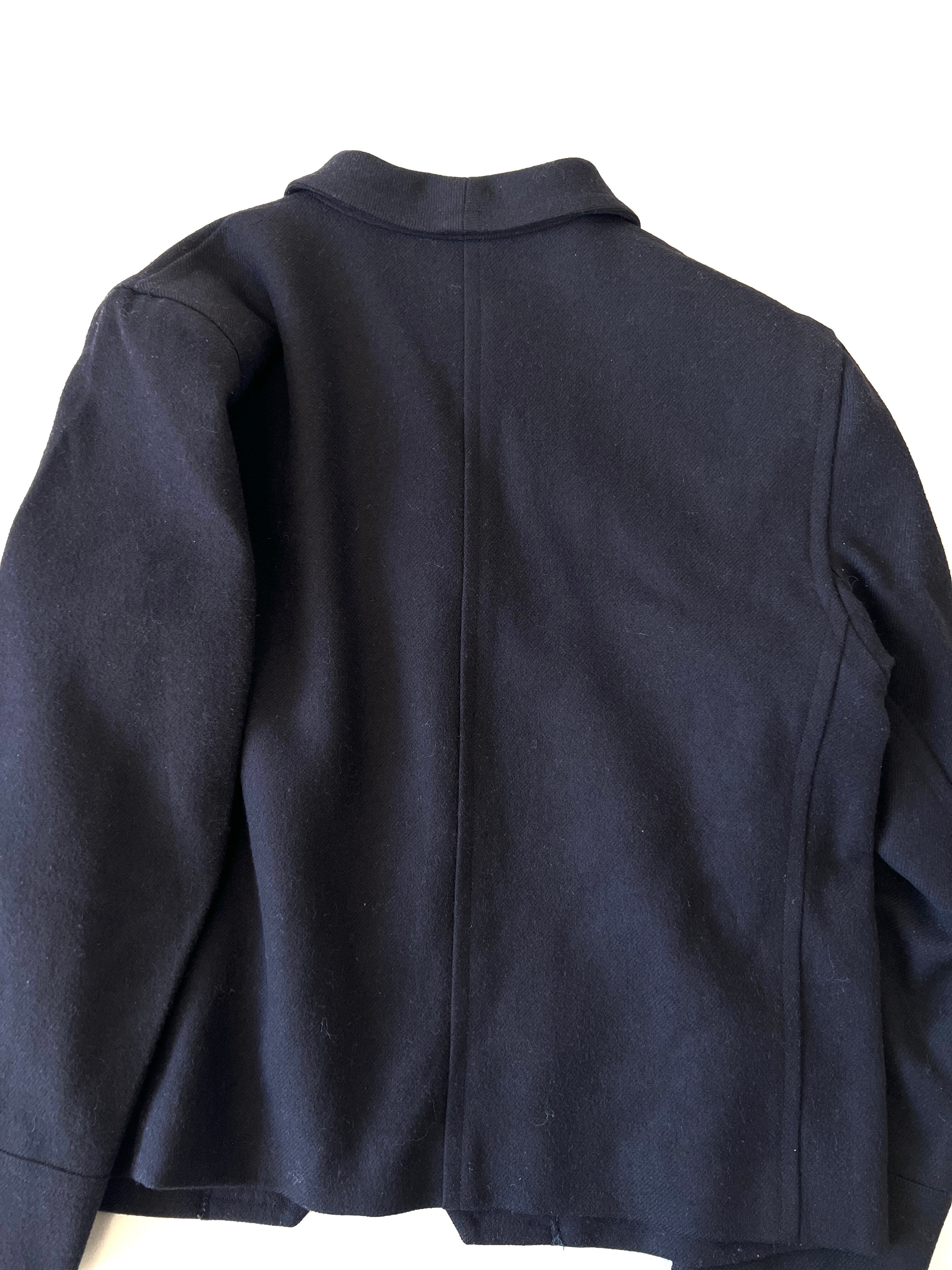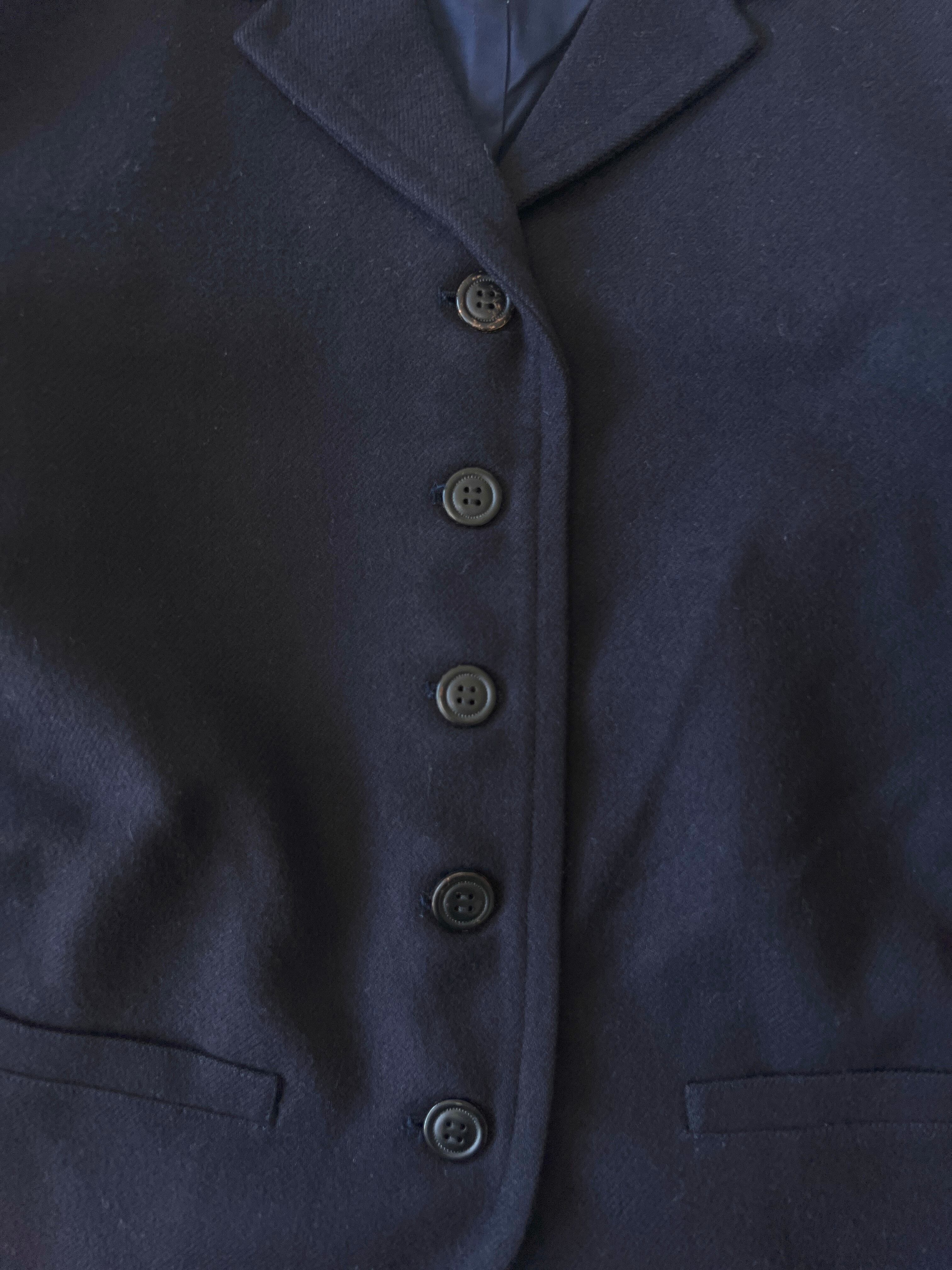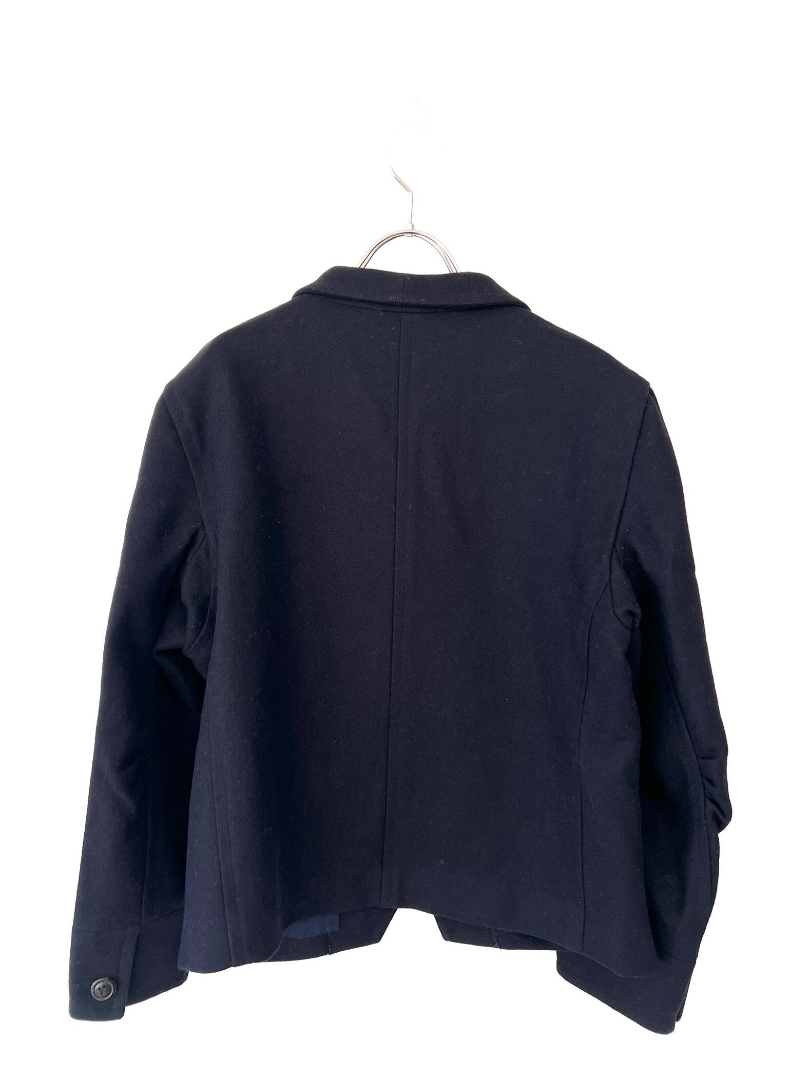 Vゾーンを狭めたボタン使いがクラシックなクロップドジャケット。立体感を演出するサイドシームの手の込んだ切り替え、袖口はワークブルゾンのようなカジュアルな仕立て。