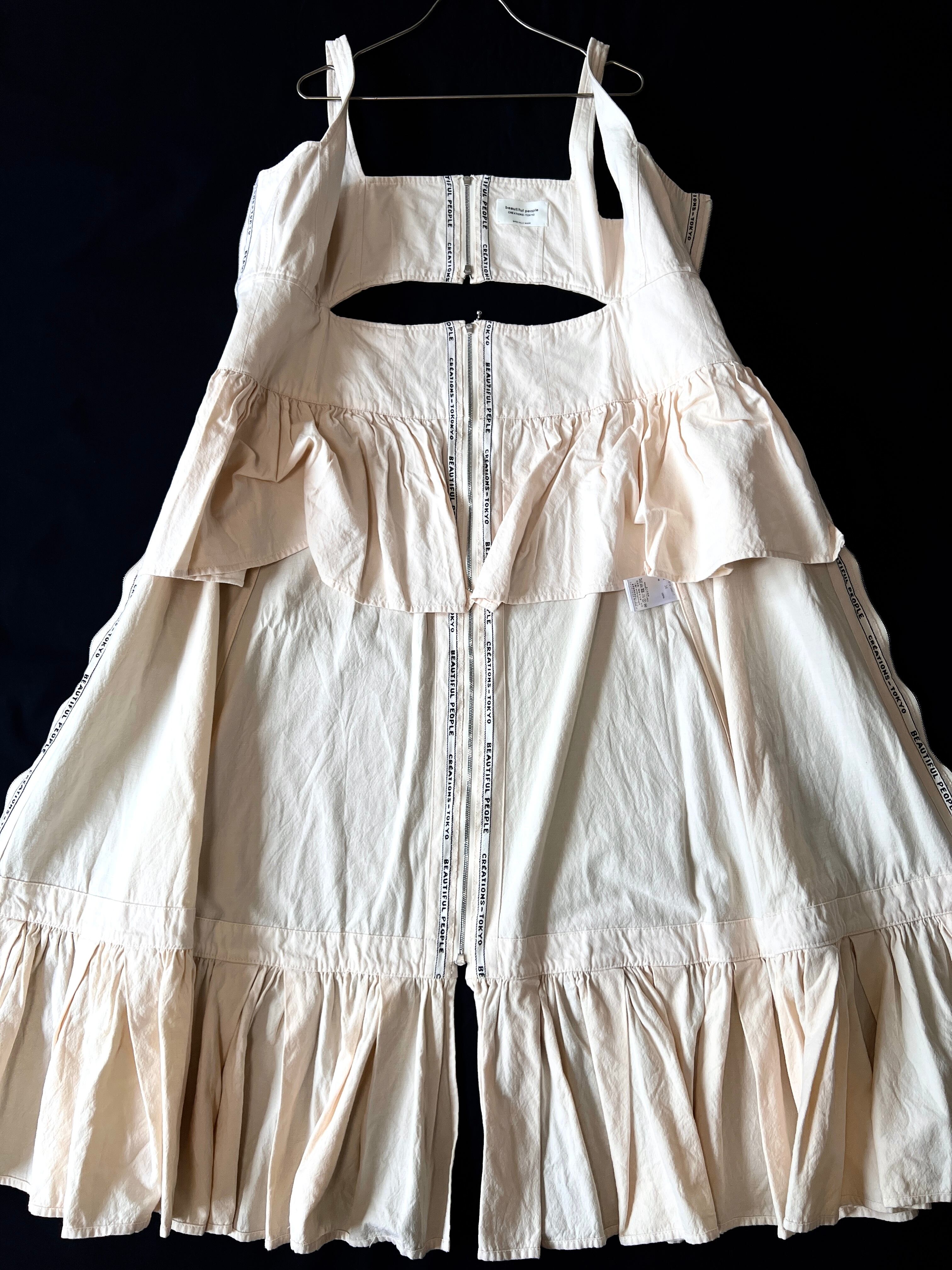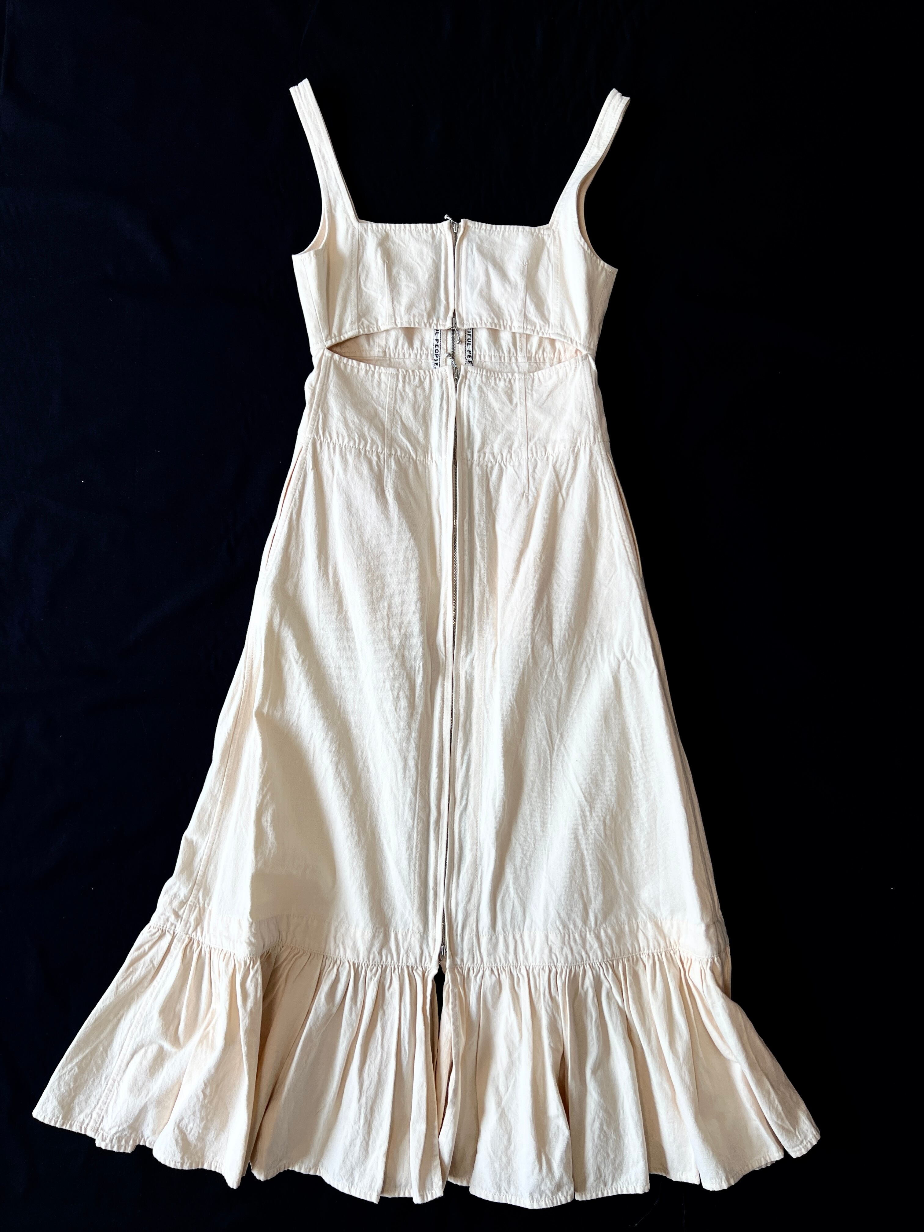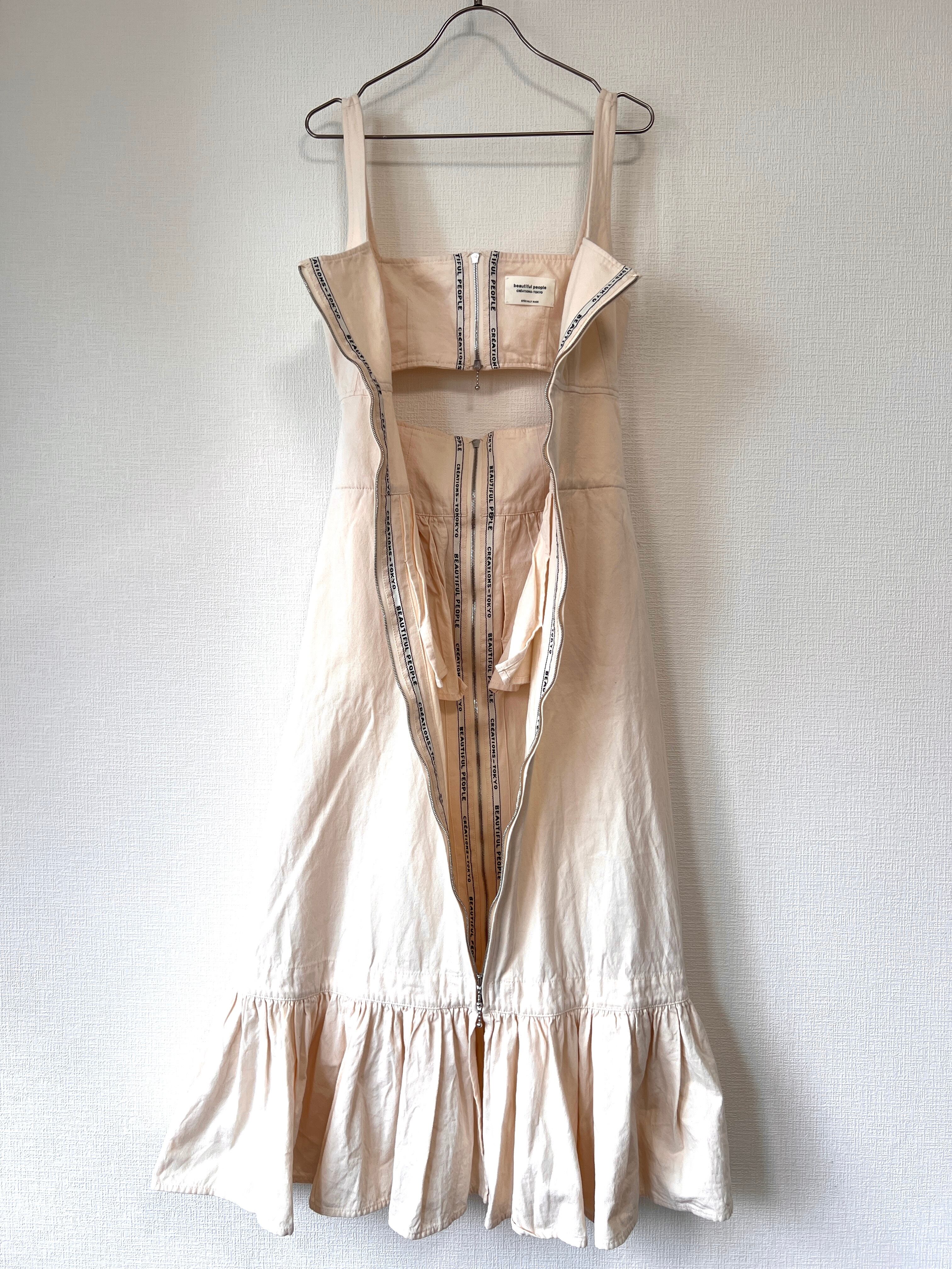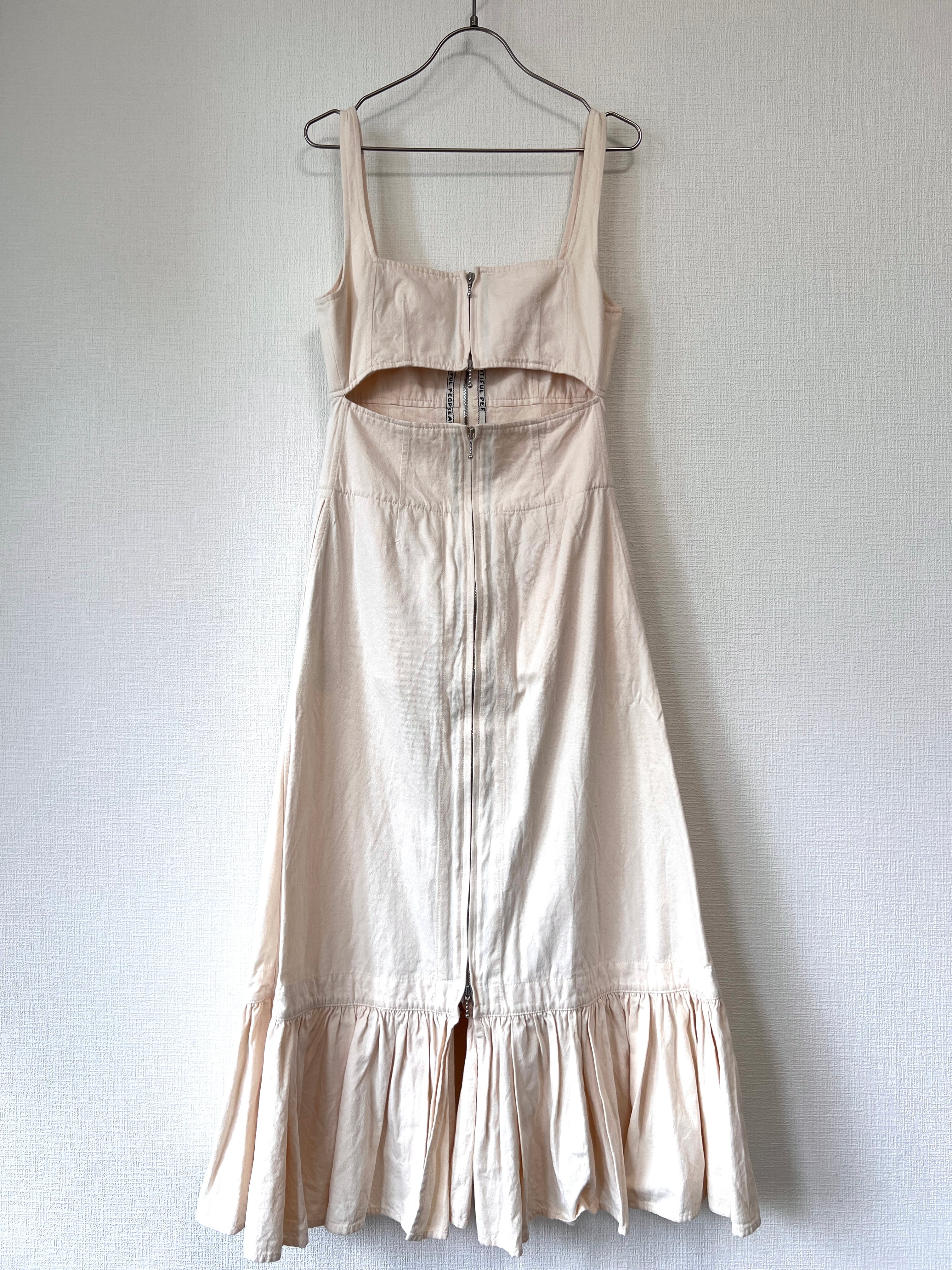 背中にカットアウトを施したキャミソールのギャザースカートワンピース。定価 ¥77,000