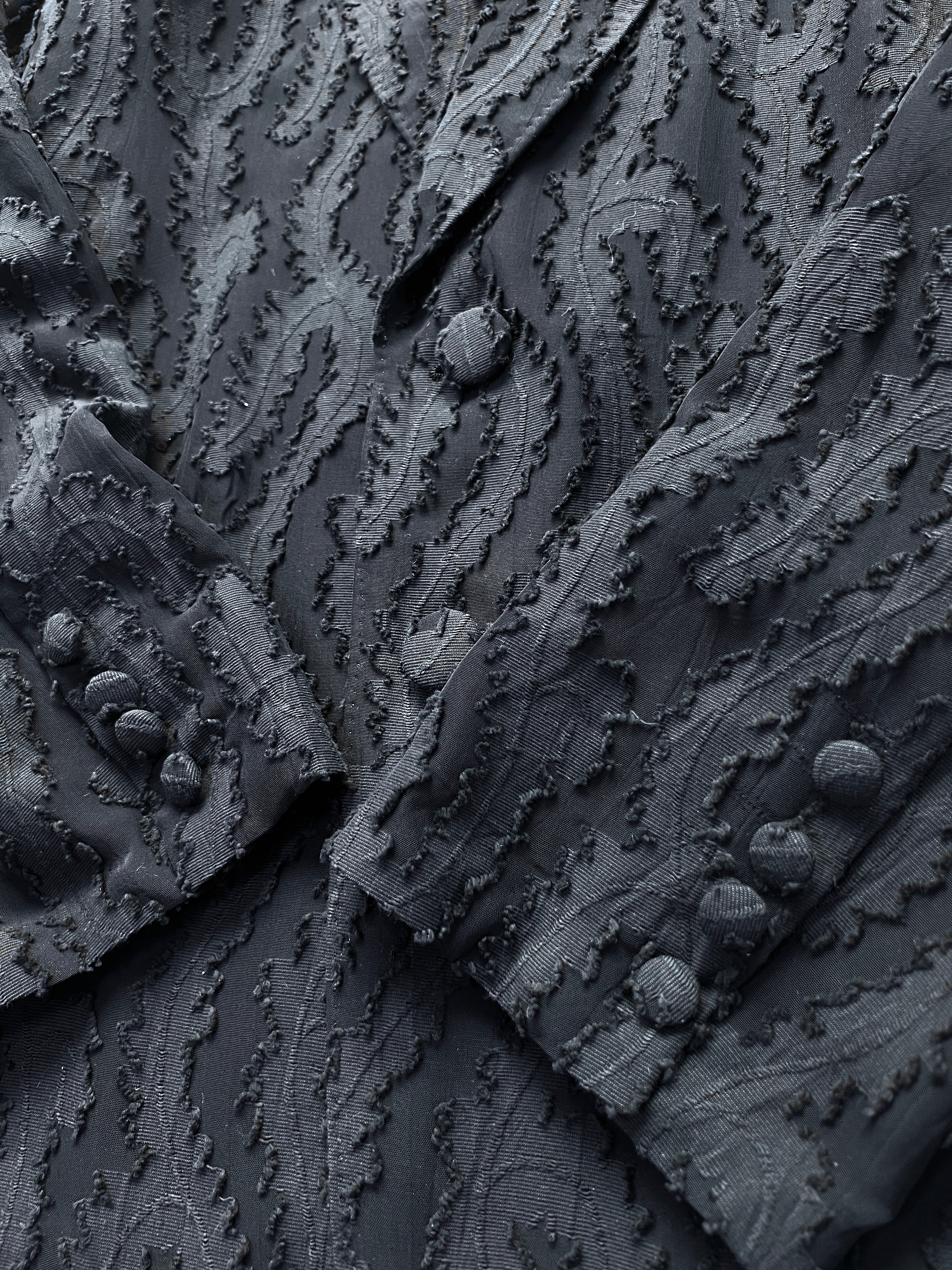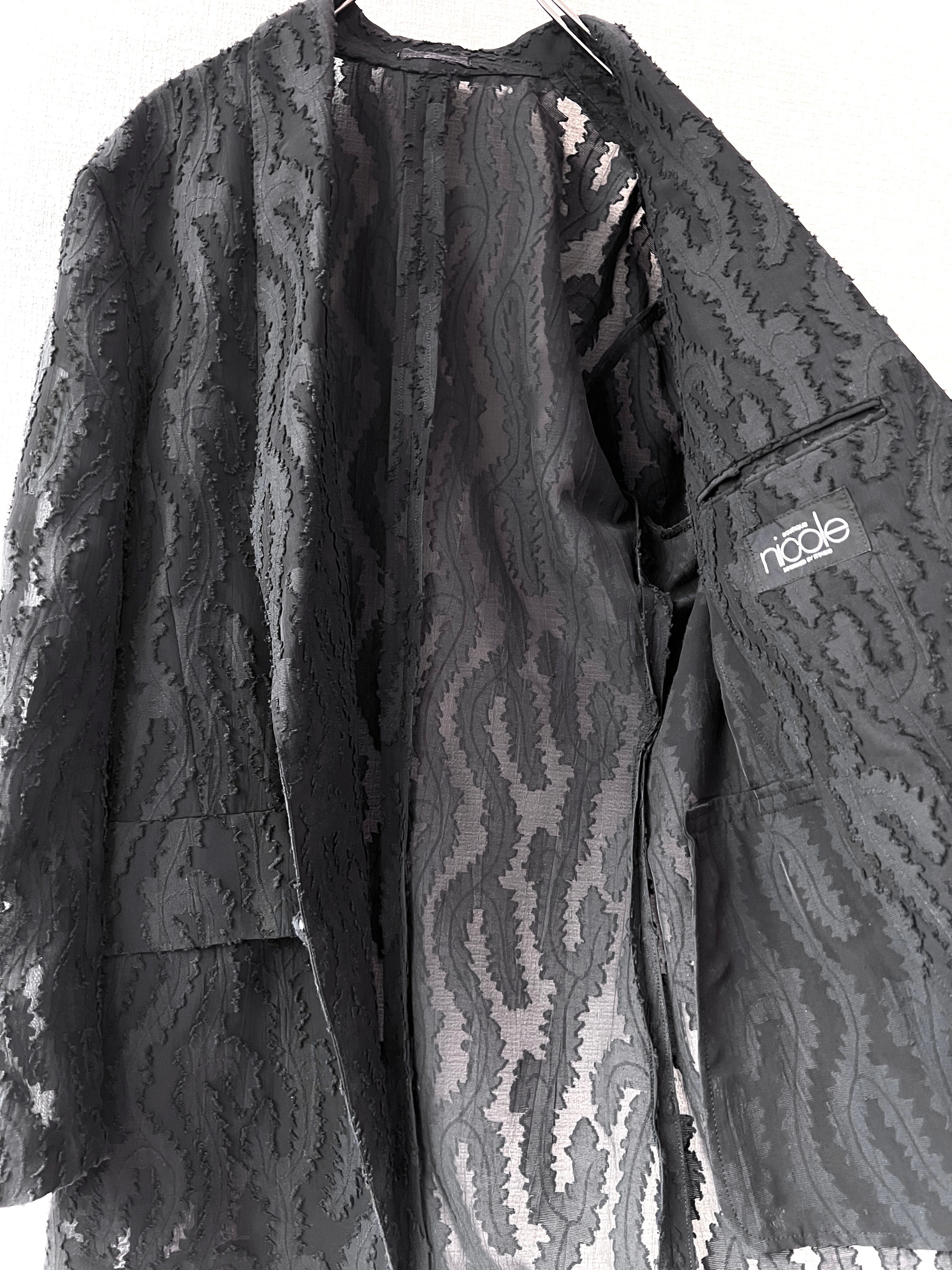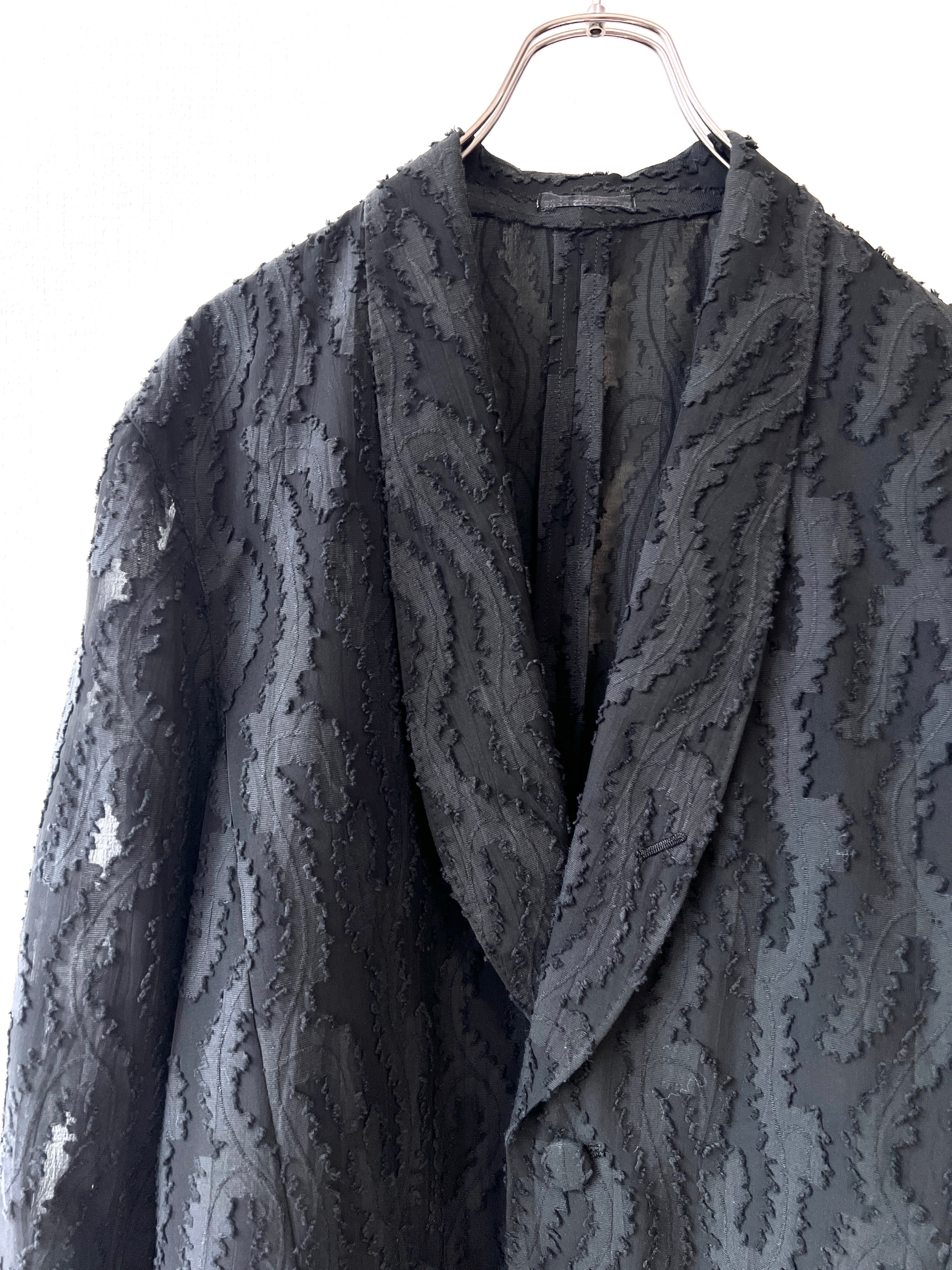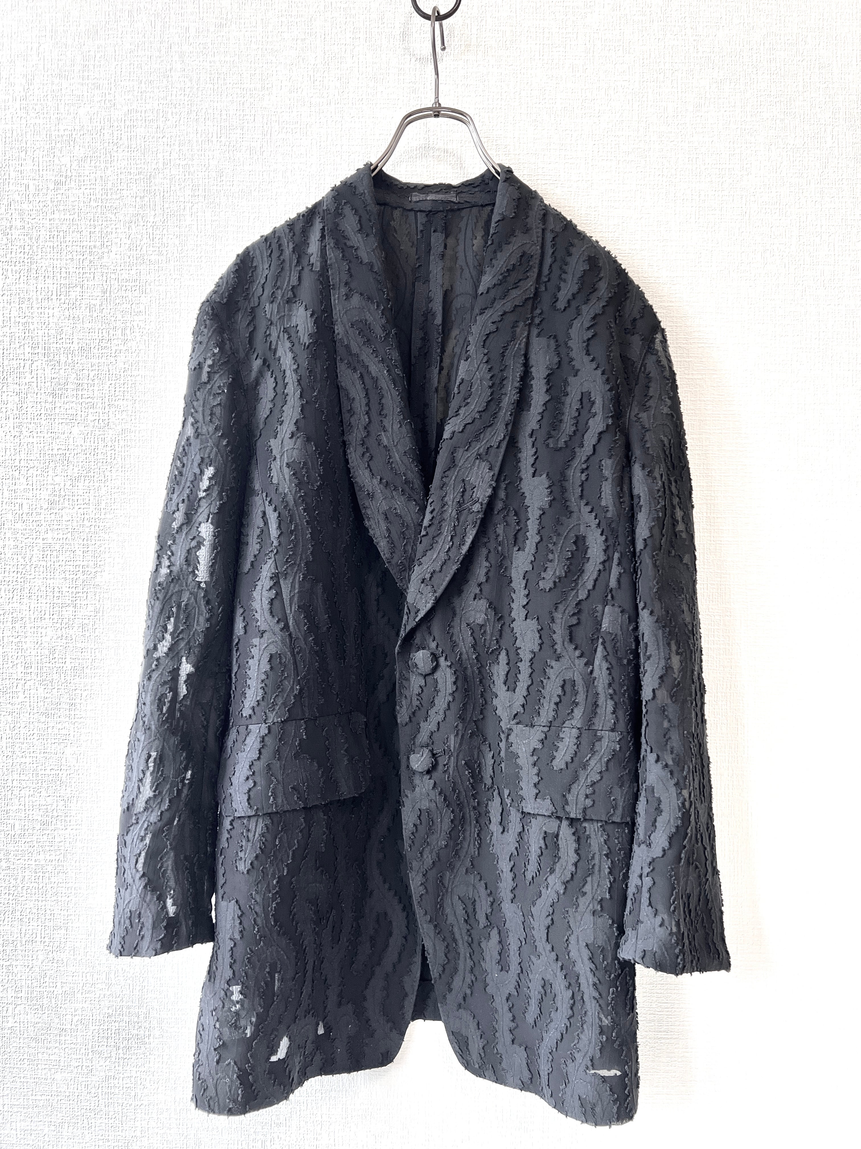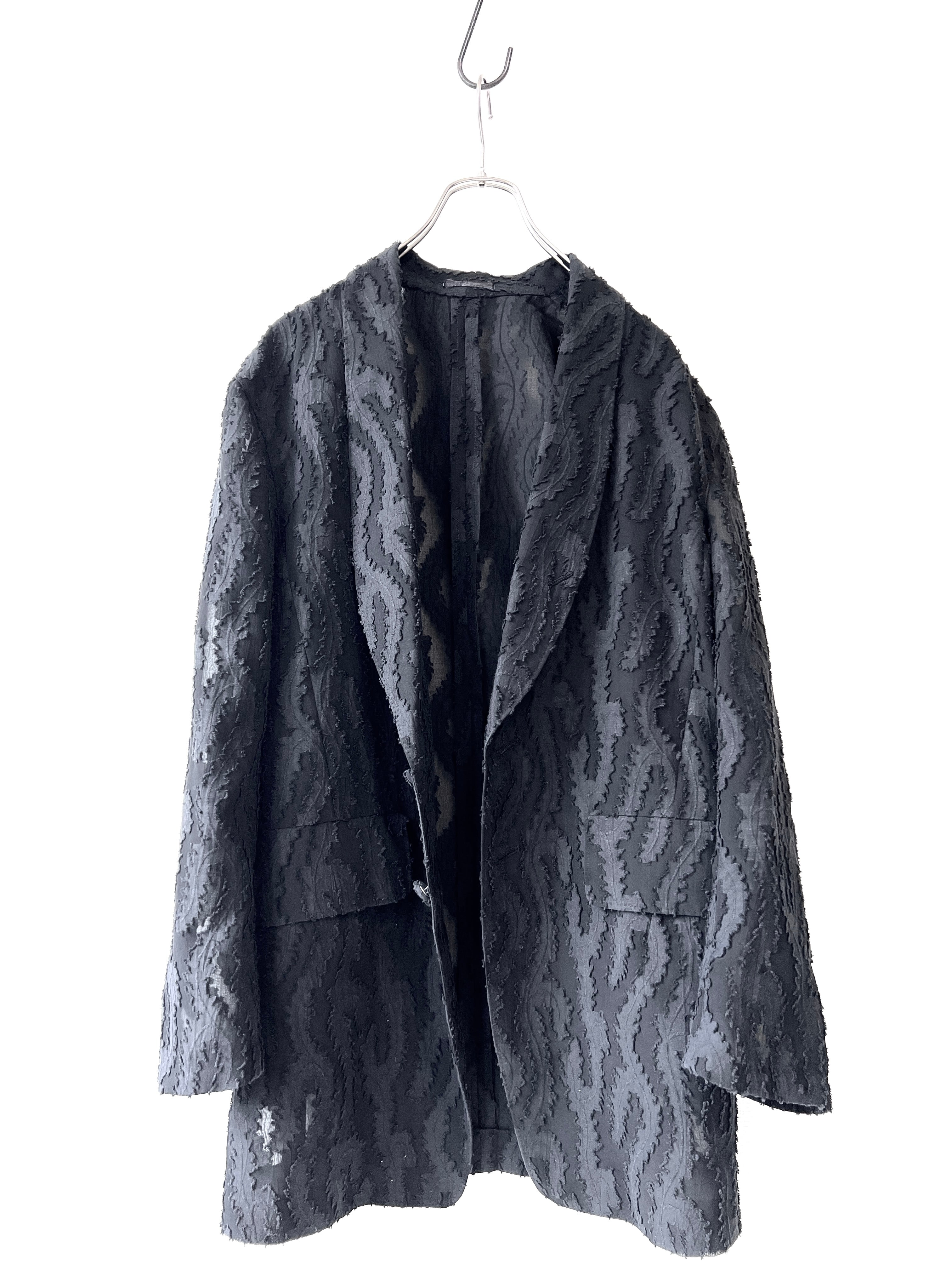 シックなジャガード織と緩やかな曲線が上品なショールカラージャケット。