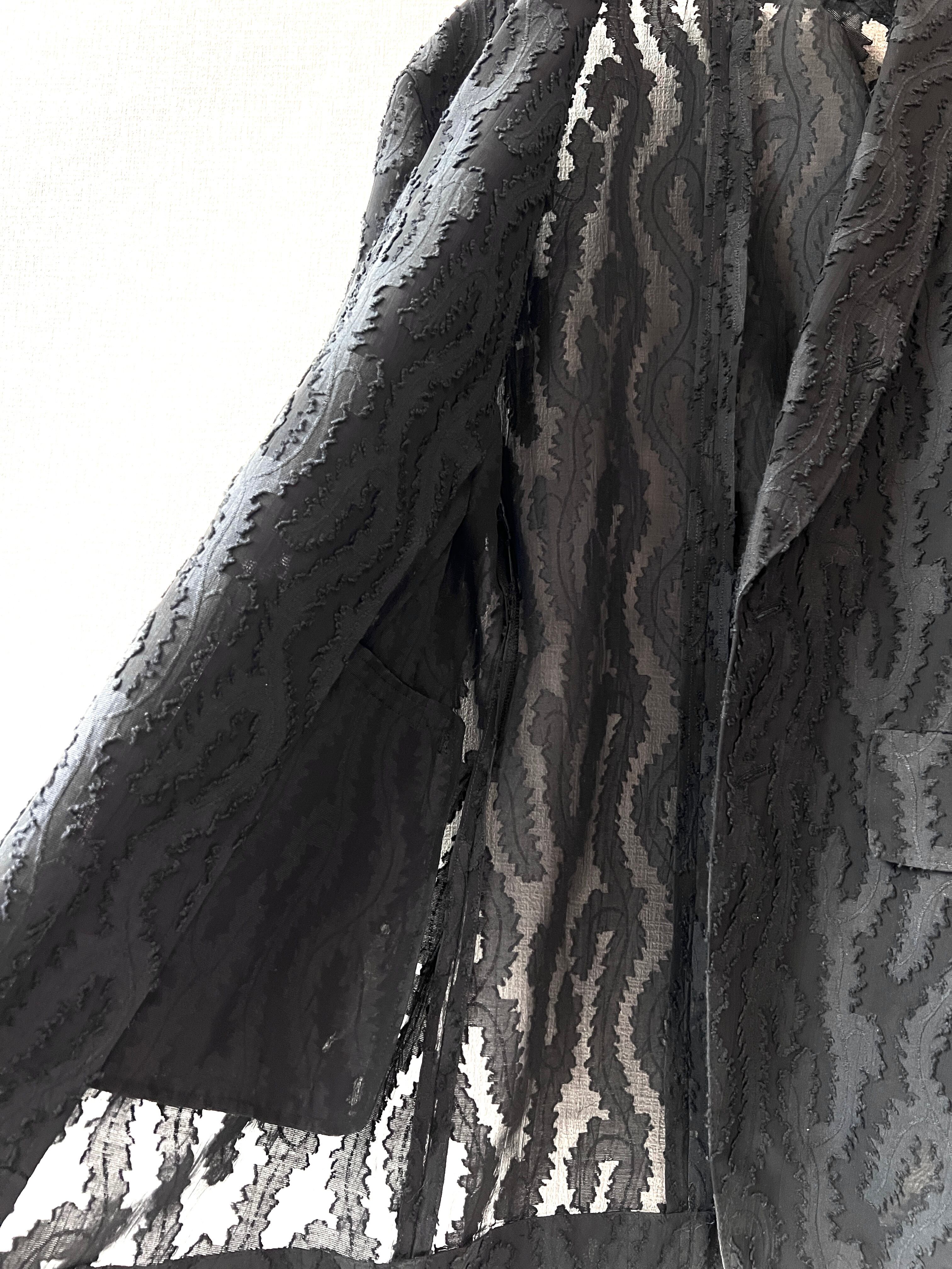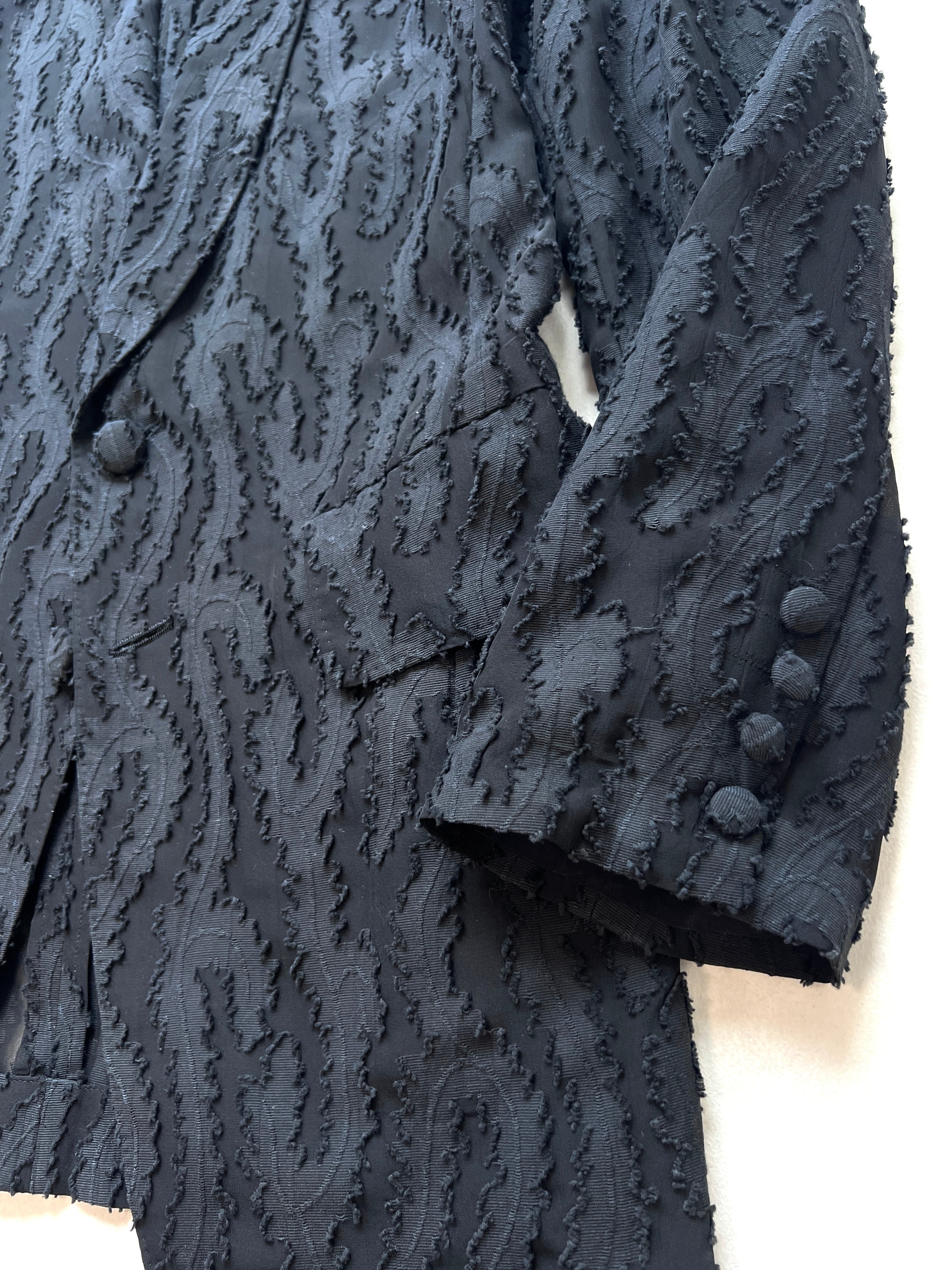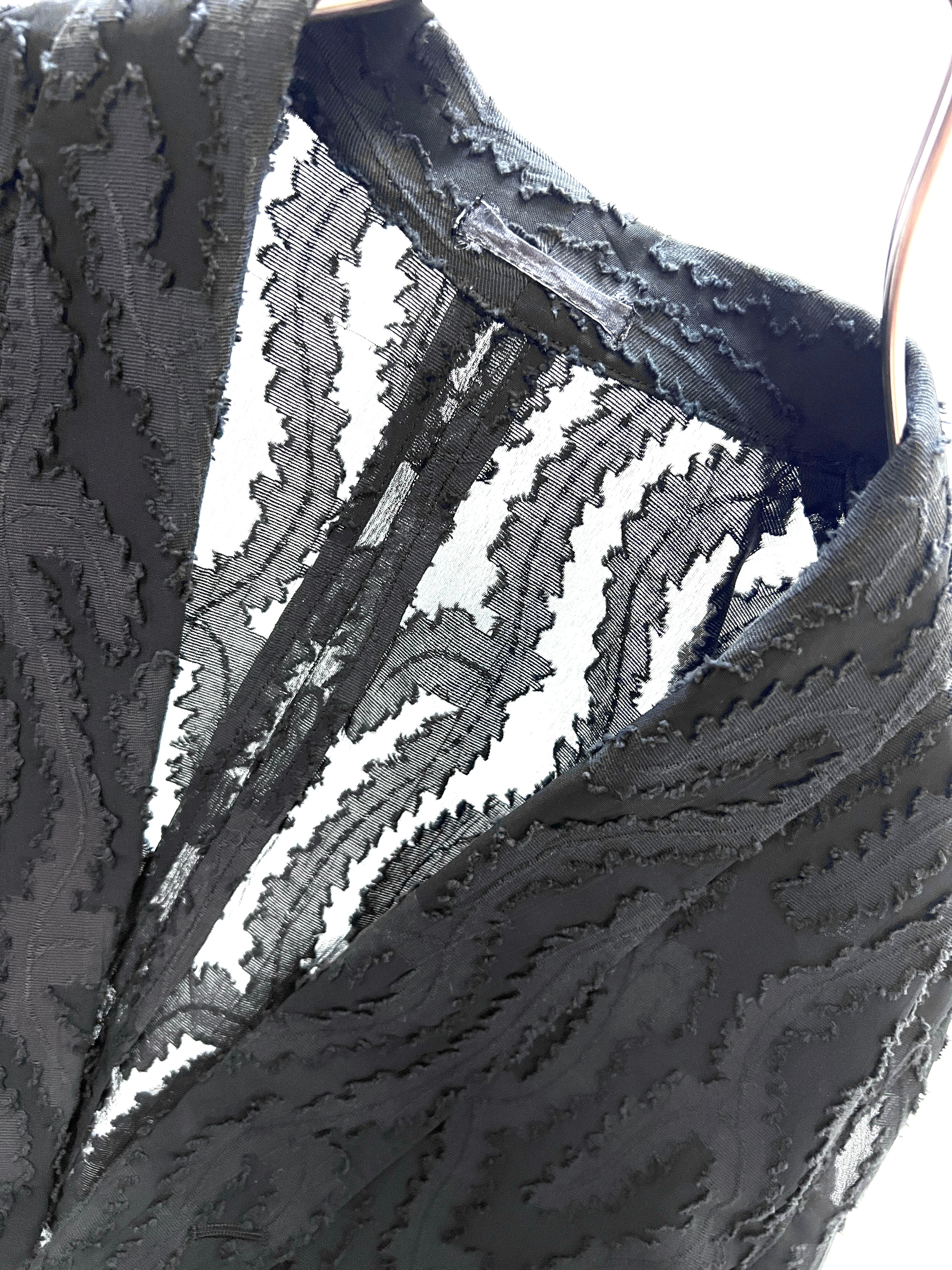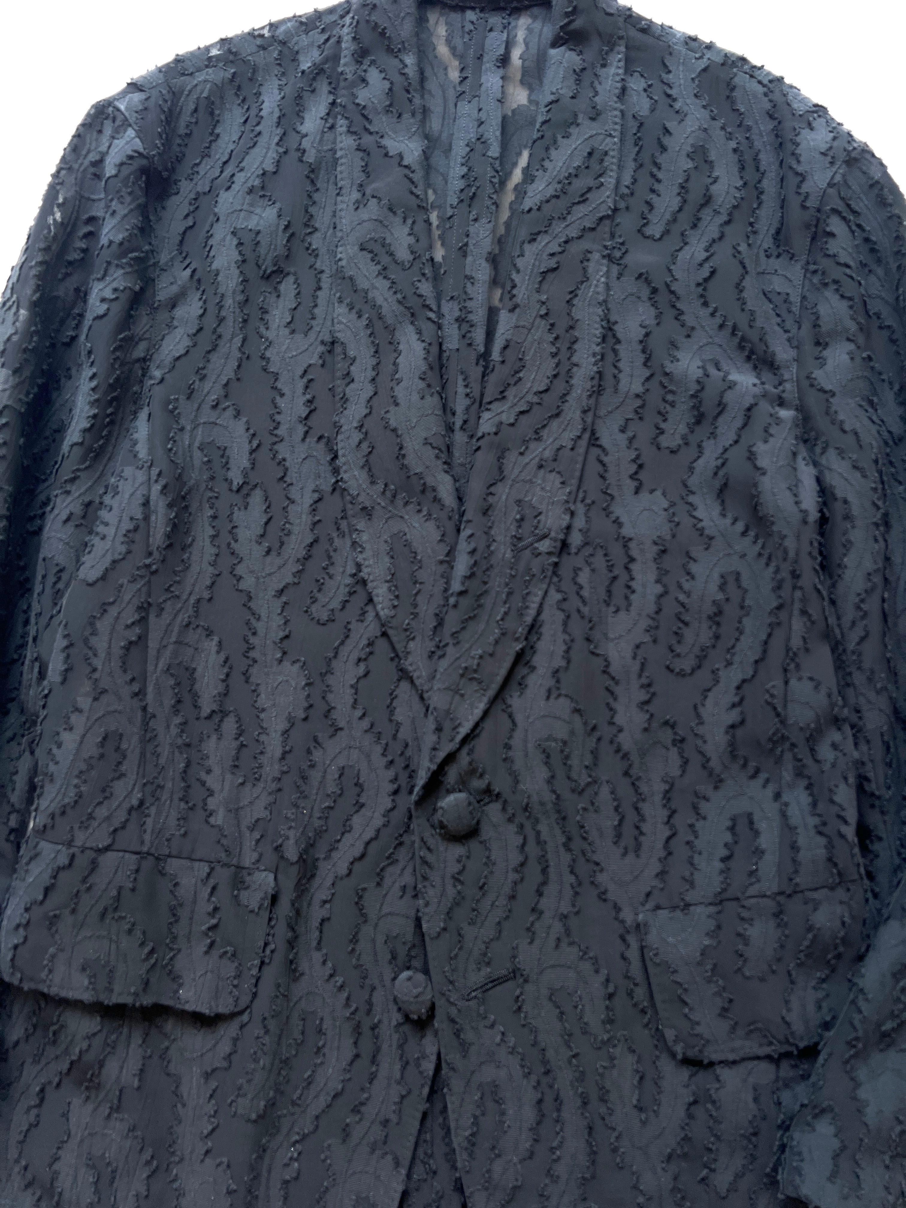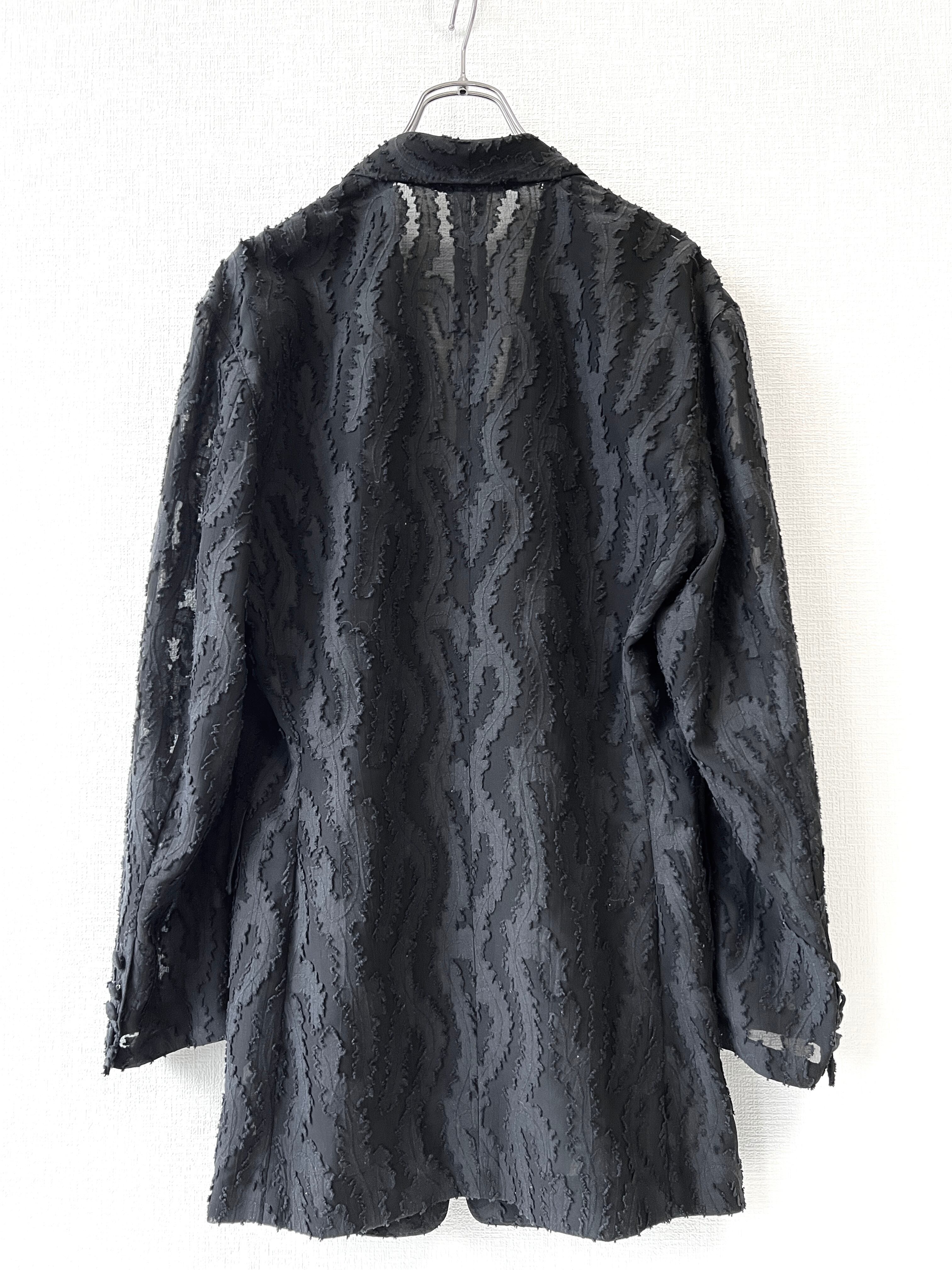 シックなジャガード織と緩やかな曲線が上品なショールカラージャケット。