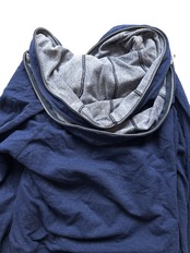 中央のメインジップはフードまでつながっています。さらに両胸からフードにもジップが施されており、開閉の仕方によってフードのレイヤードも可能です。