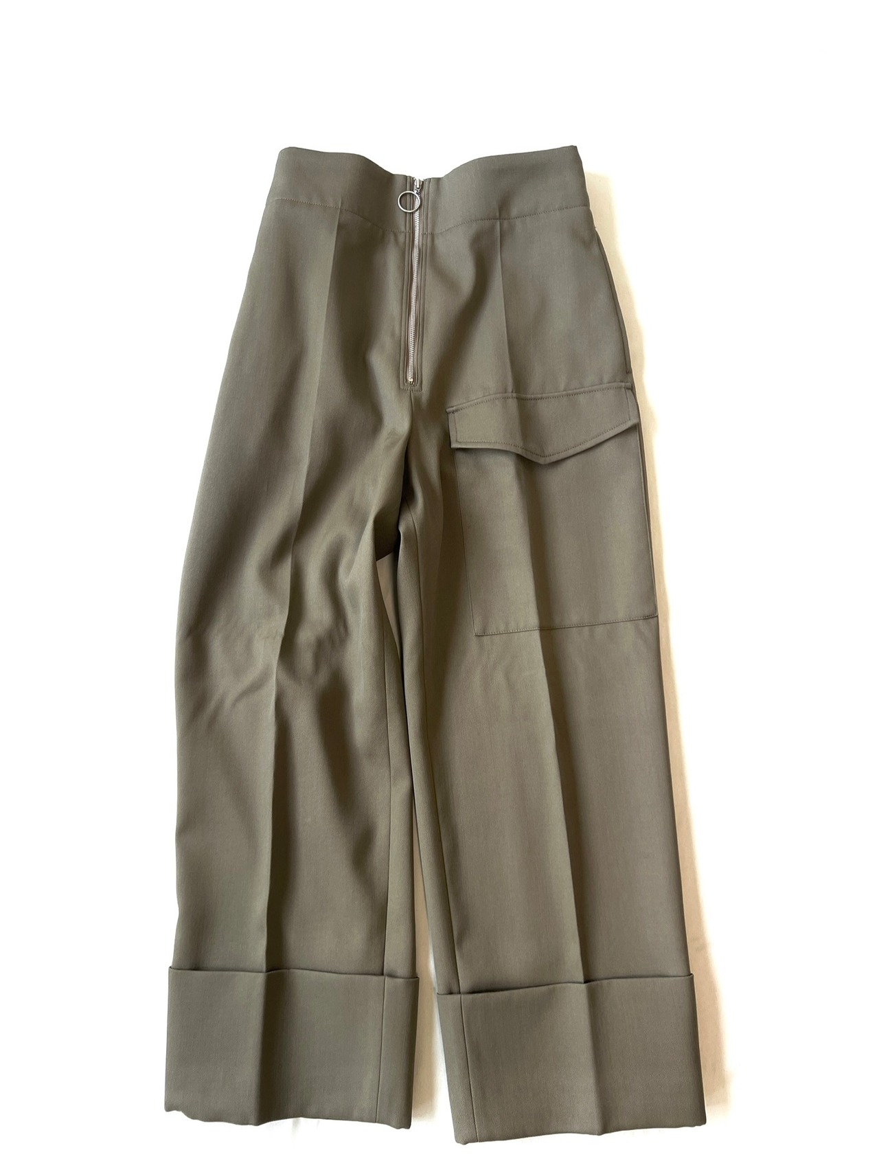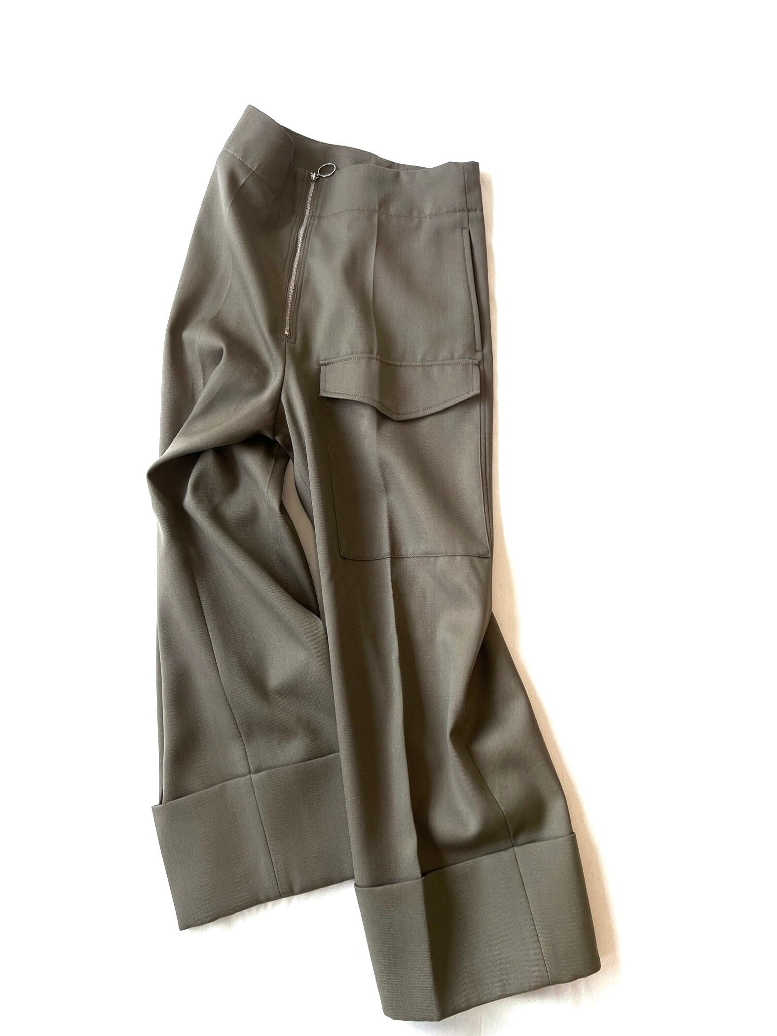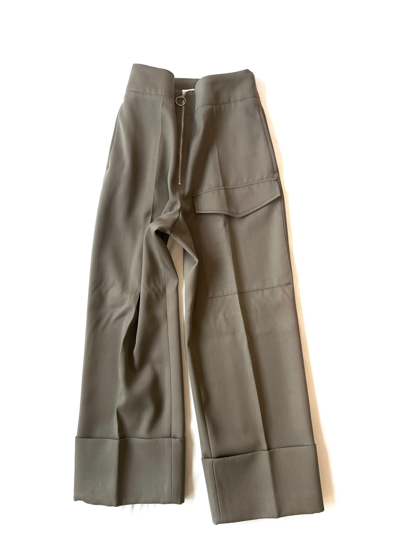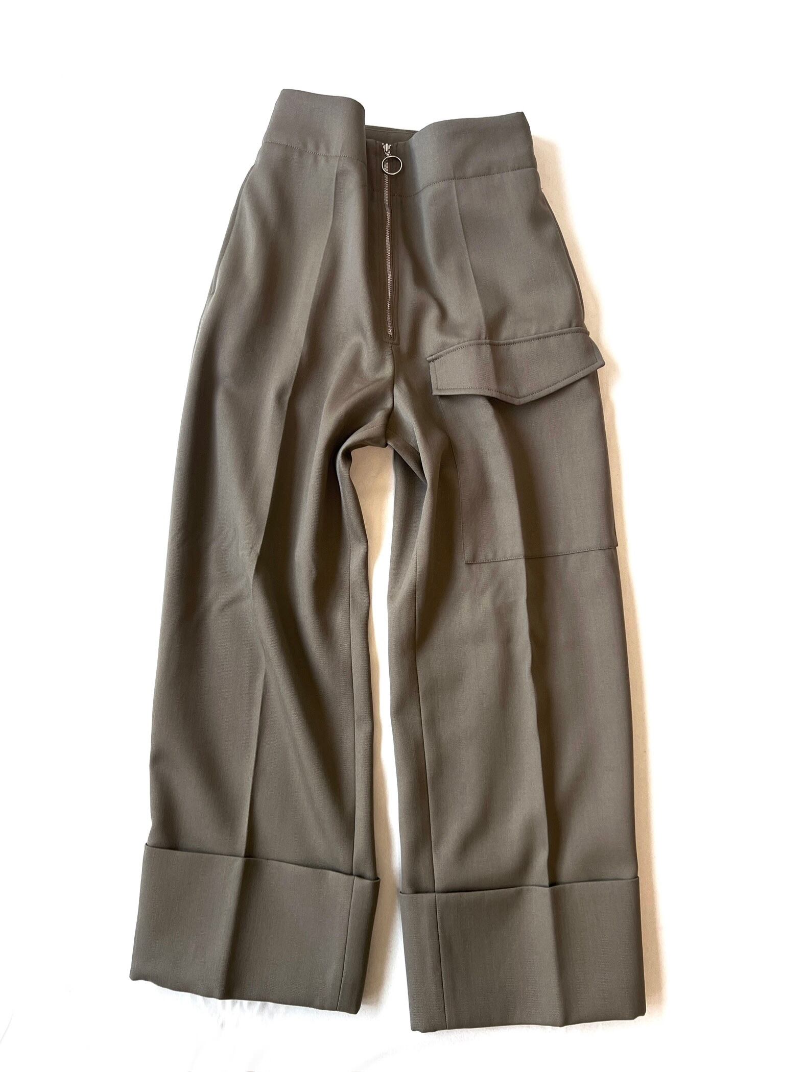 フロントのジップと幅広に折り返したダブル仕上げの裾がポイントのミリタリーテイストのパンツ。