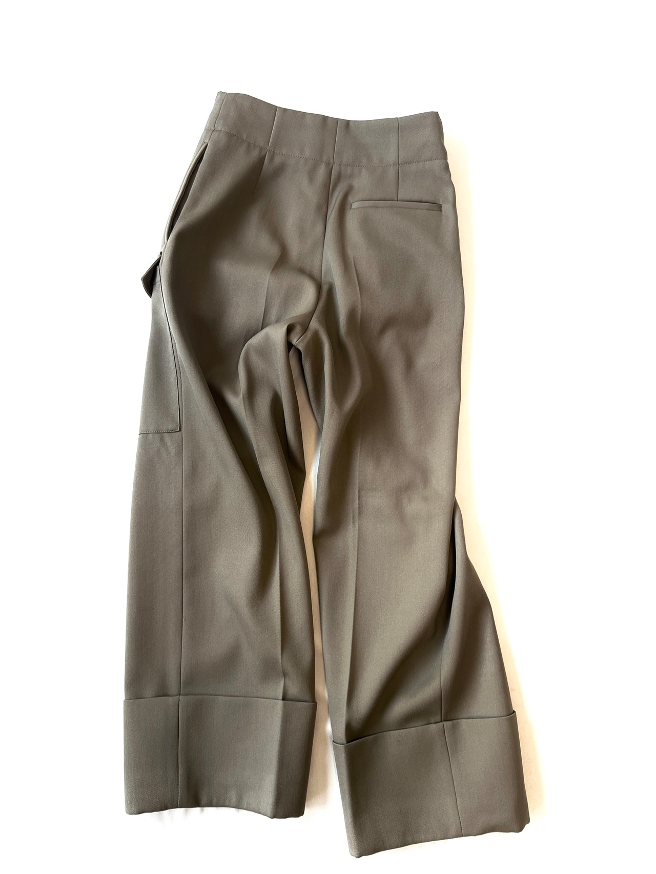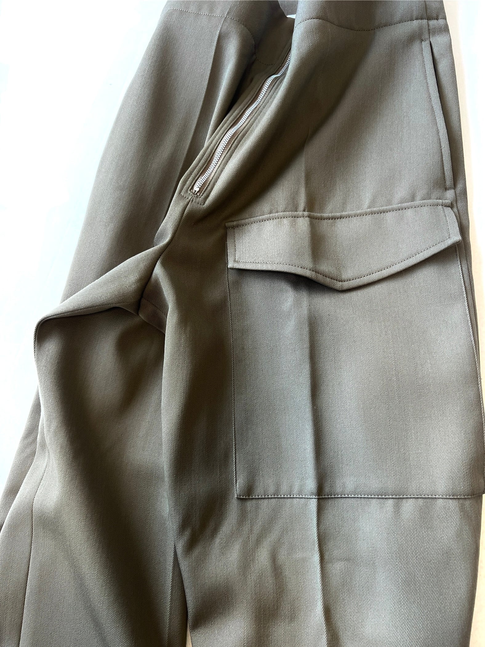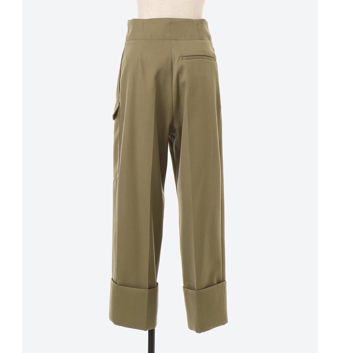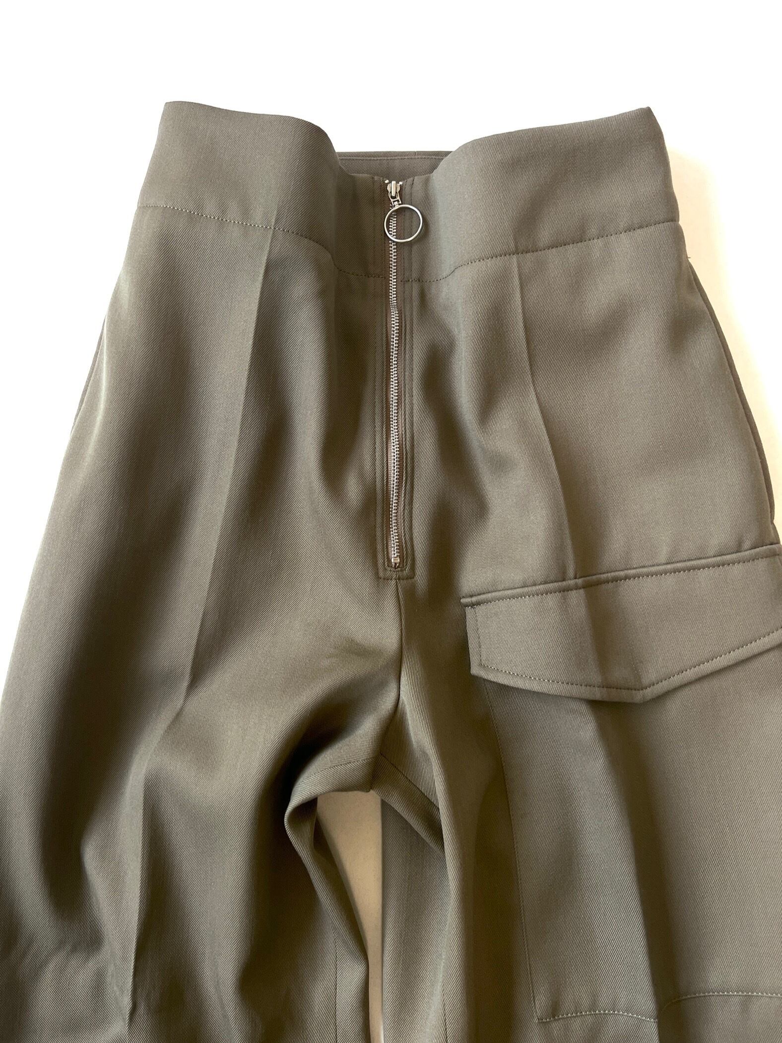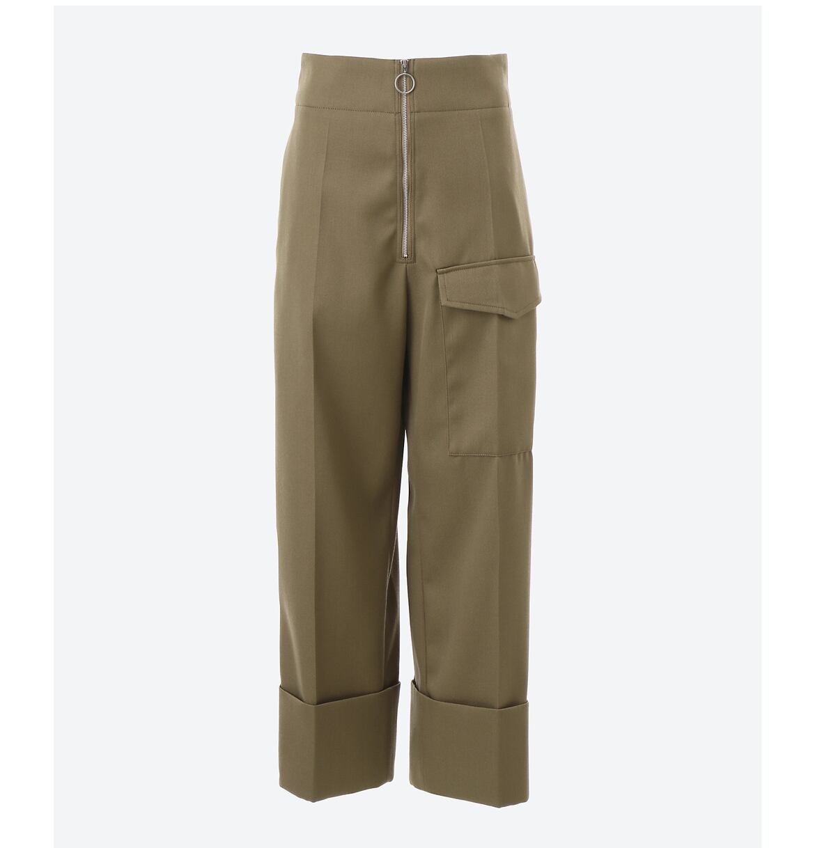 フロントのジップと幅広に折り返したダブル仕上げの裾がポイントのミリタリーテイストのパンツ。