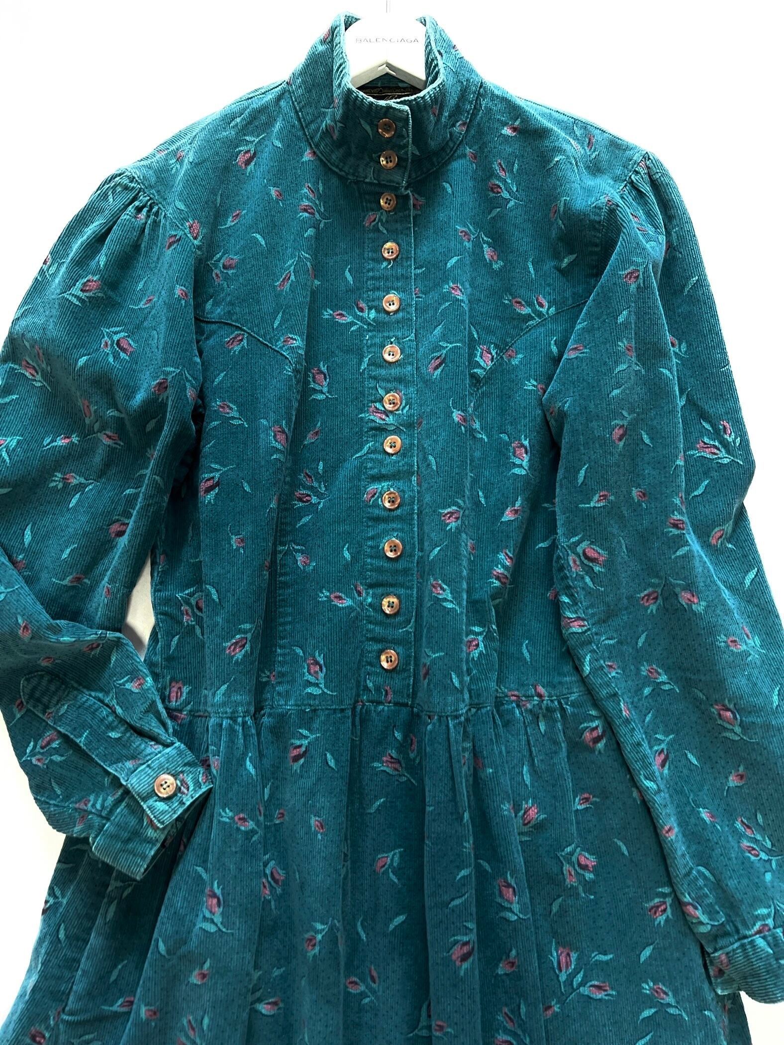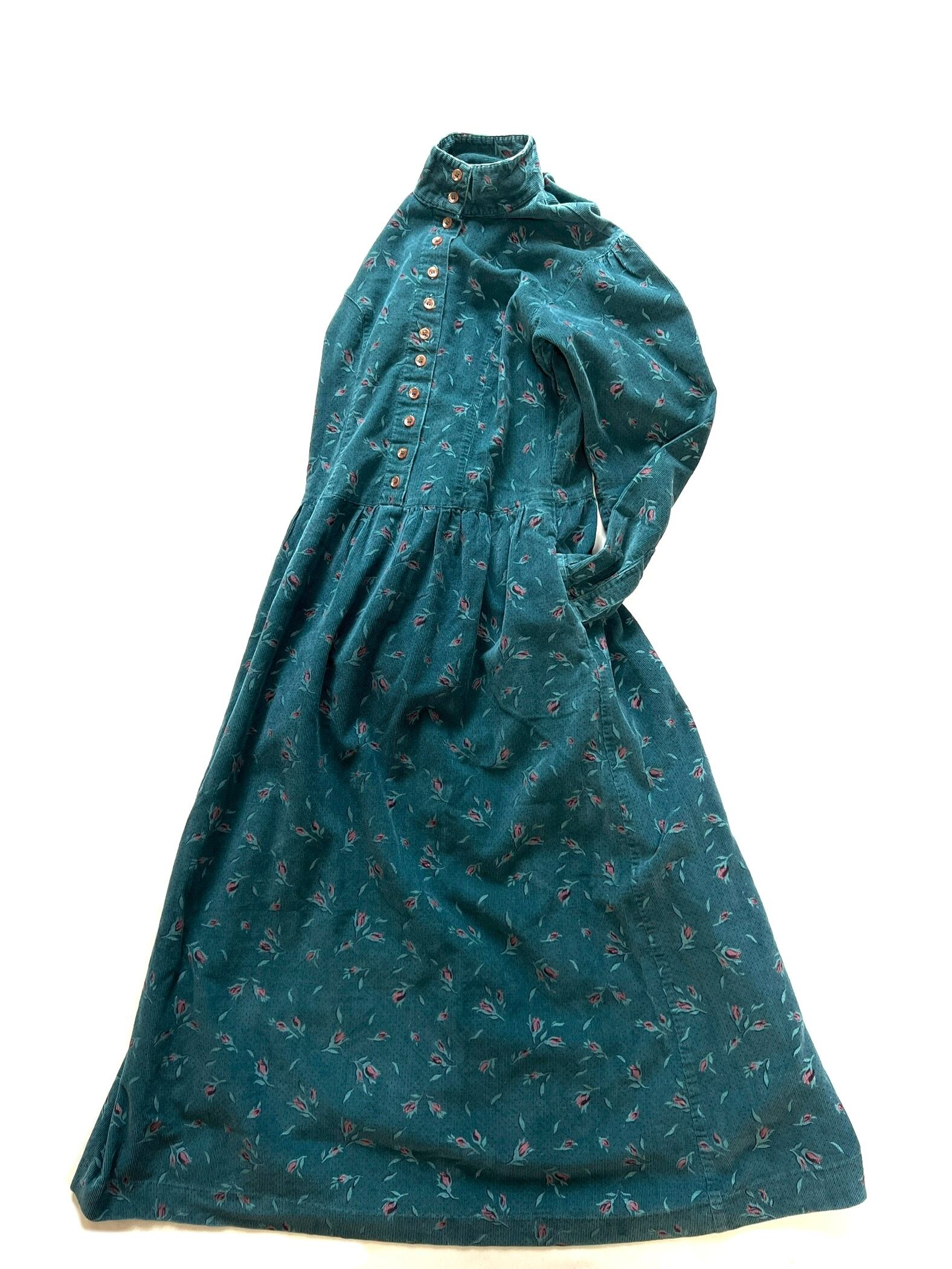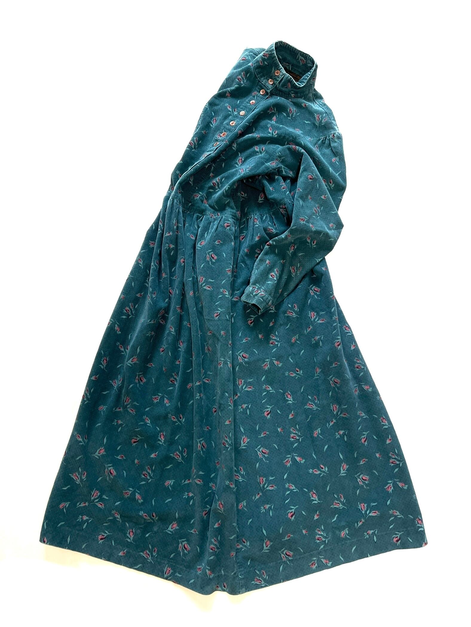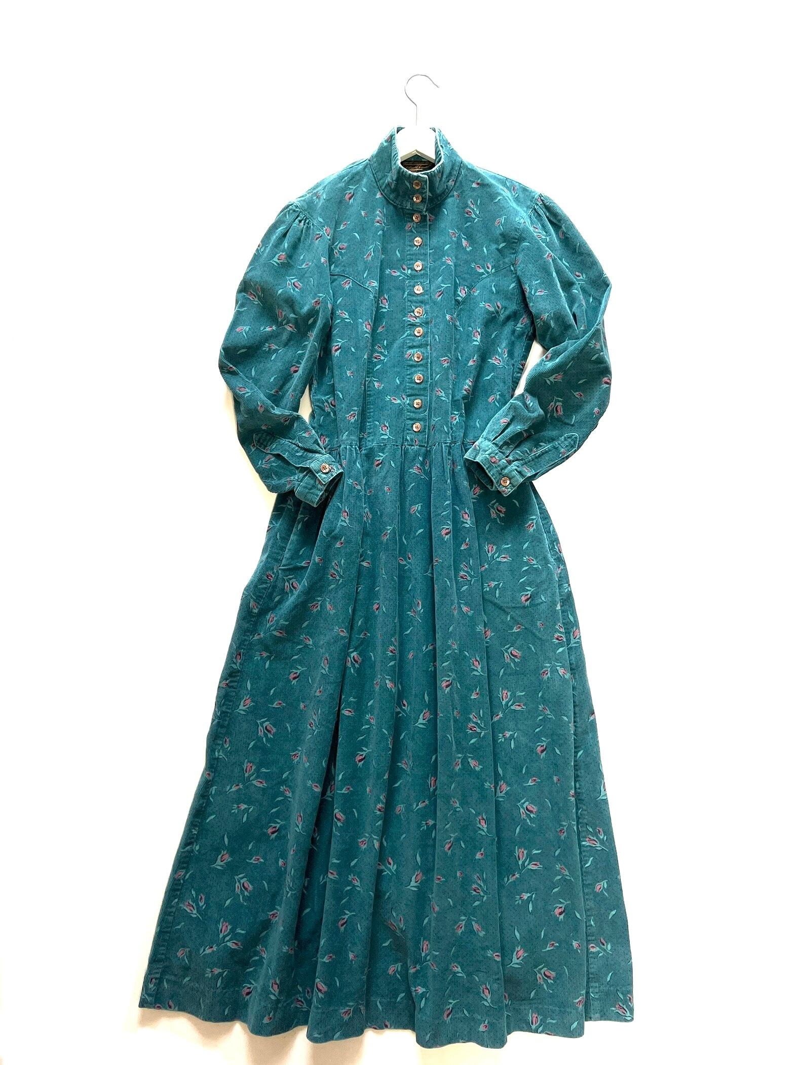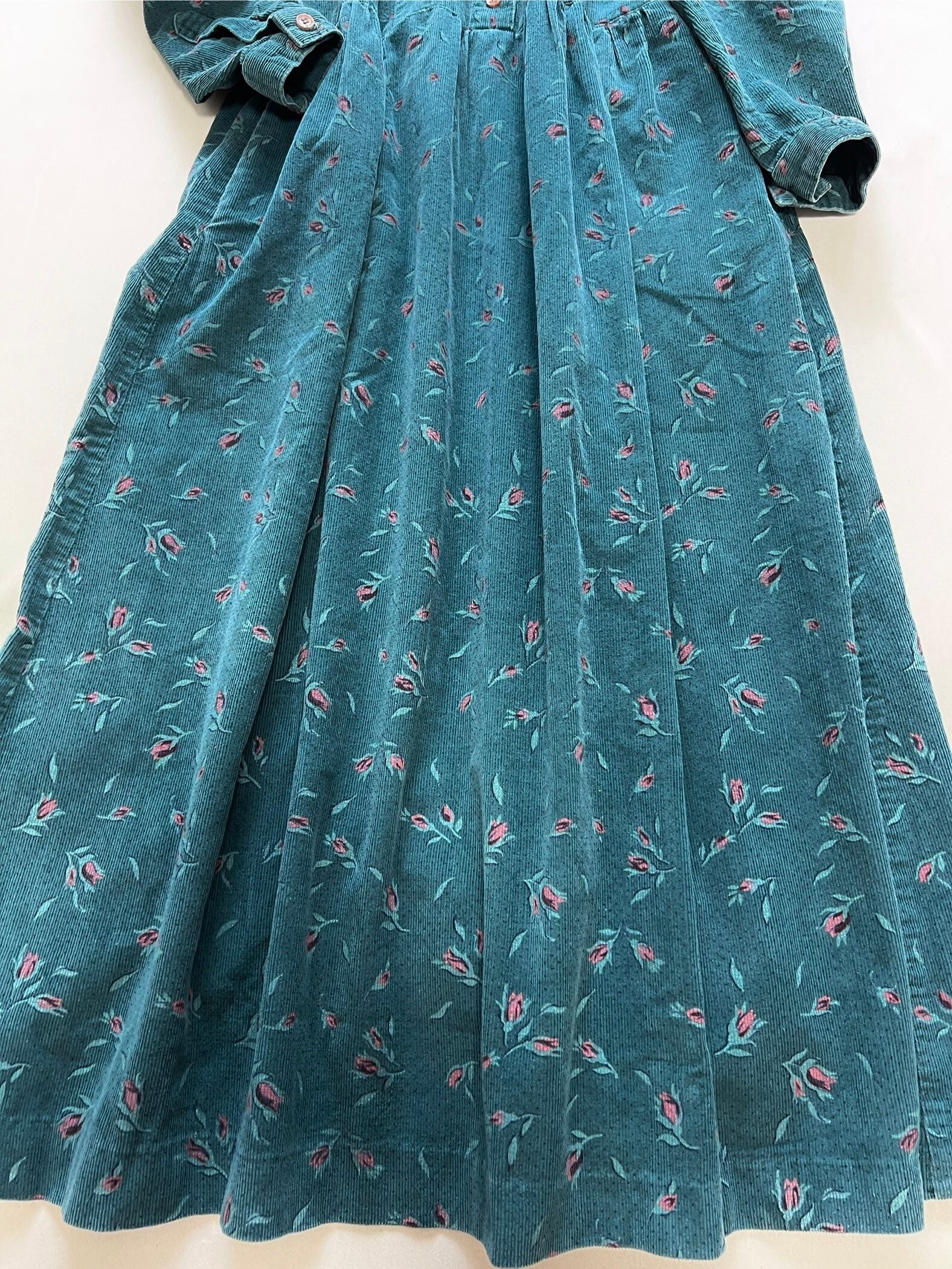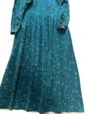柔らかなグリーンのコーデュロイ生地に、花が散りばめられた深い森の中を思わせるノスタルジックなワンピースです。