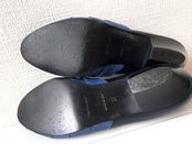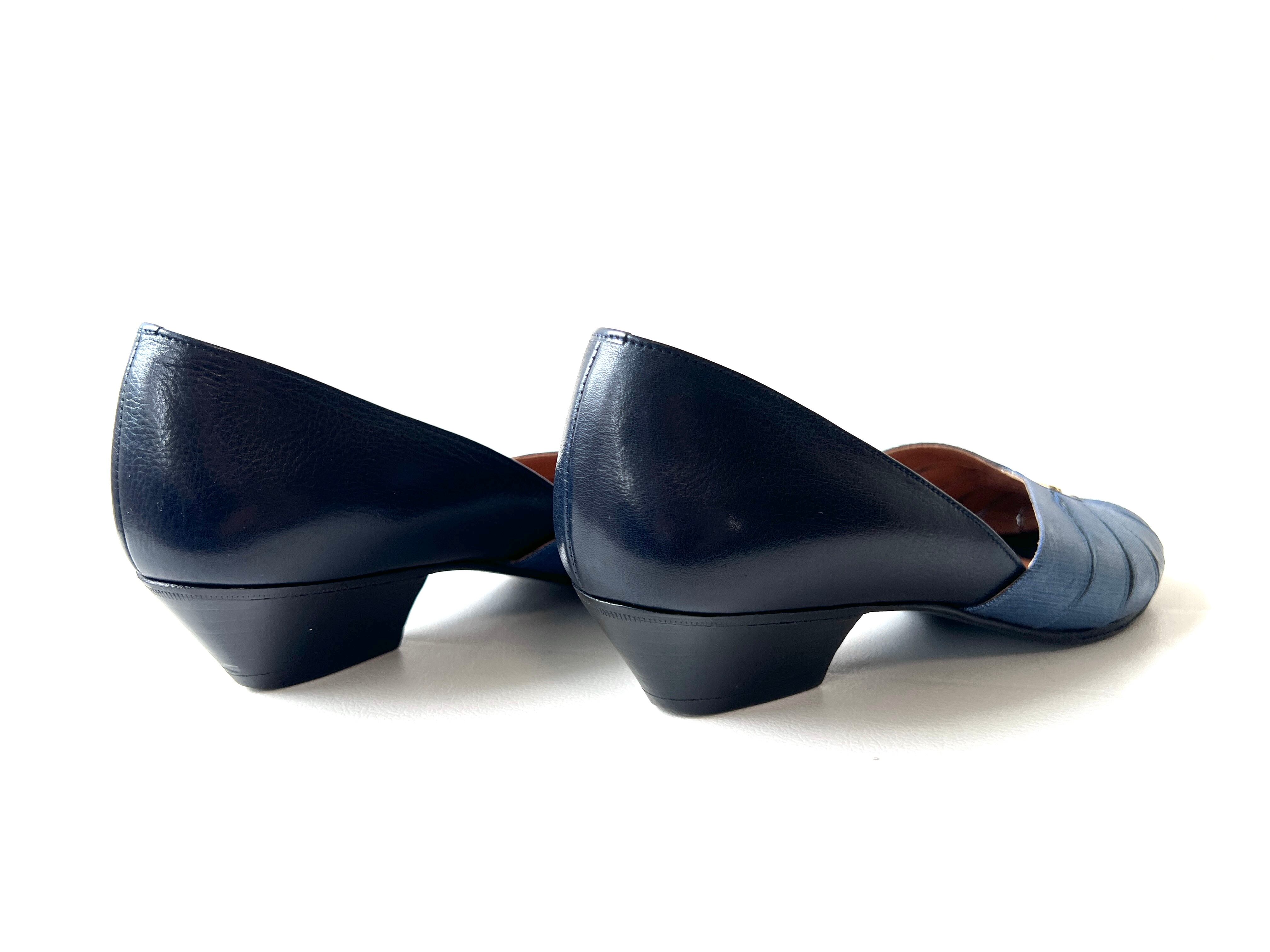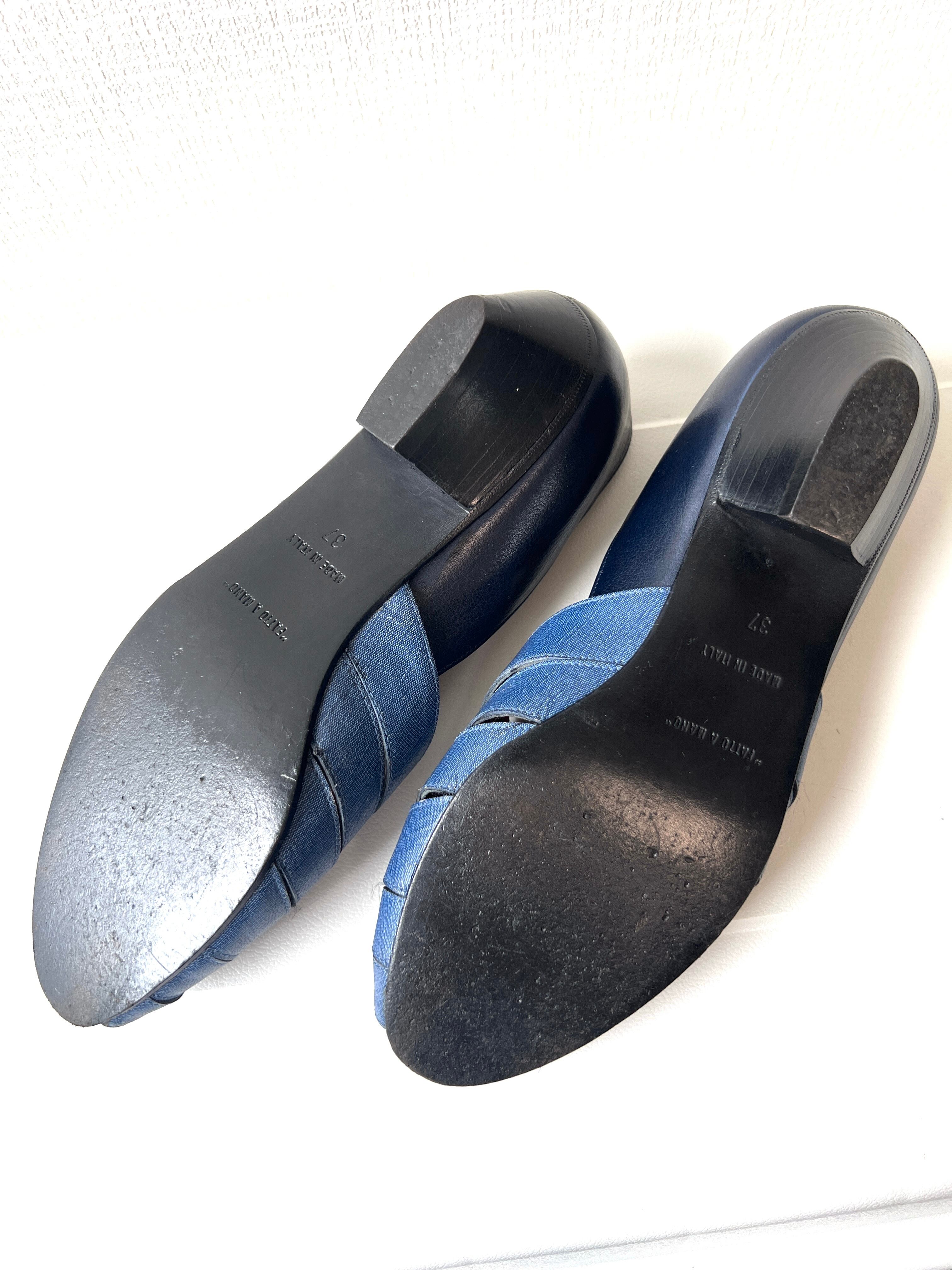 光沢を抑えたネイビーのレザーと、トウ部分の美しいカッティングが施されたファブリックが絶妙なコントラストを生み出しています。