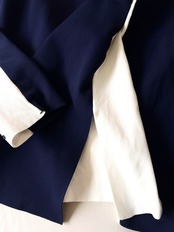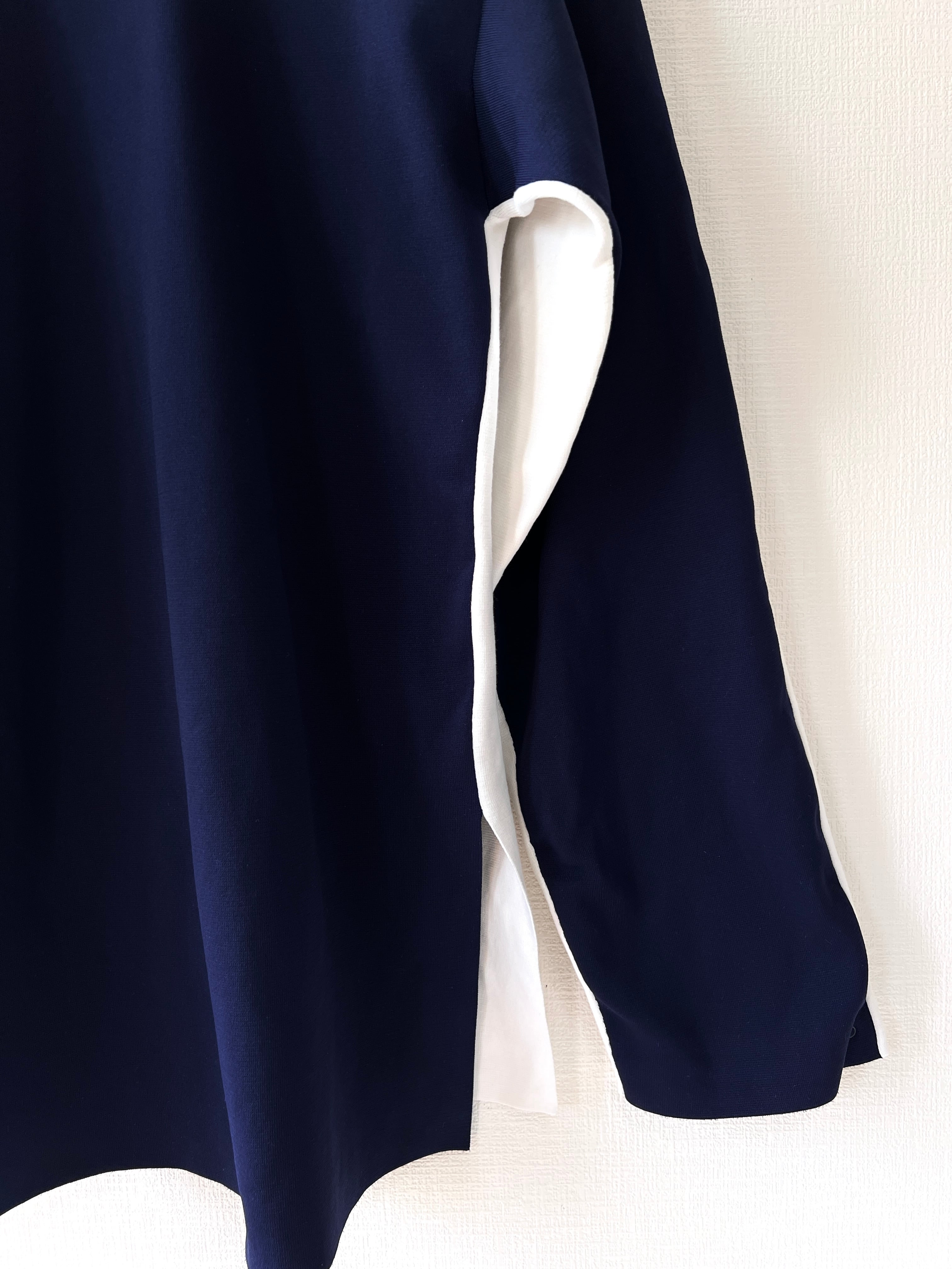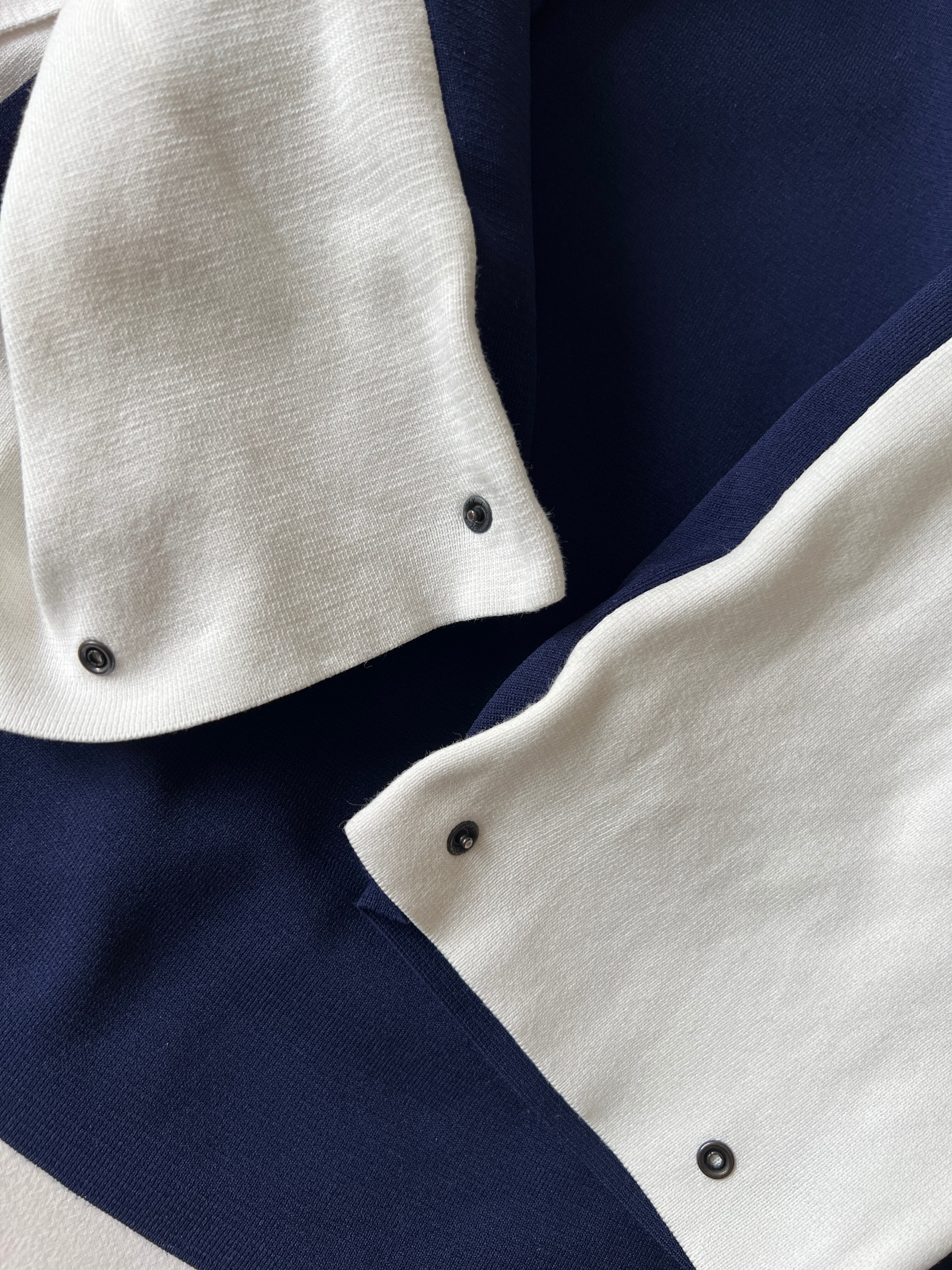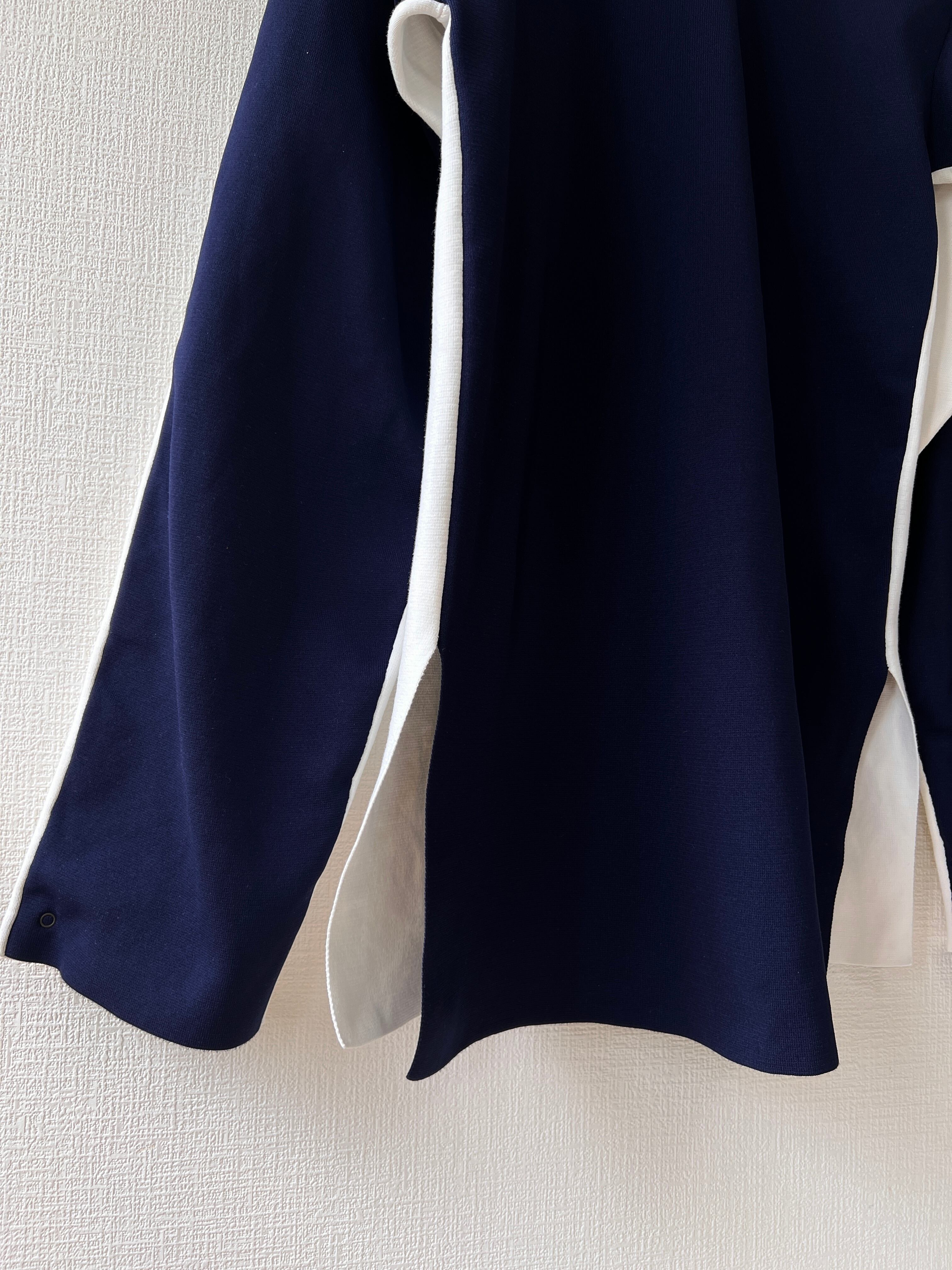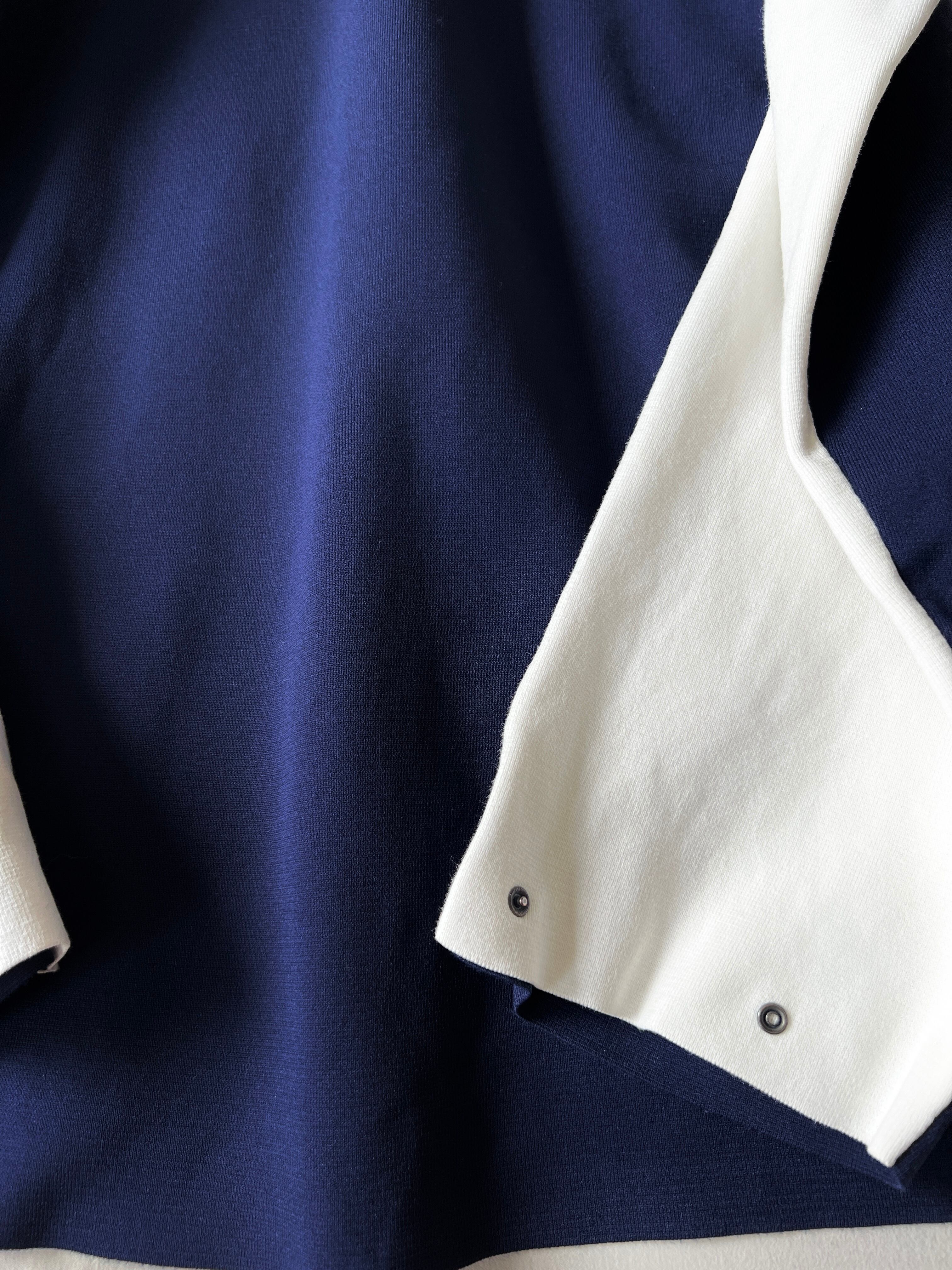 ワイド仕立ての袖は袖口にはスナップ留めが配され、シルエットの調整を可能にすると同時に、控えめなアクセントとして機能しています。