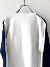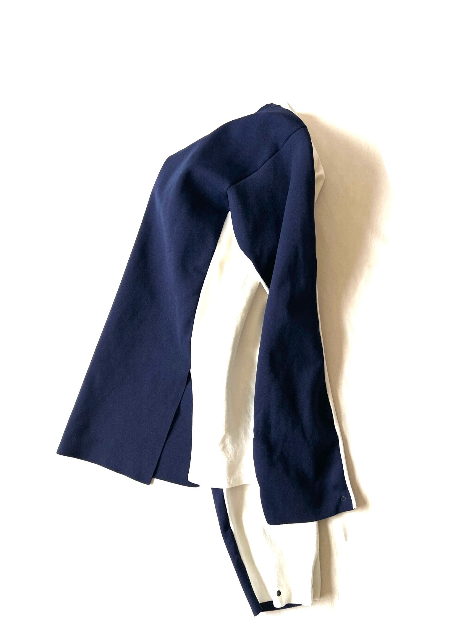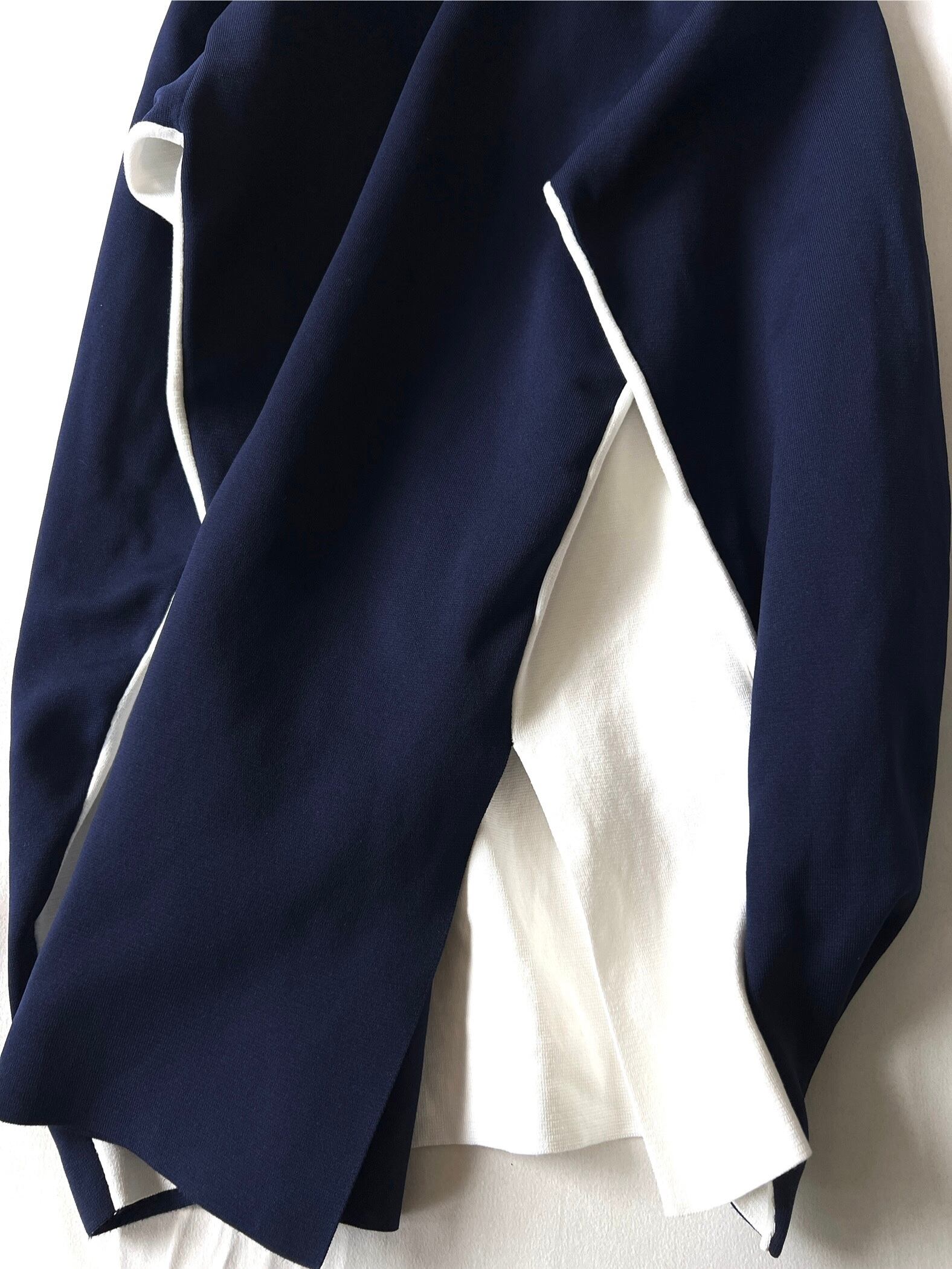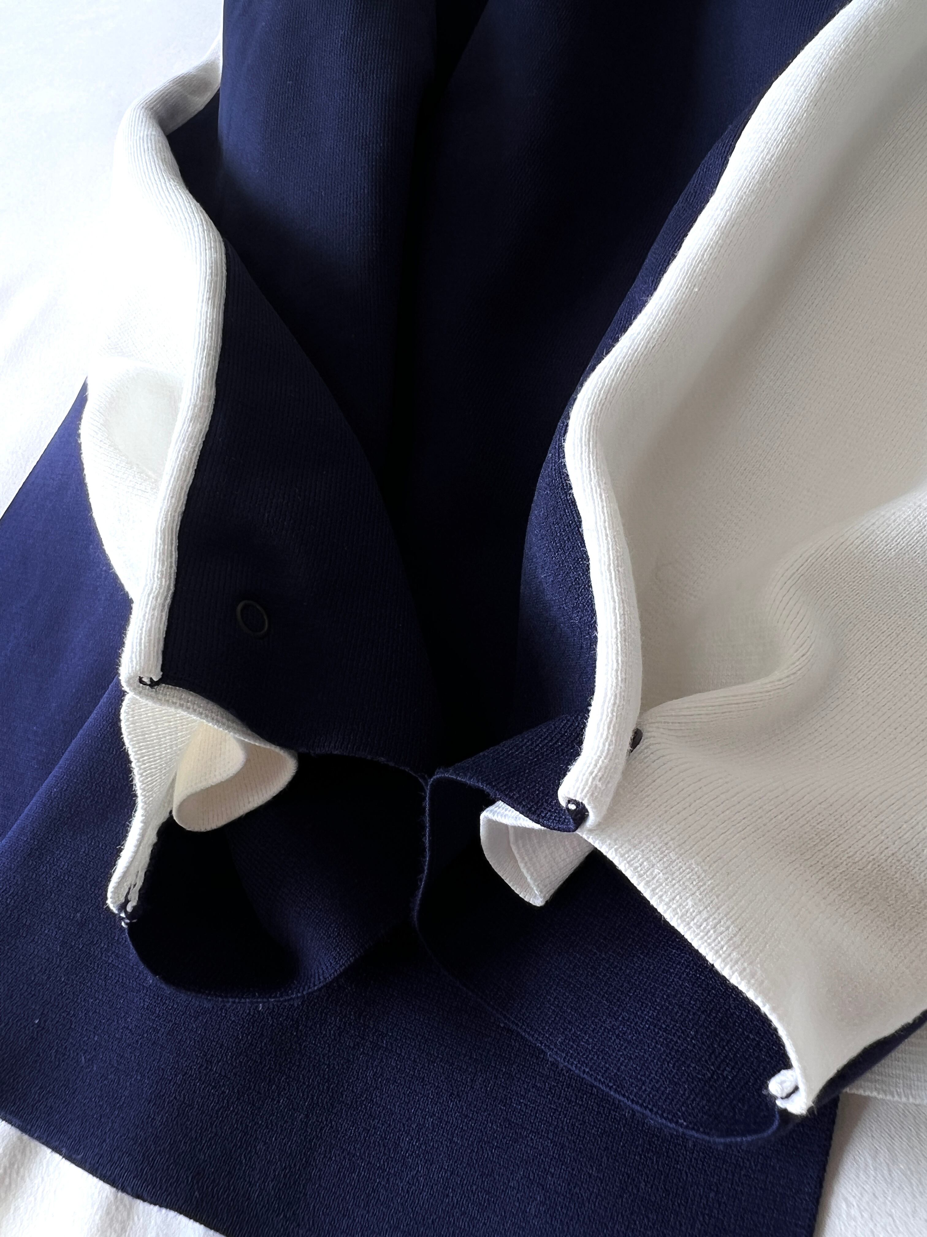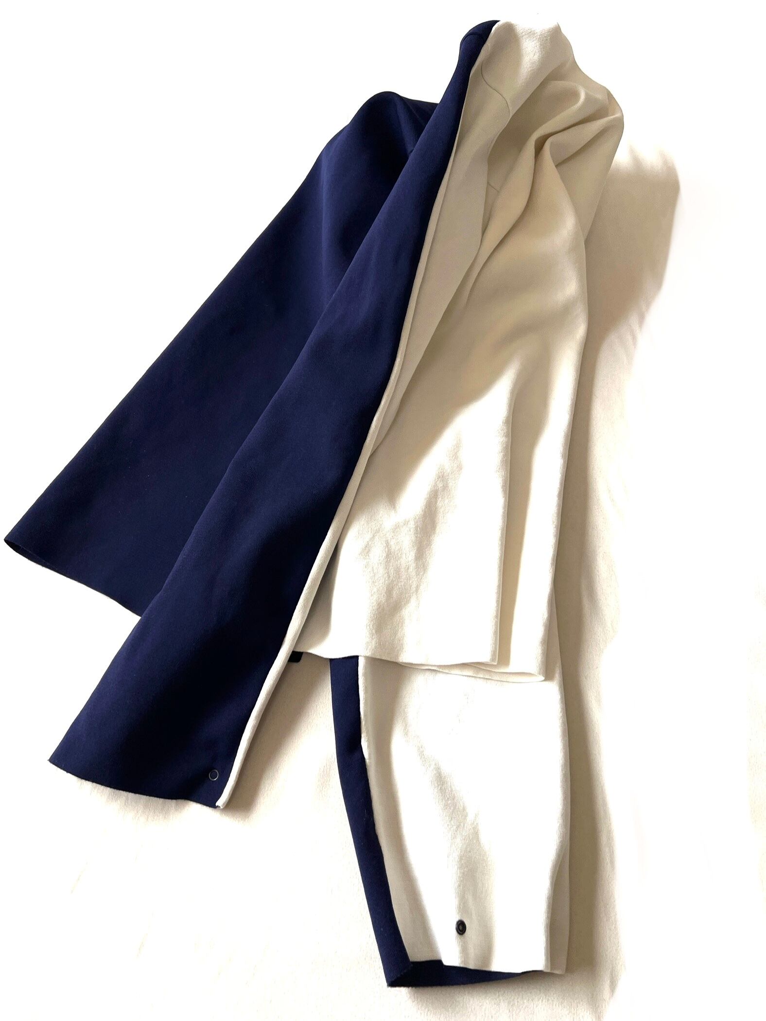 ワイド仕立ての袖は袖口にはスナップ留めが配され、シルエットの調整を可能にすると同時に、控えめなアクセントとして機能しています。