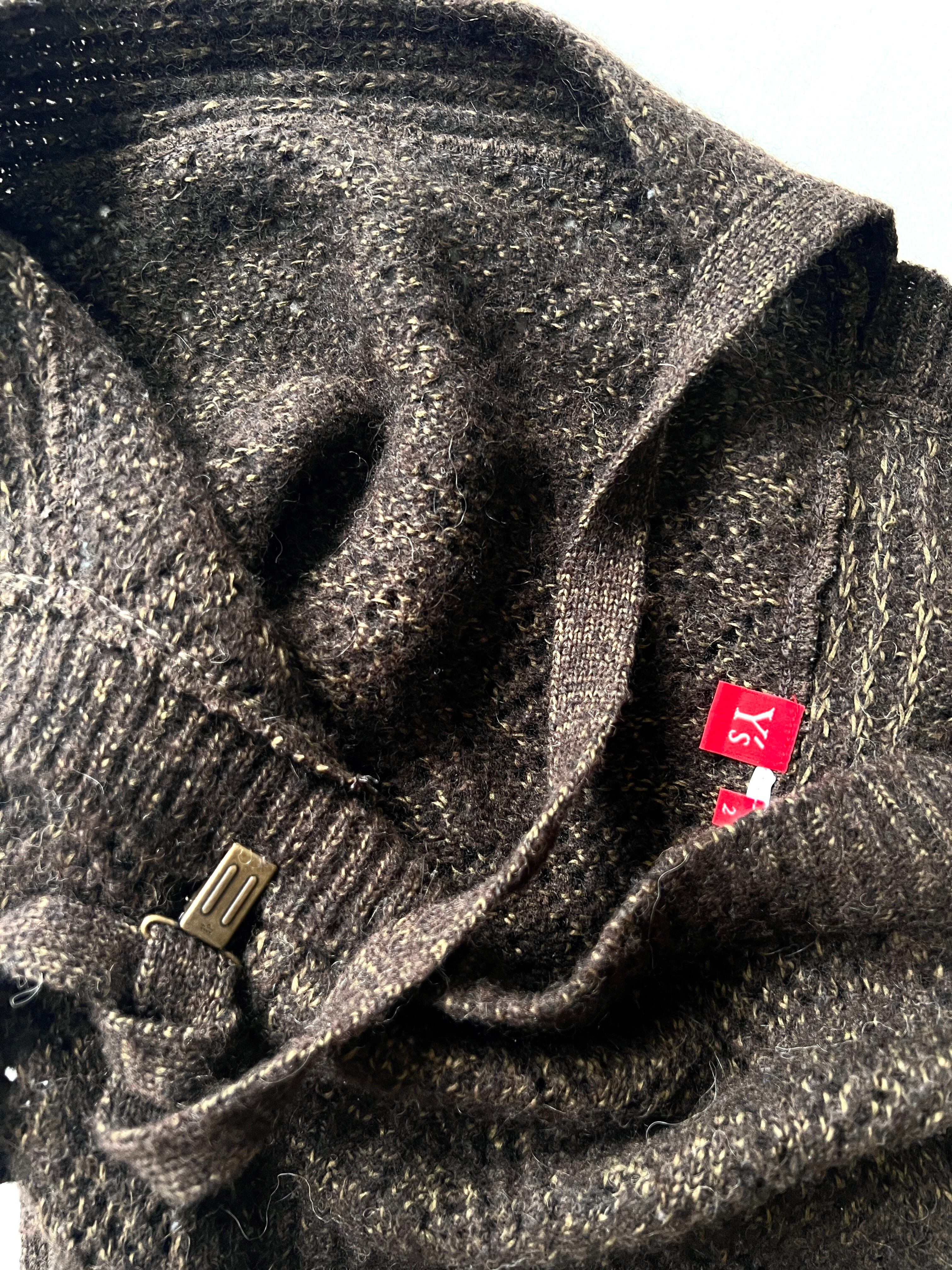 立体的なニッティングによる編み地が豊かな表情を生み出し、時間を経てさらに深みを増したウール素材の質感、風合いが際立っています。