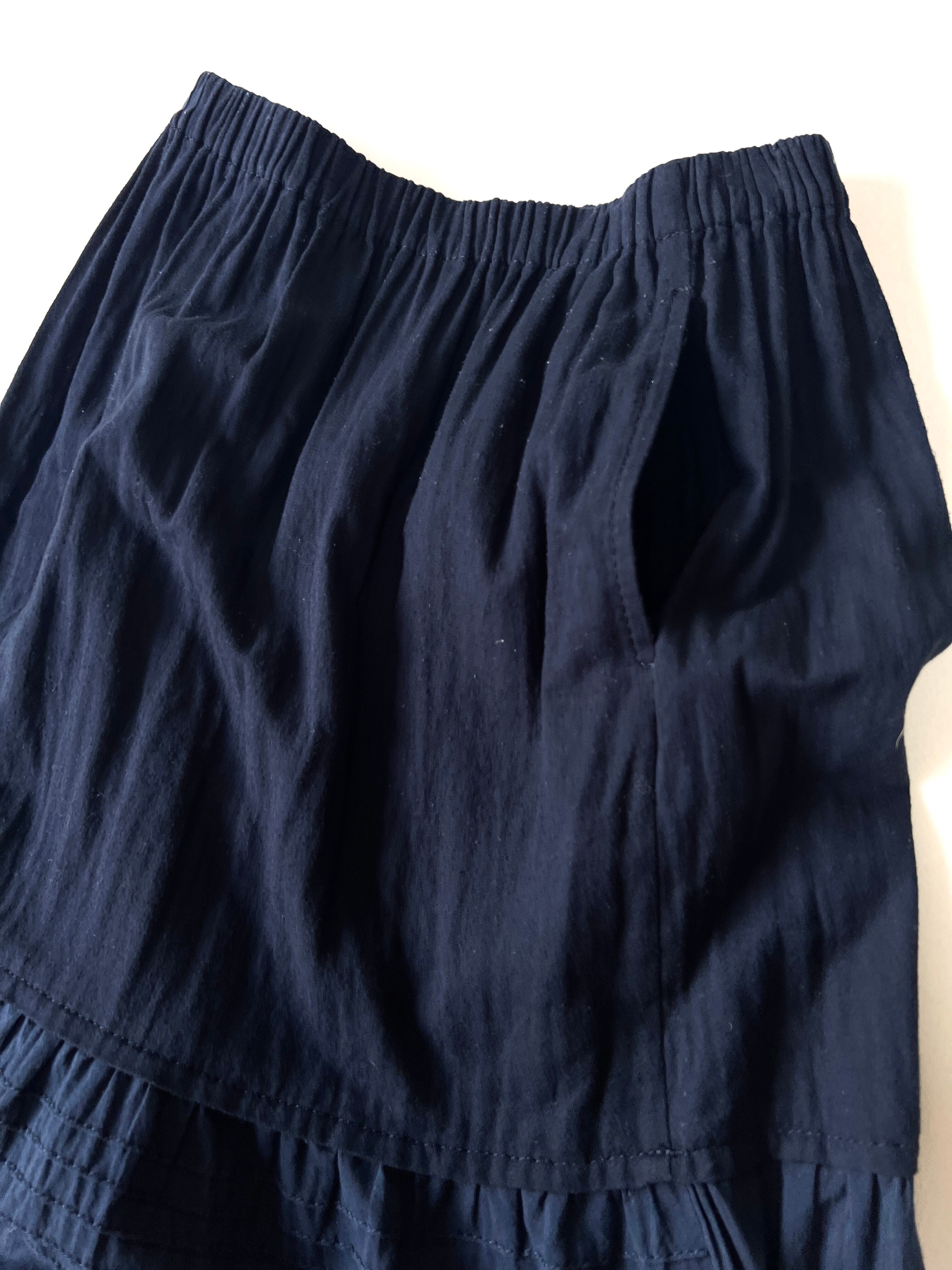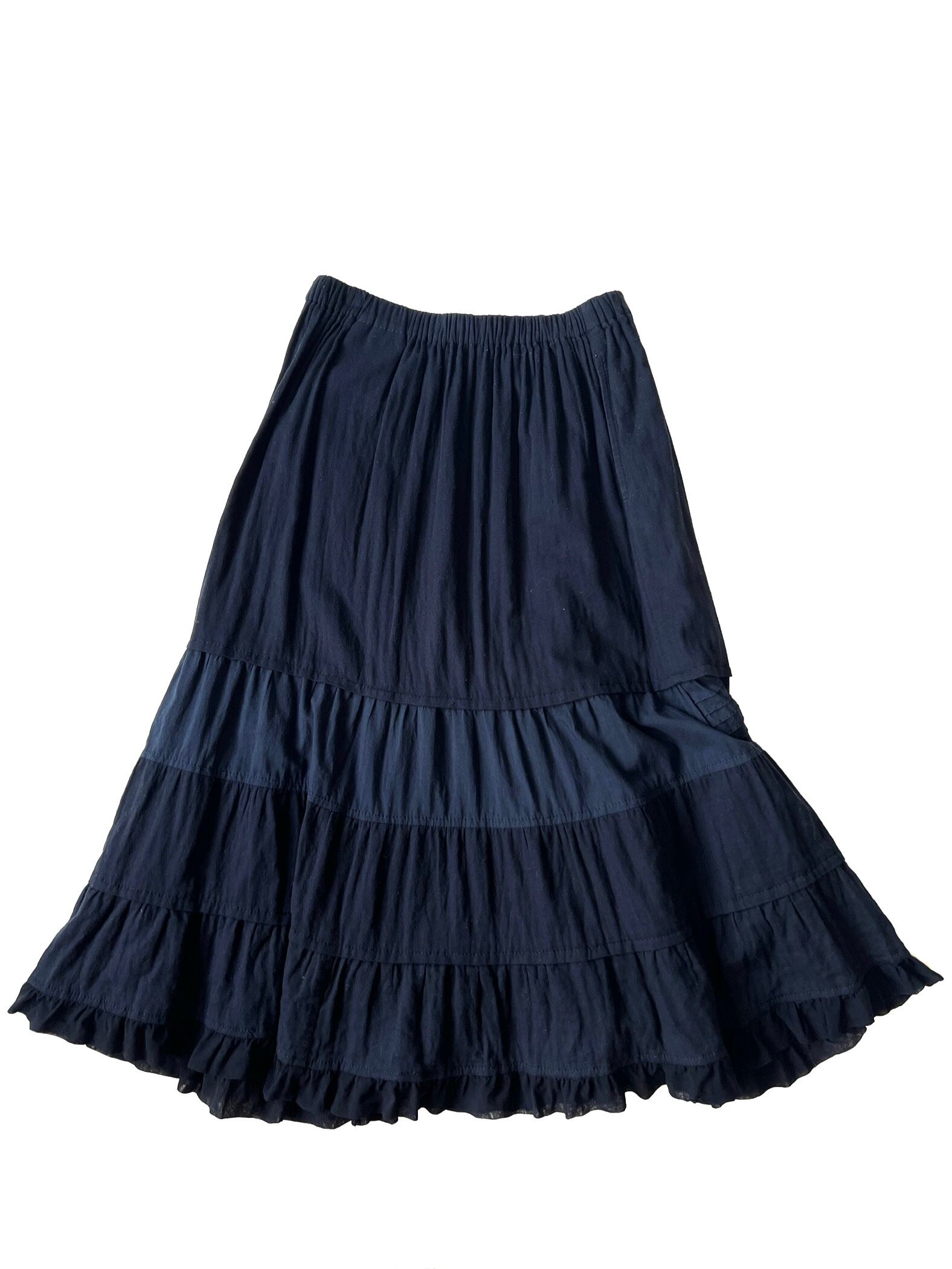両サイドにはシームポケット、ウエストは総ゴム仕様でリラックス感がありながらも、裾にかけて広がる幾重にも重ねられたフリルとティアードデザインが、歩くたびに軽やかでドラマティックな動きを生み出してくれます。