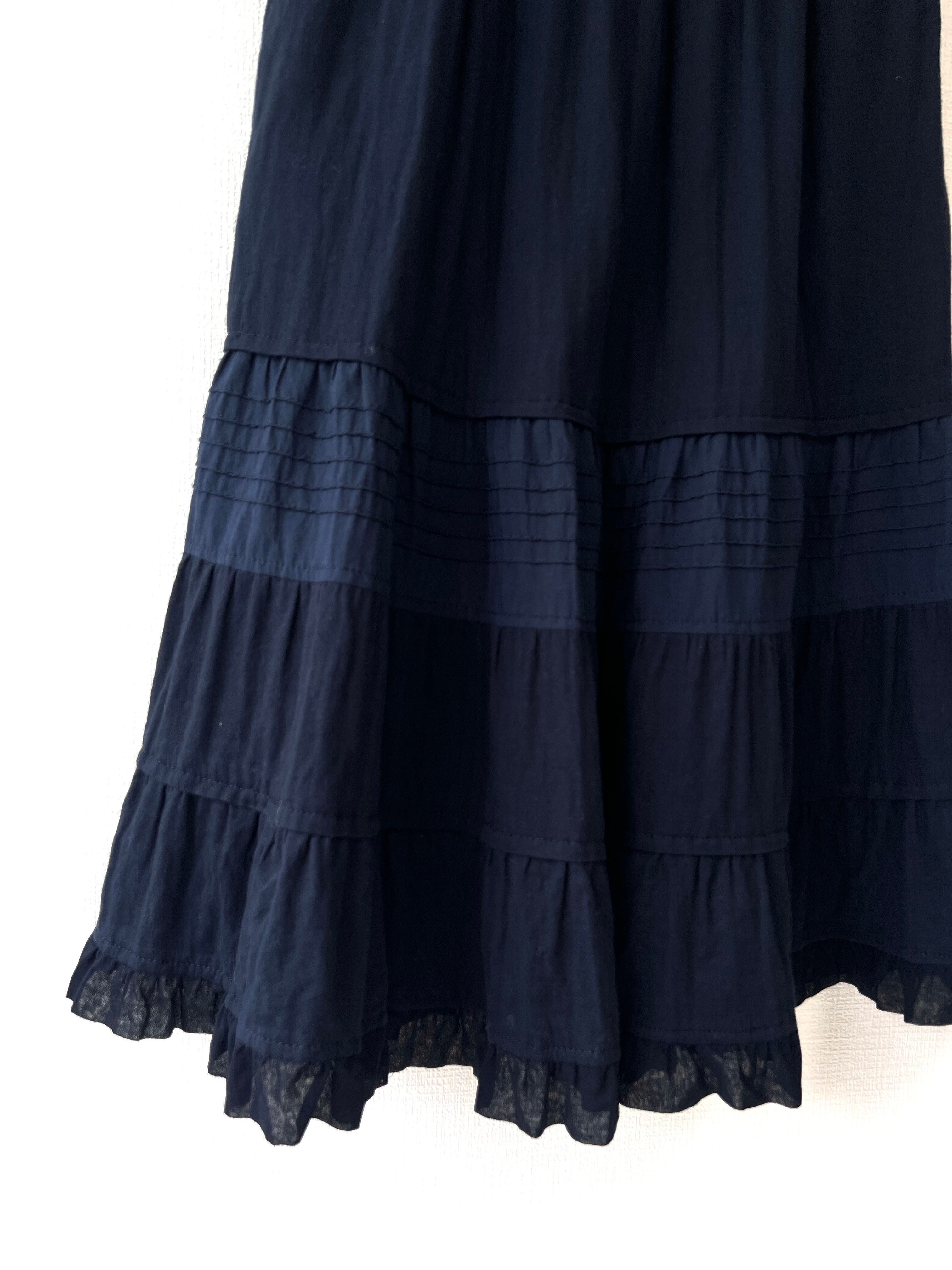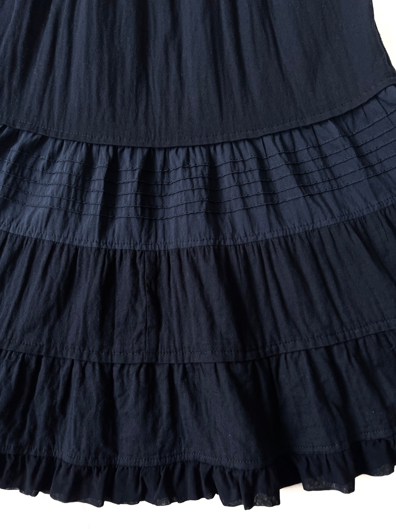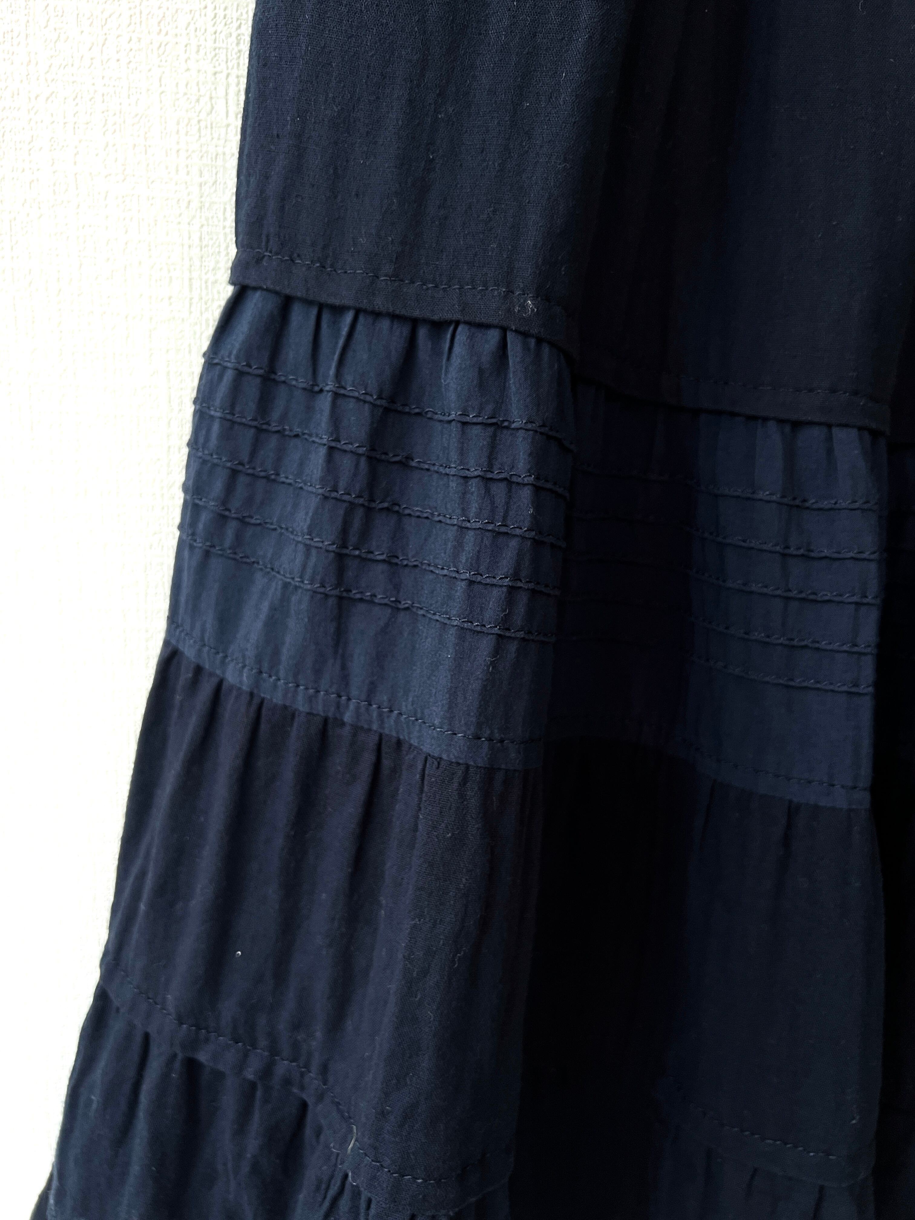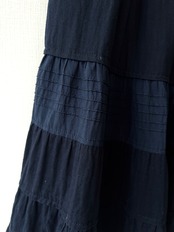 ボリュームを抑えた腰回りから、膝下にかけてフリルとピンタックを効果的に組み合わせたティアードが施されています。特に中央のティアードには細いプリーツが入り、素材の切り替えで表情に奥行きを与えています。