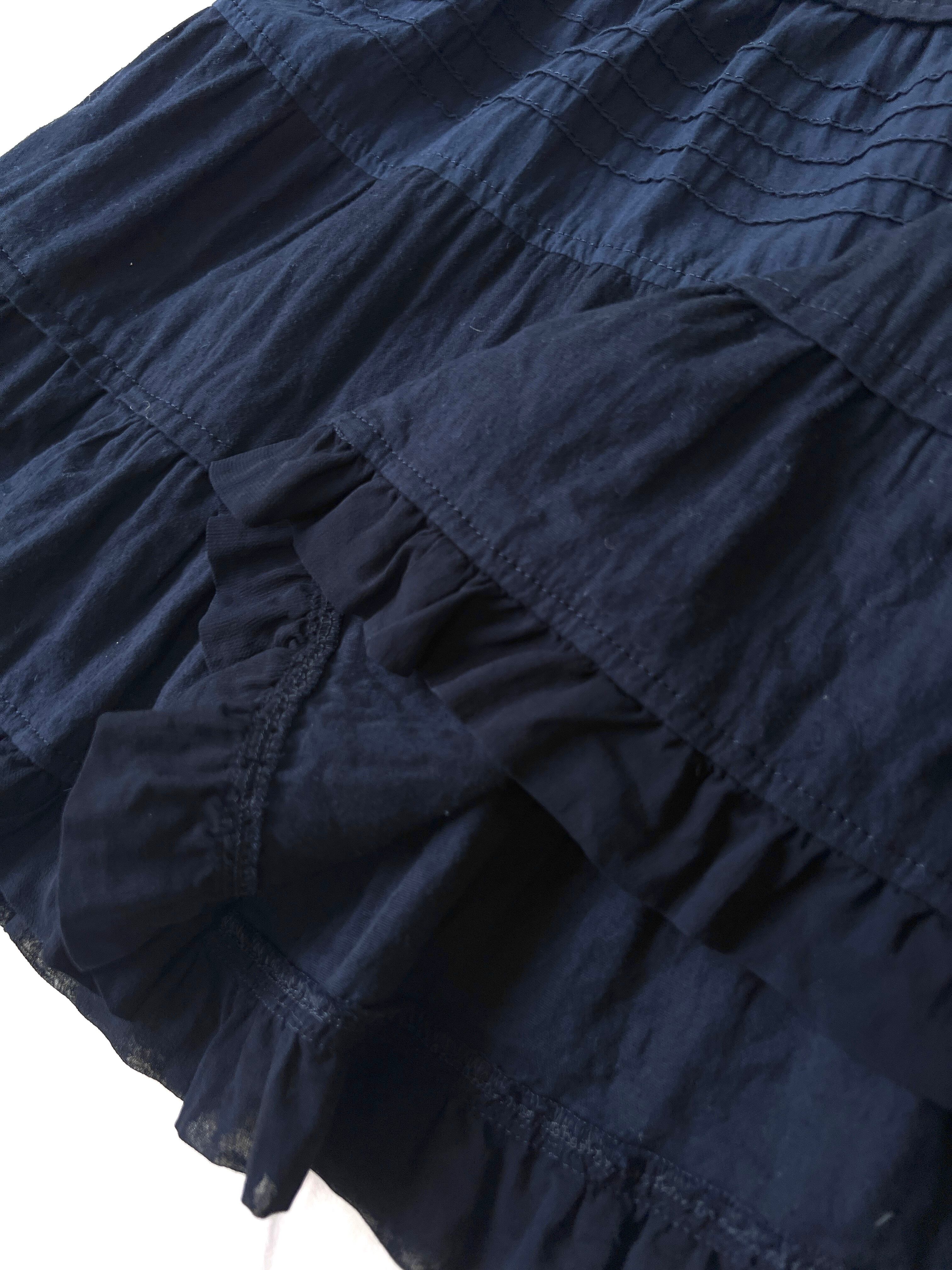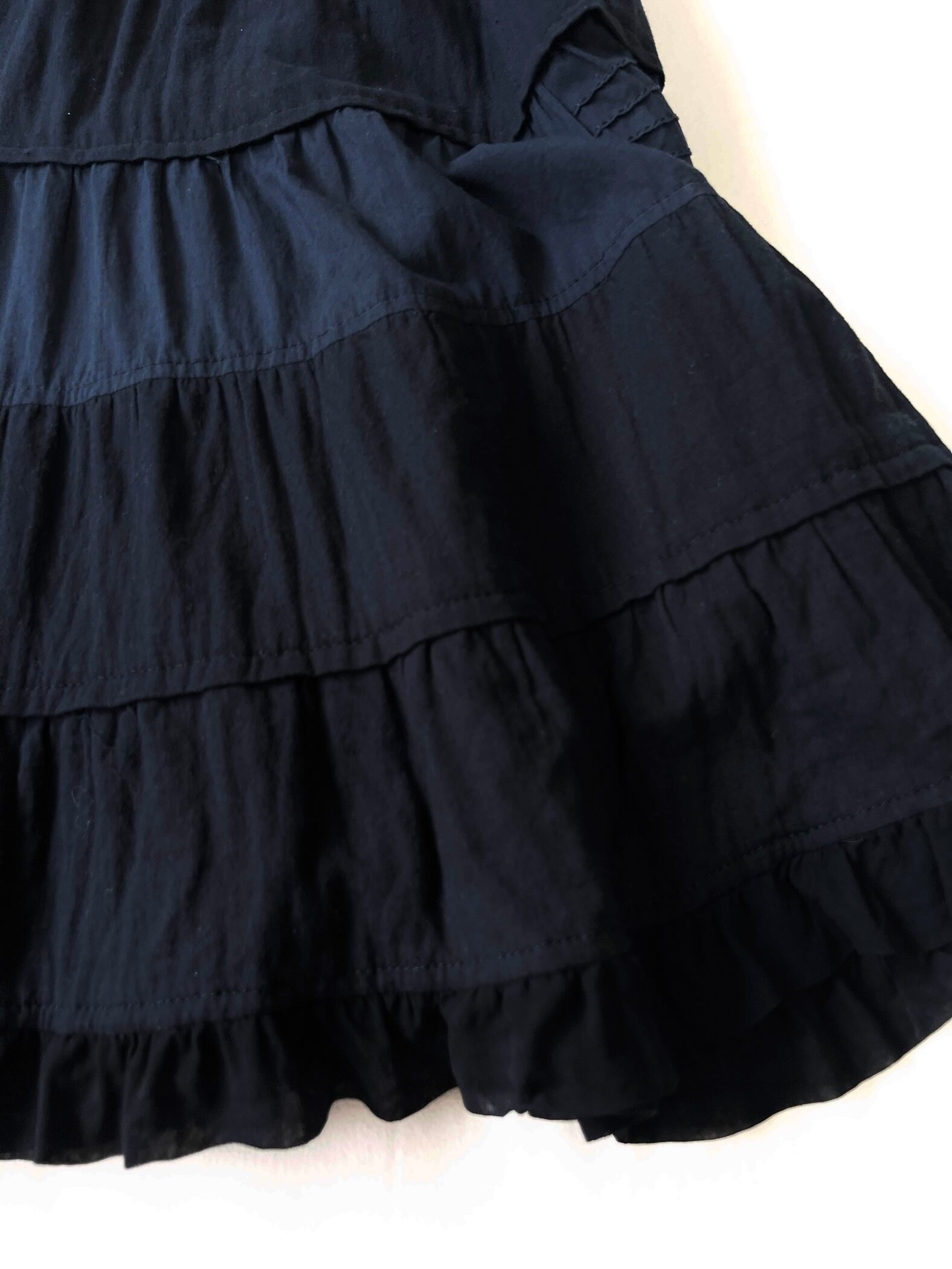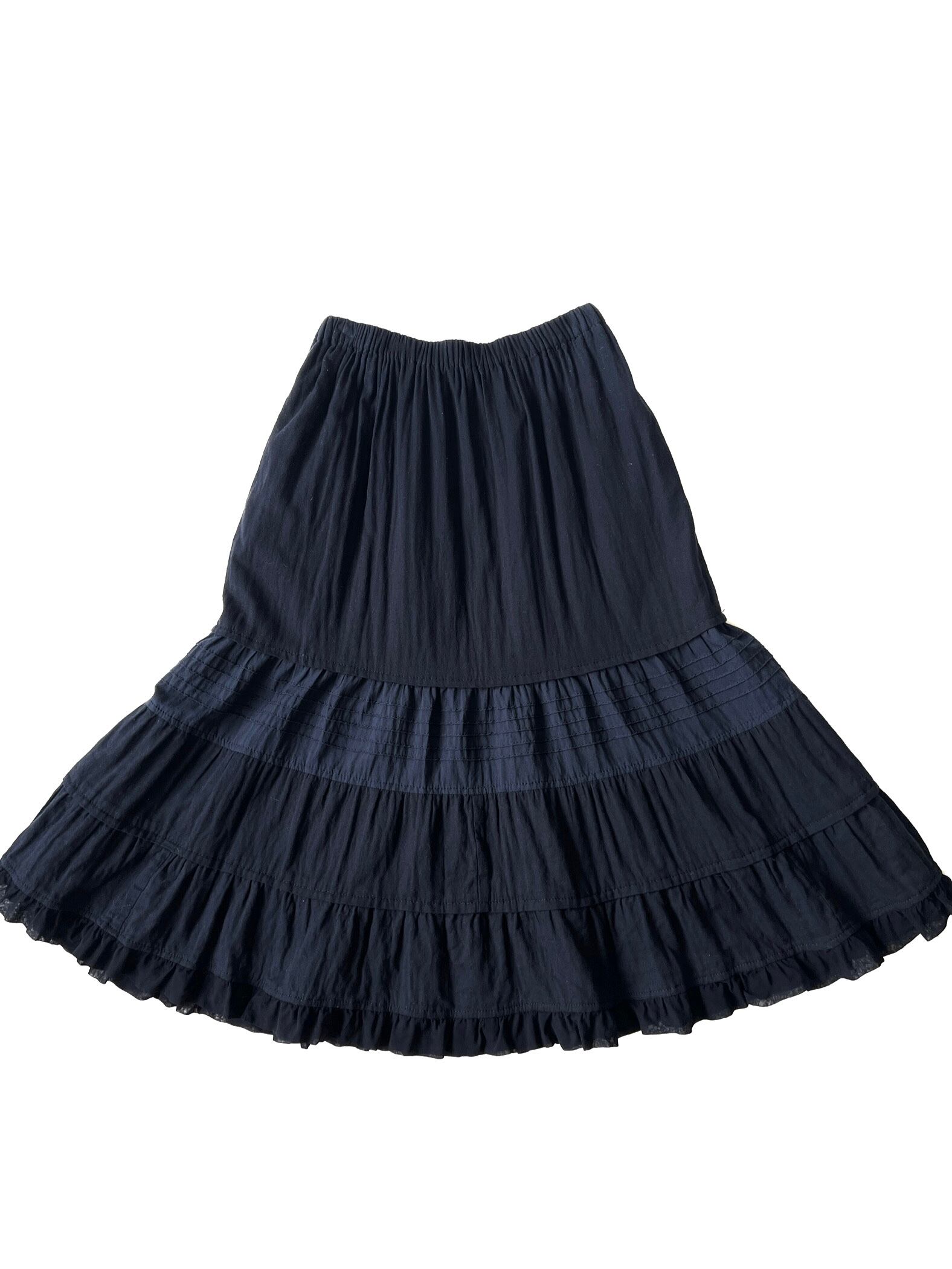 ボリュームを抑えた腰回りから、膝下にかけてフリルとピンタックを効果的に組み合わせたティアードが施されています。特に中央のティアードには細いプリーツが入り、素材の切り替えで表情に奥行きを与えています。