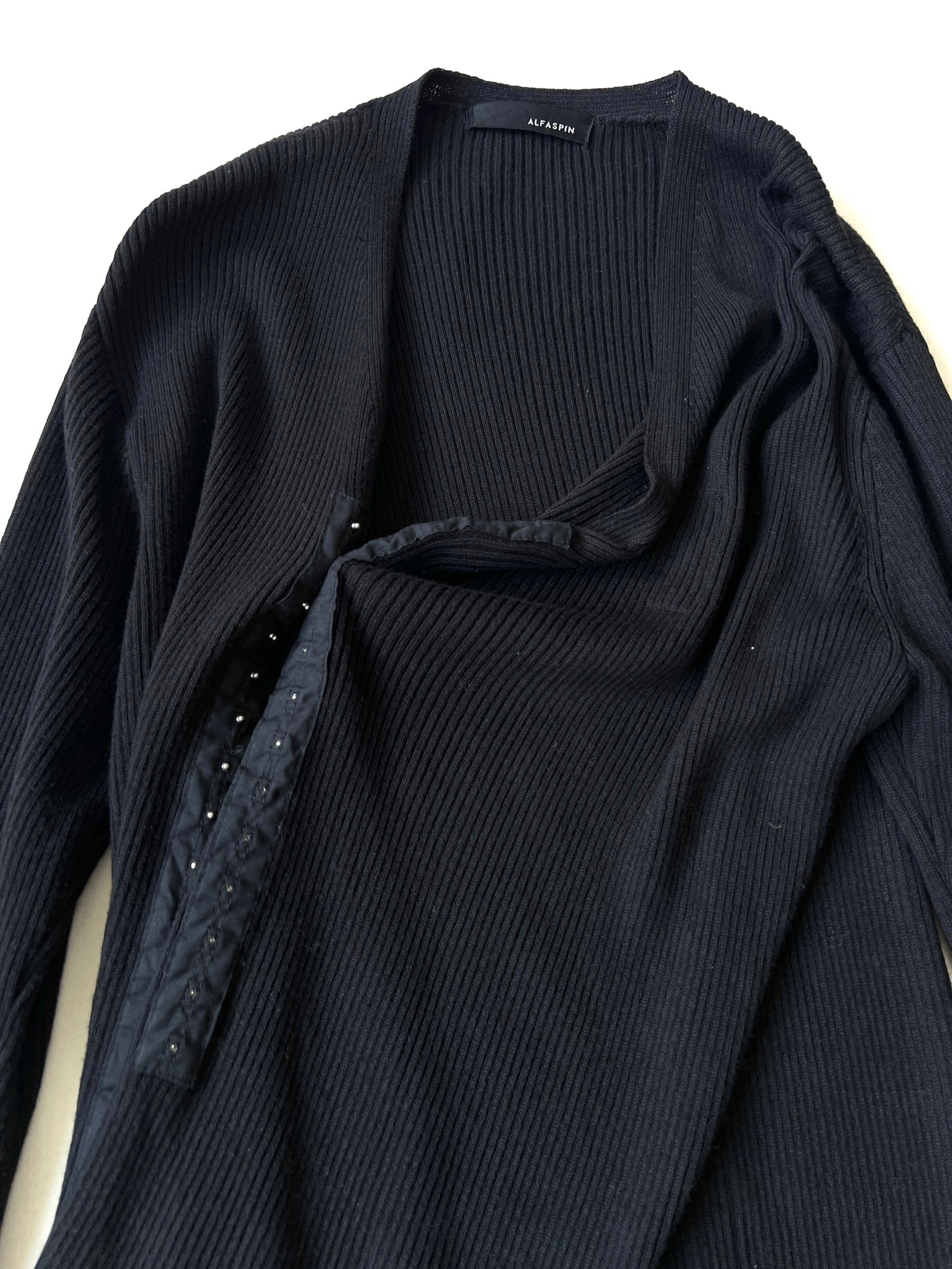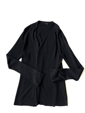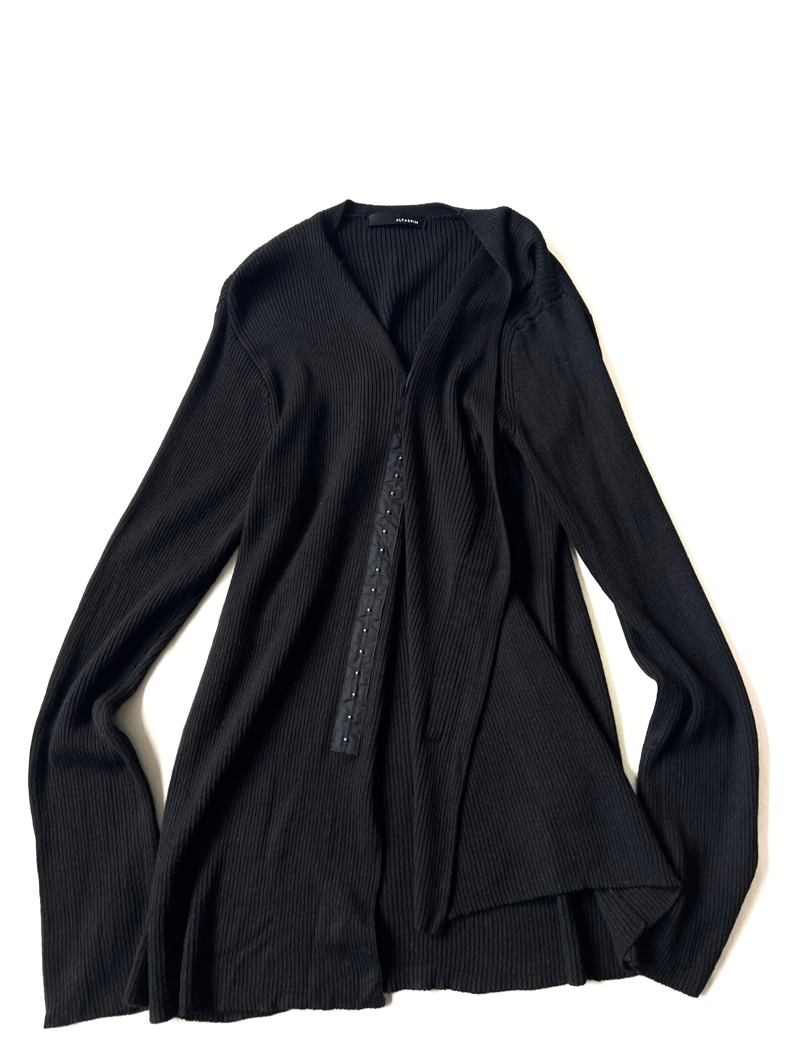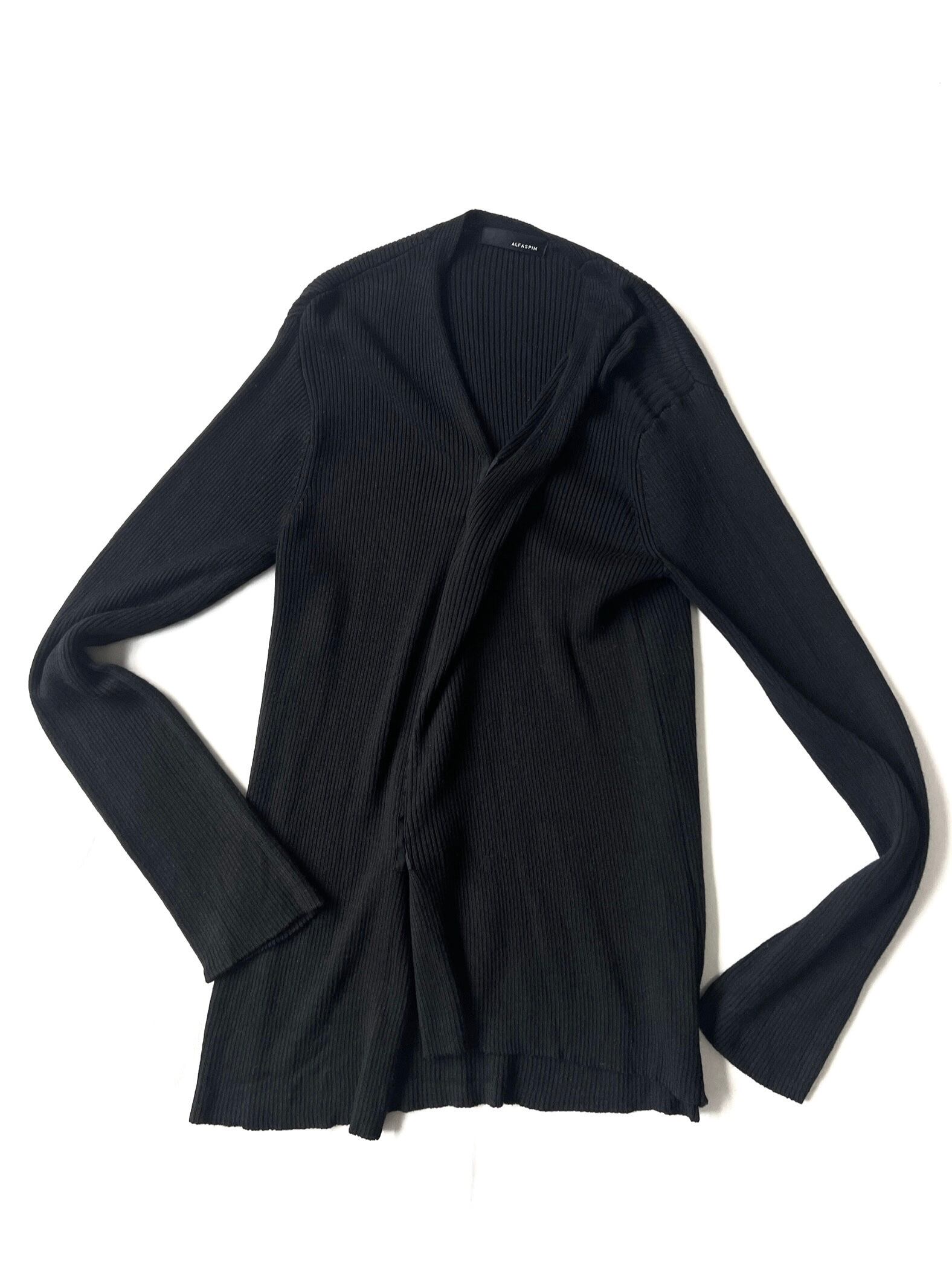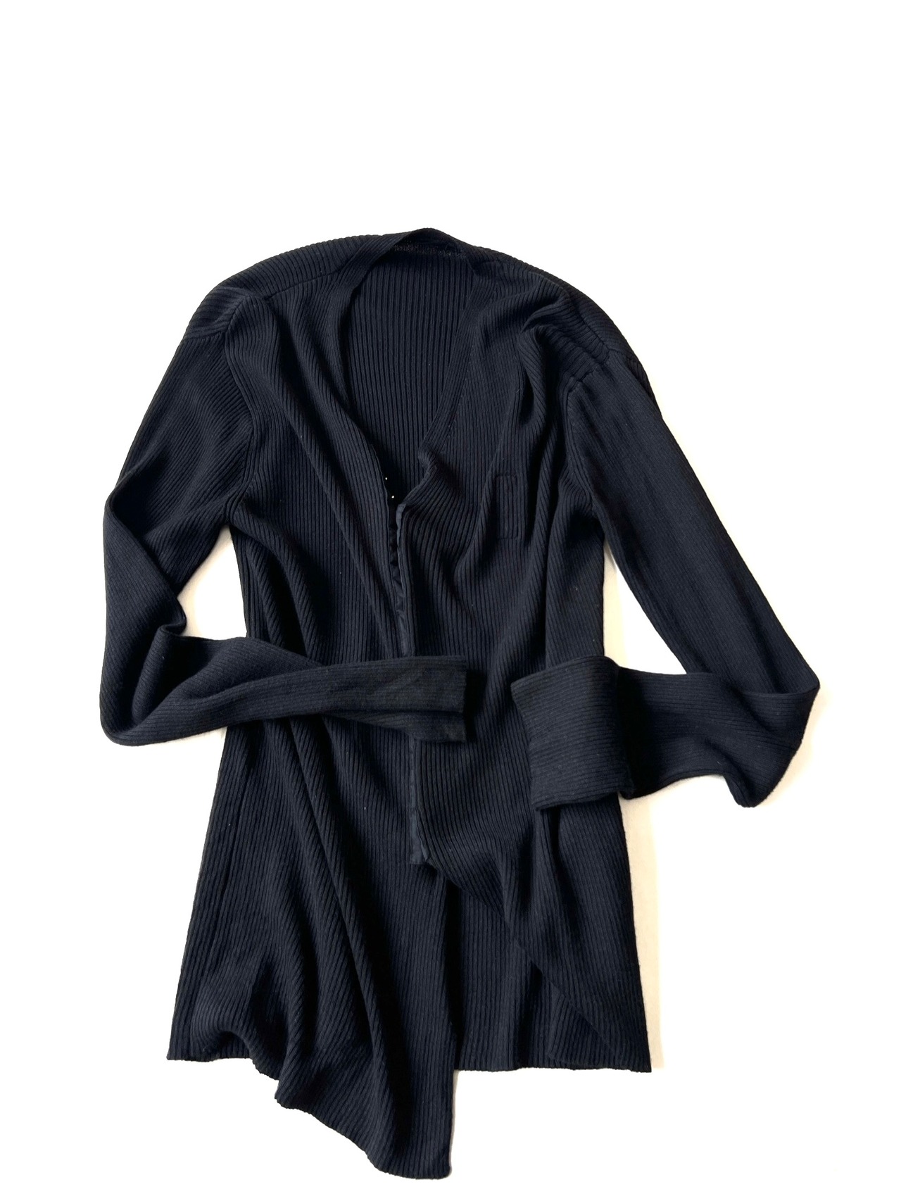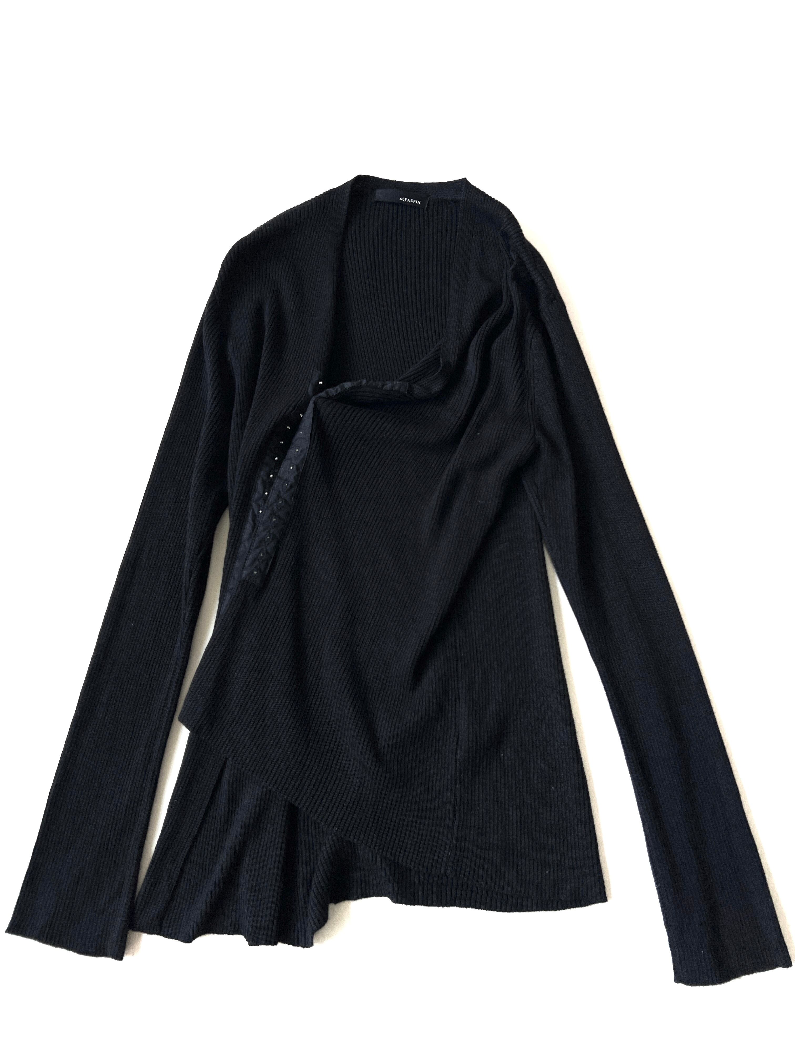 ボディはリブ編みのシンプルなVネックカーディガンでありながら、前身頃の変則的かつ複雑なデザインが特徴です。