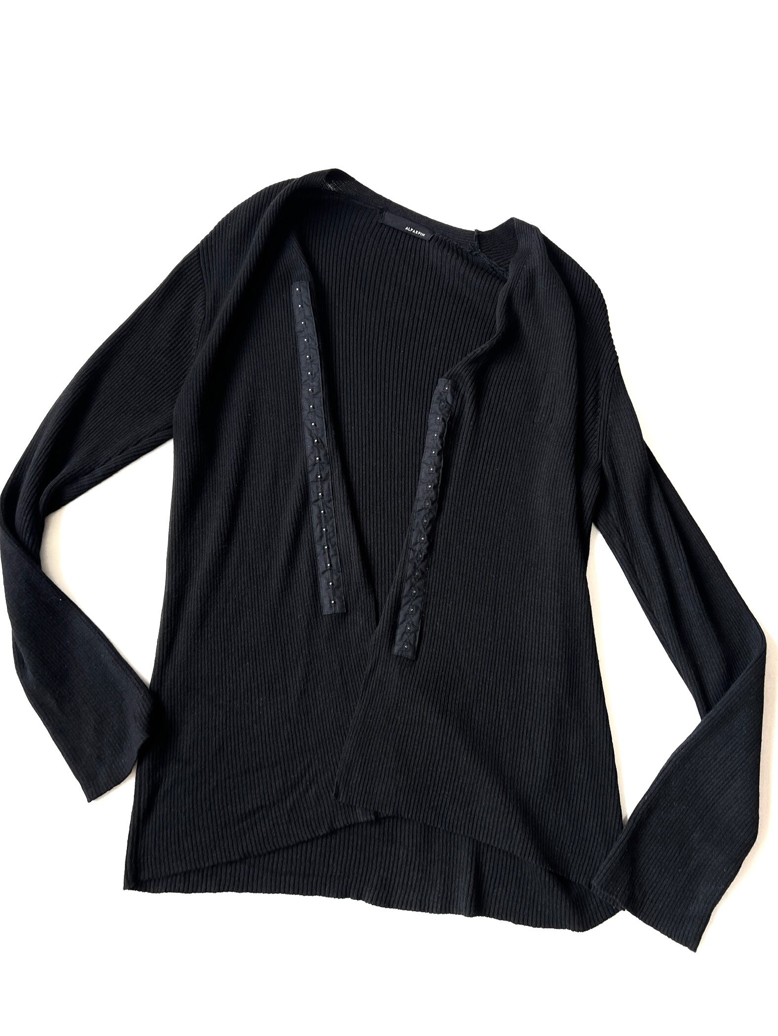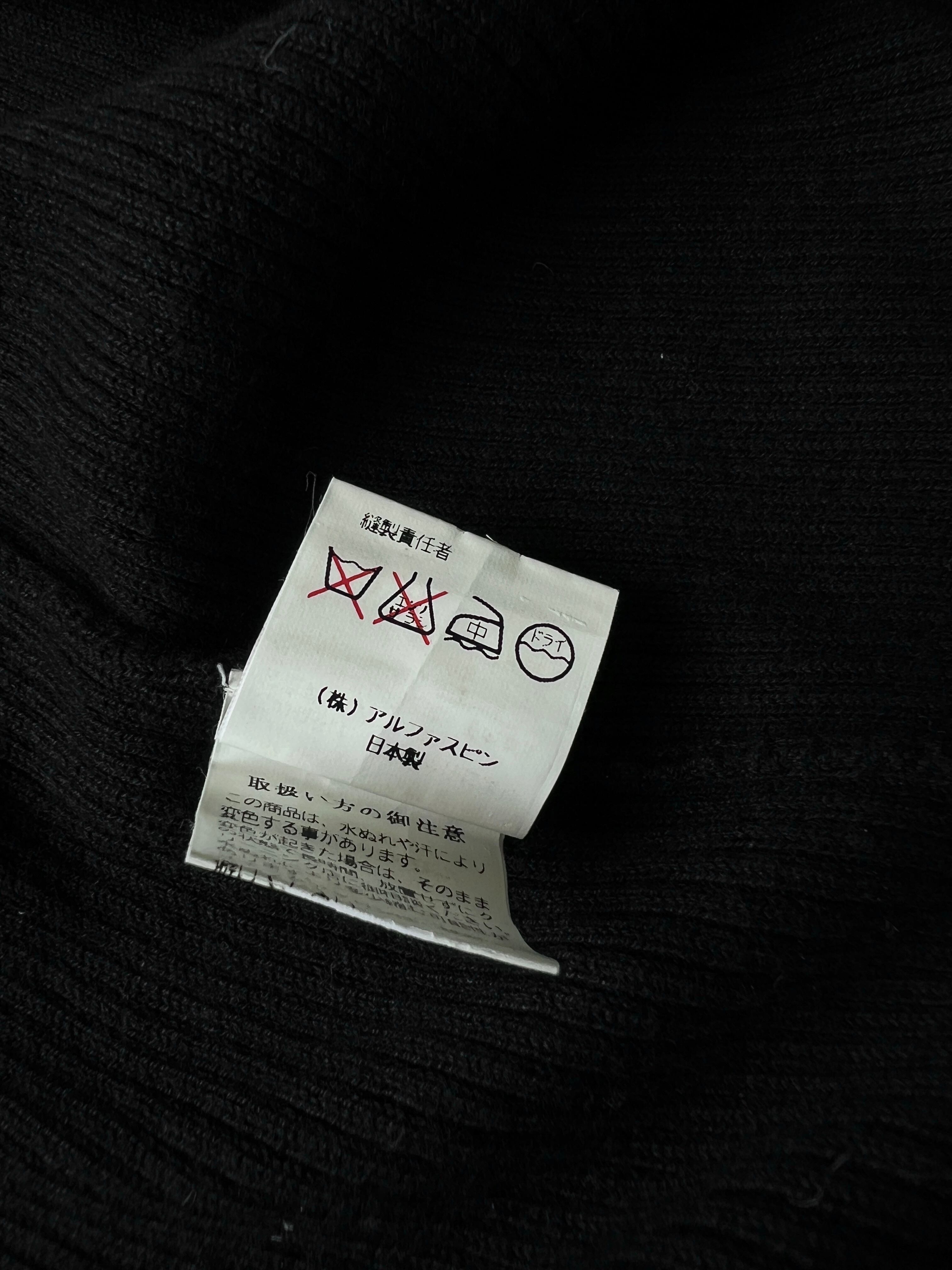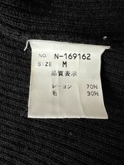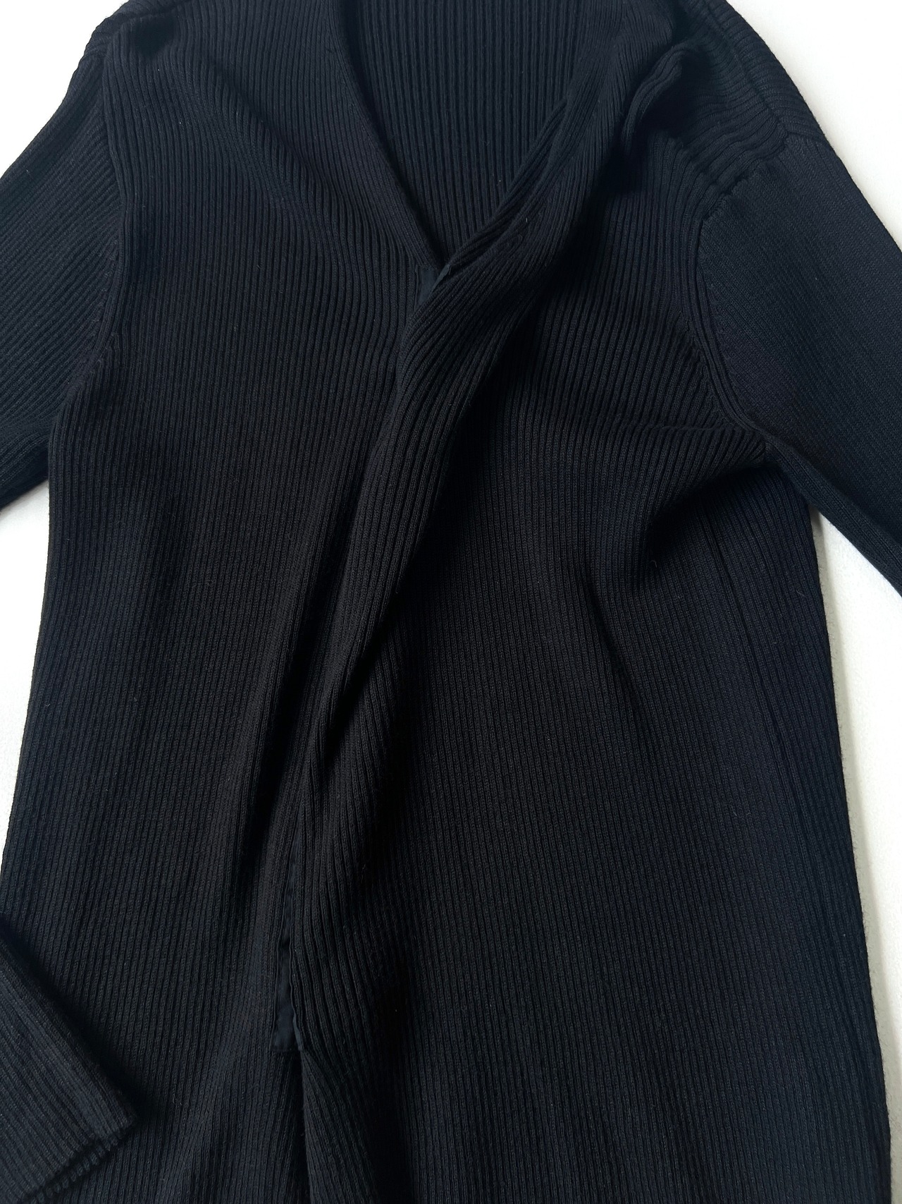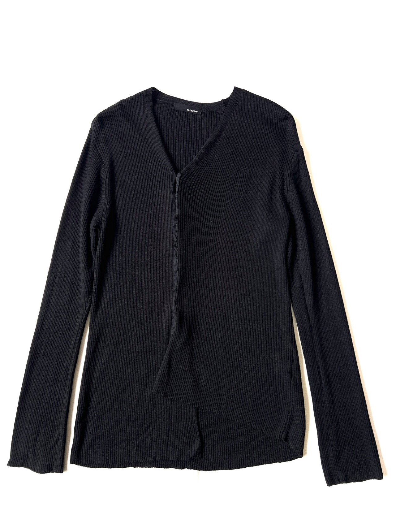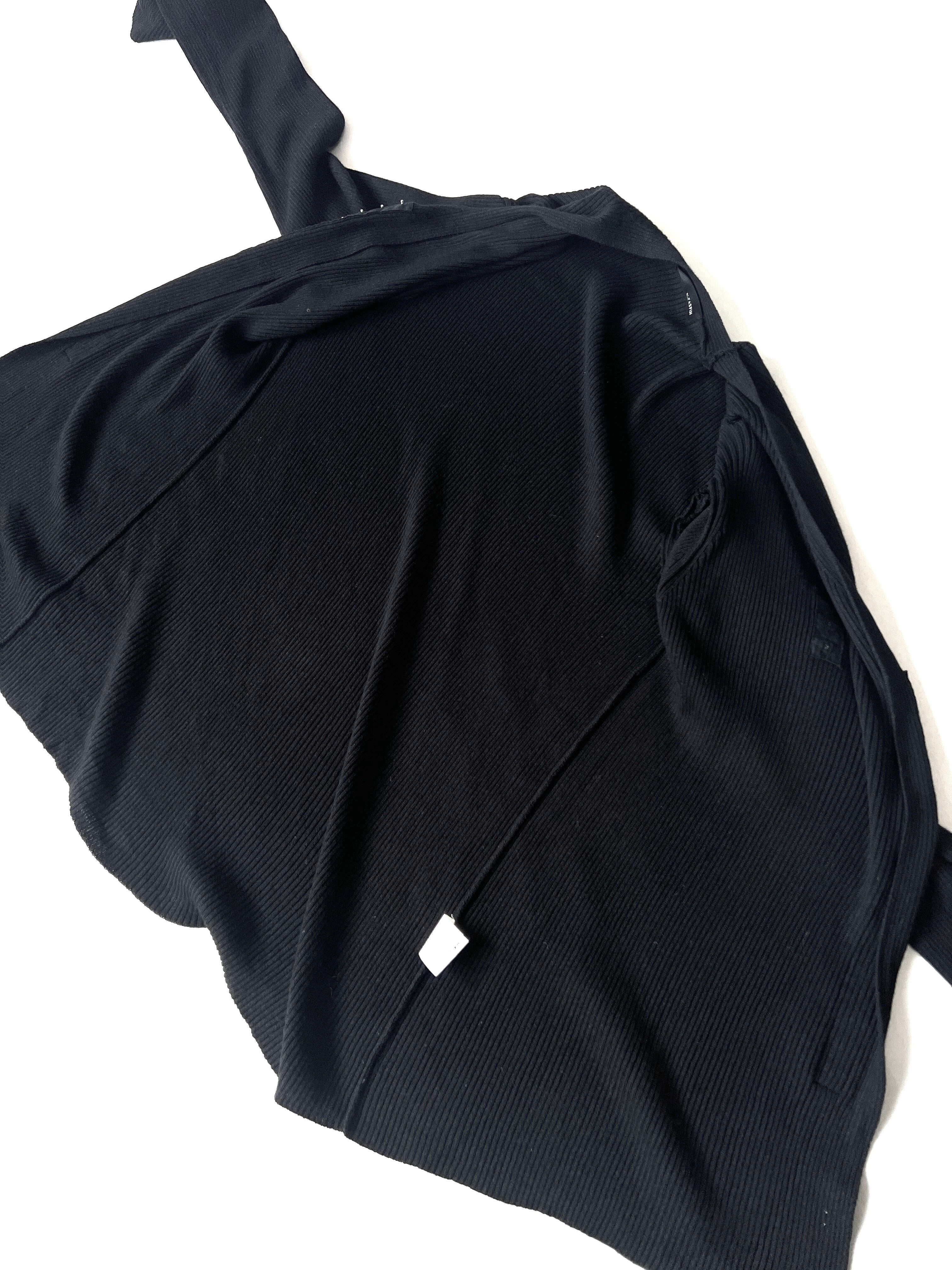ボディはリブ編みのシンプルなVネックカーディガンでありながら、前身頃の変則的かつ複雑なデザインが特徴です。