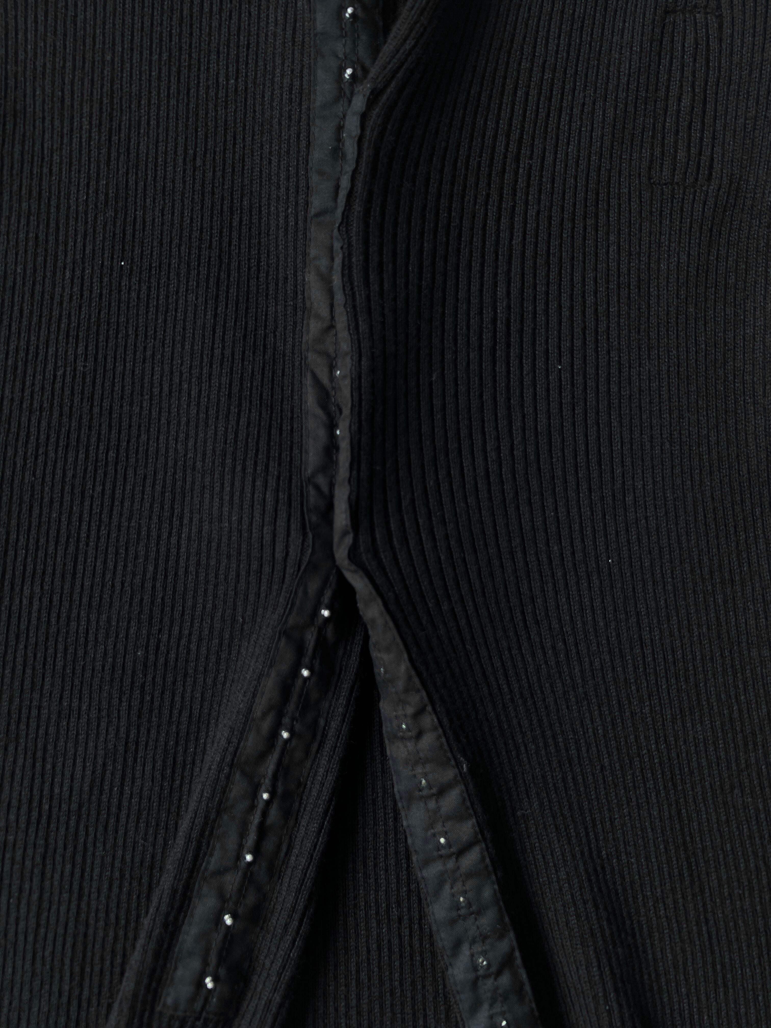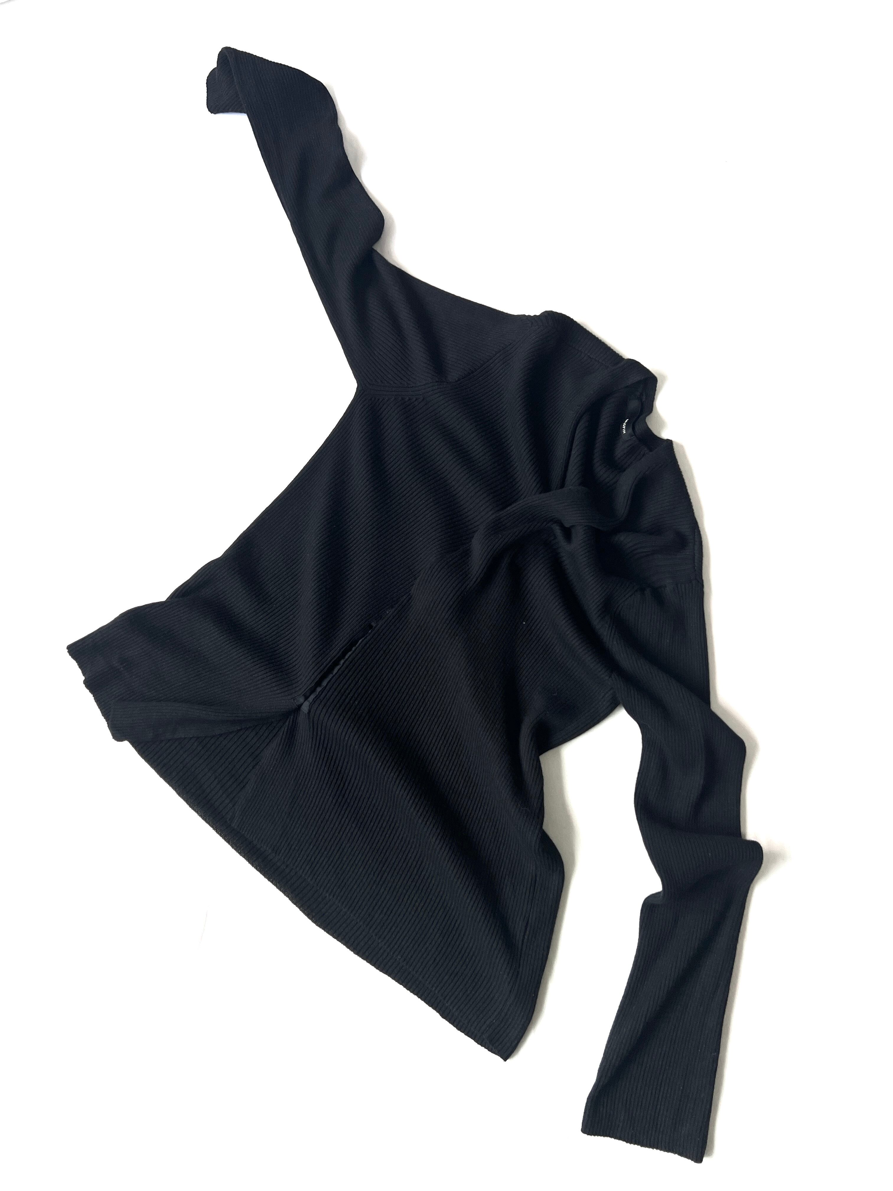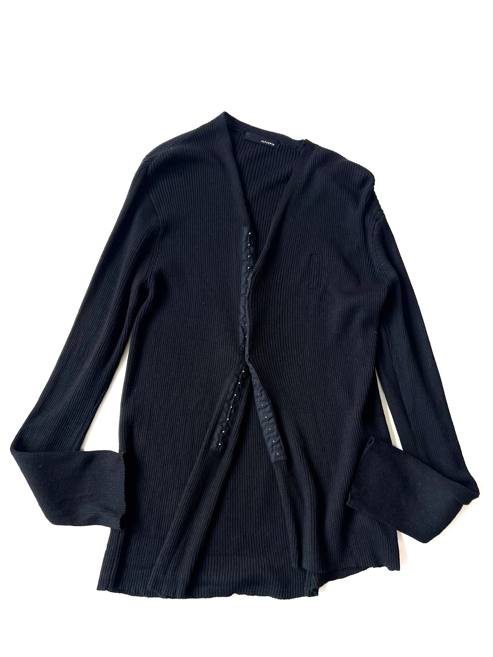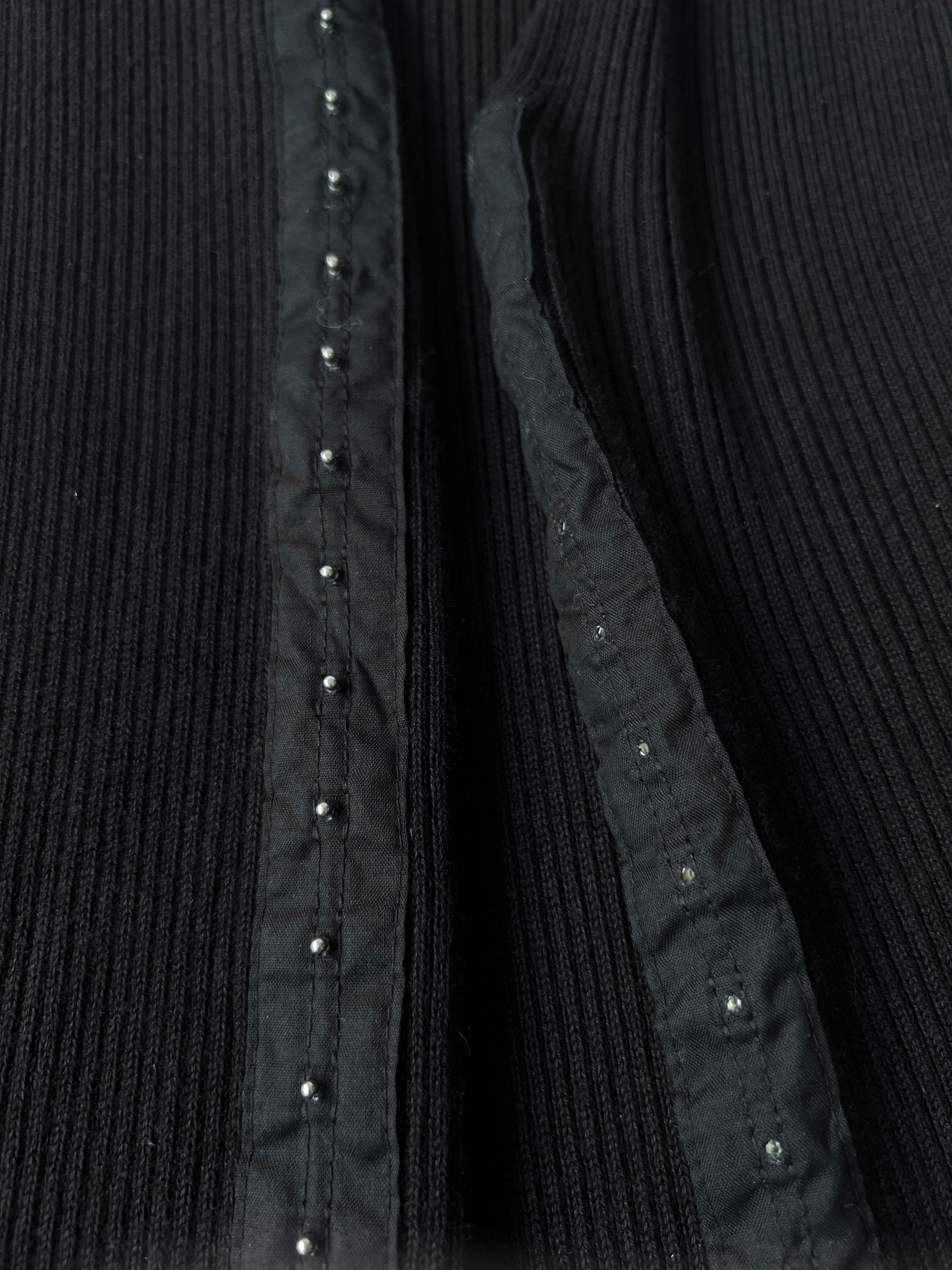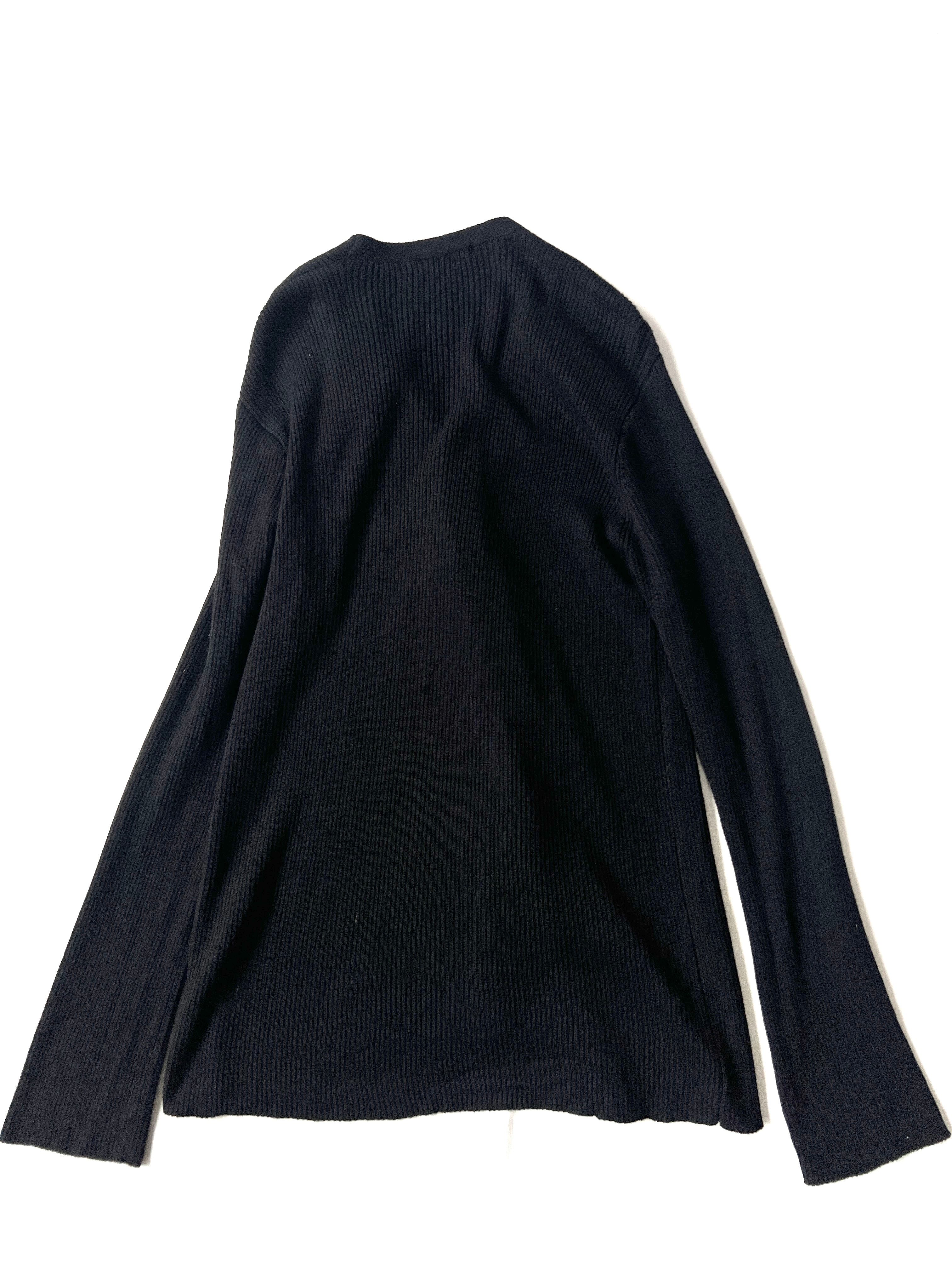 ボディはリブ編みのシンプルなVネックカーディガンでありながら、前身頃の変則的かつ複雑なデザインが特徴です。
