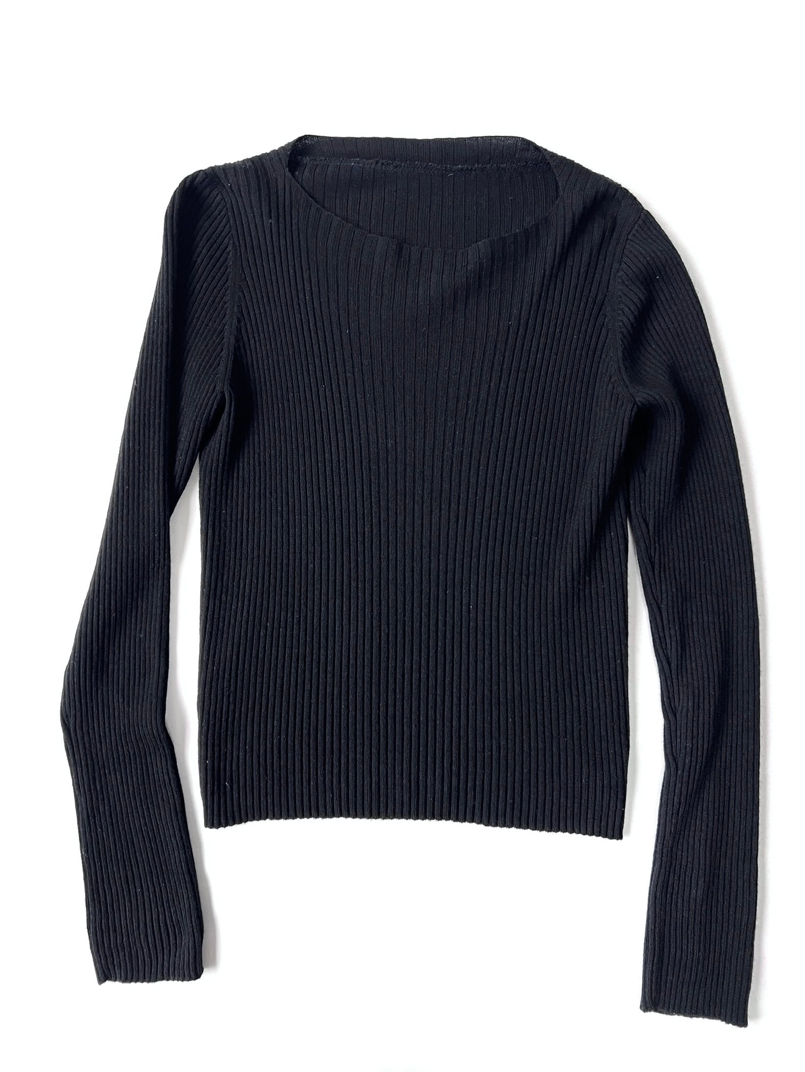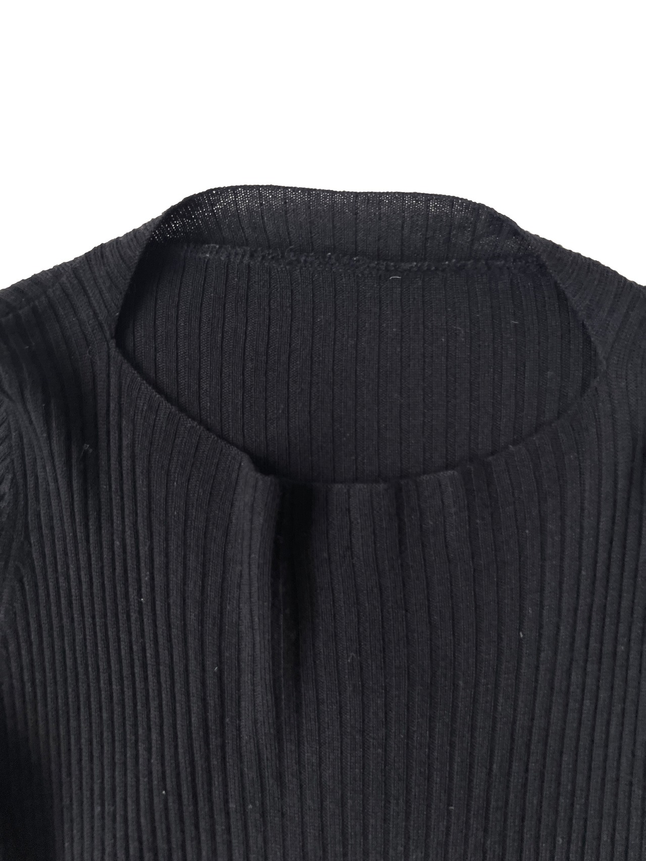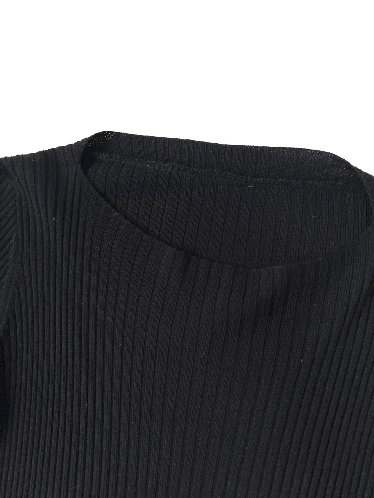 ボートネックとUネックの中間のような絶妙な曲線を描くネックラインが、顔周りをすっきりと見せてくれます。全体に入った細やかなリブ編みは、縦のラインを強調し、身体のラインに沿いながらも肉感を拾いすぎない洗練されたタイトシルエットを構築しています。