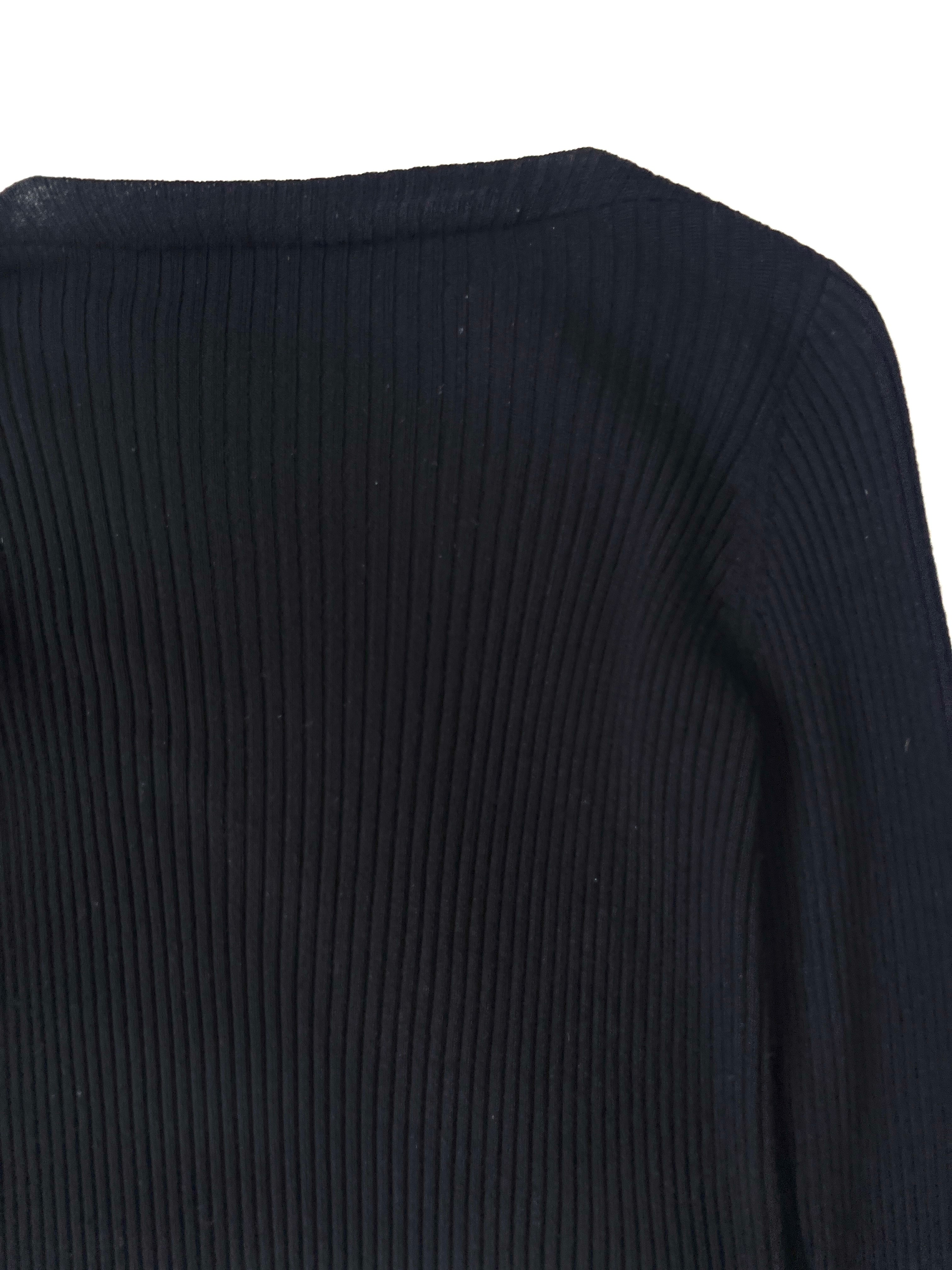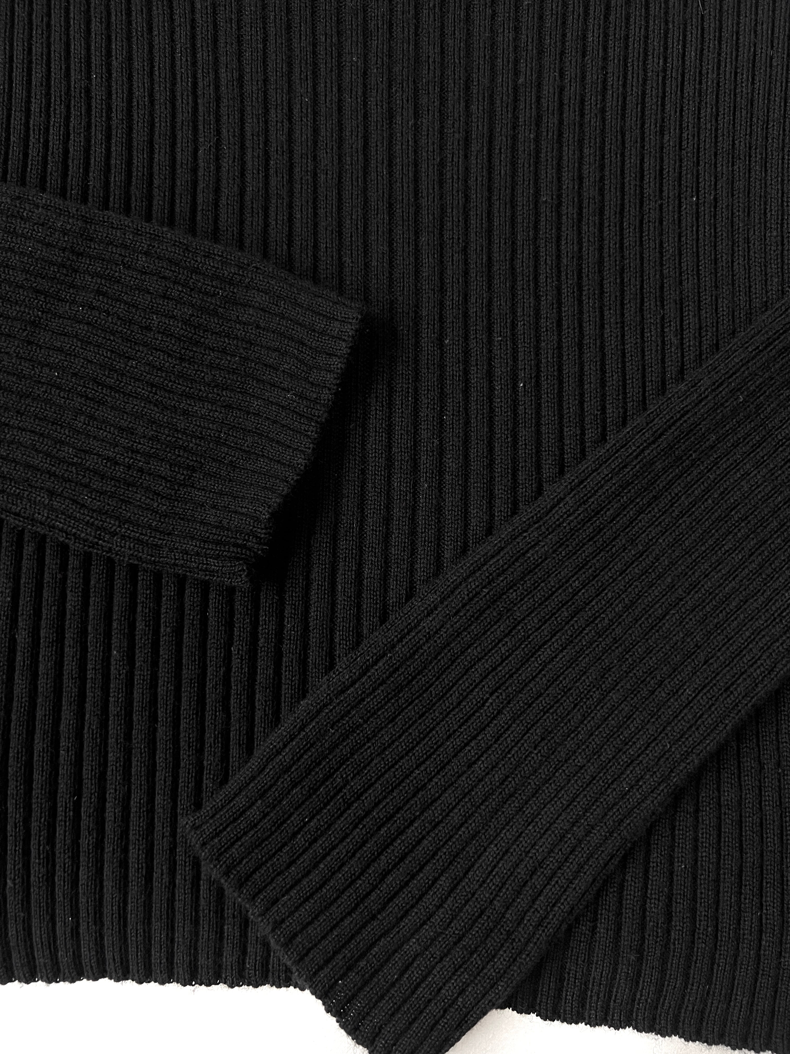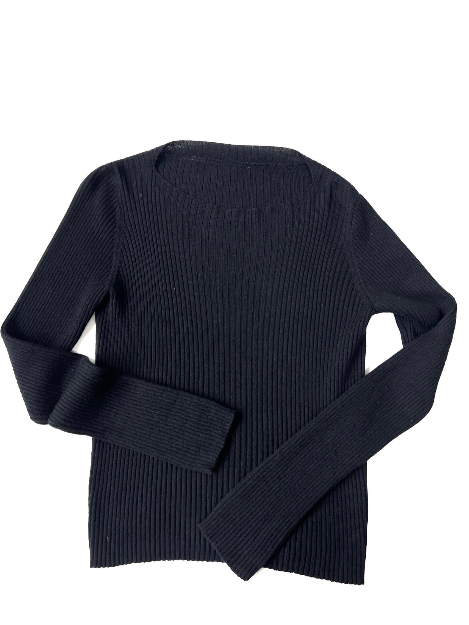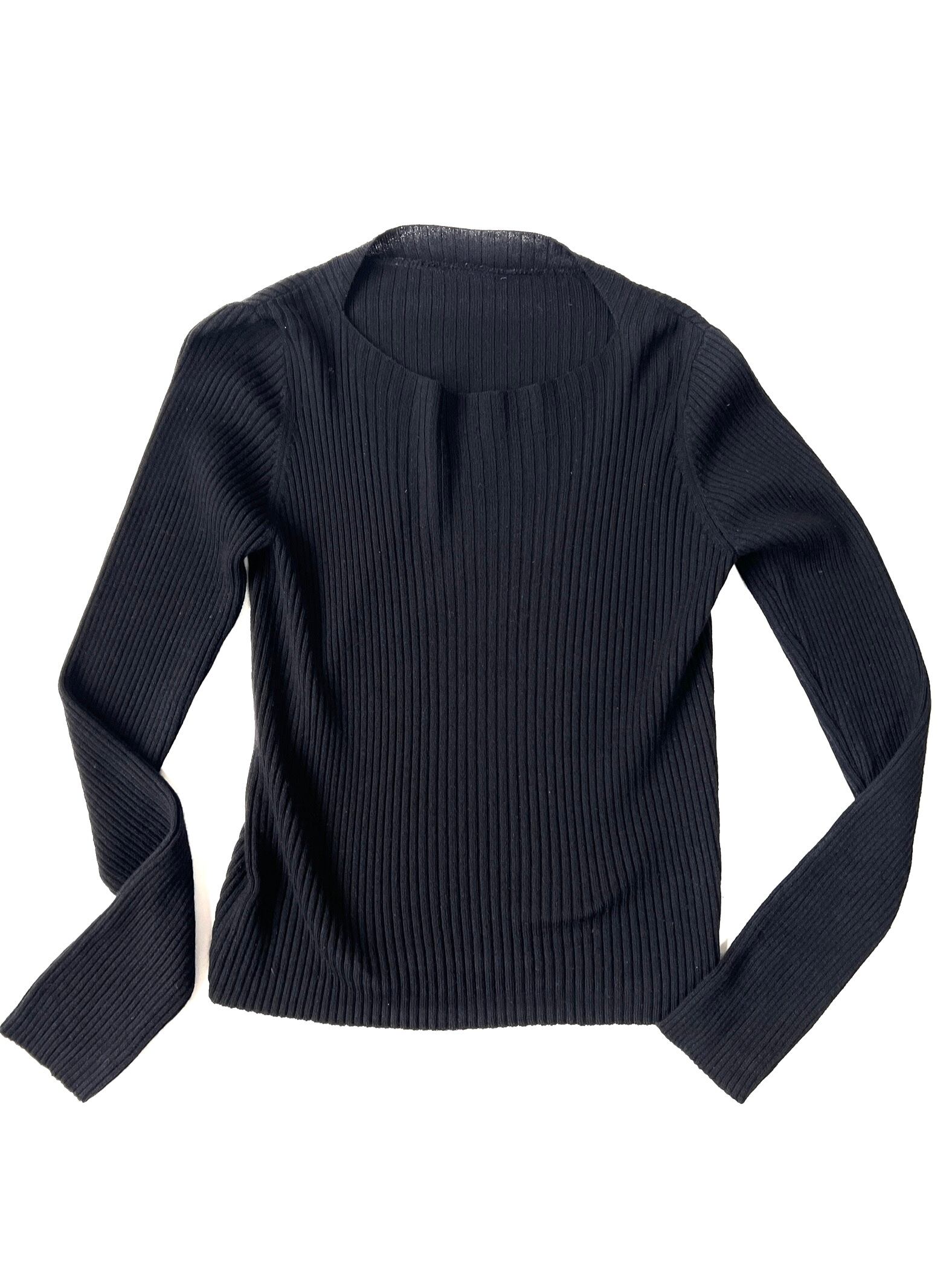 ボートネックとUネックの中間のような絶妙な曲線を描くネックラインが、顔周りをすっきりと見せてくれます。全体に入った細やかなリブ編みは、縦のラインを強調し、身体のラインに沿いながらも肉感を拾いすぎない洗練されたタイトシルエットを構築しています。