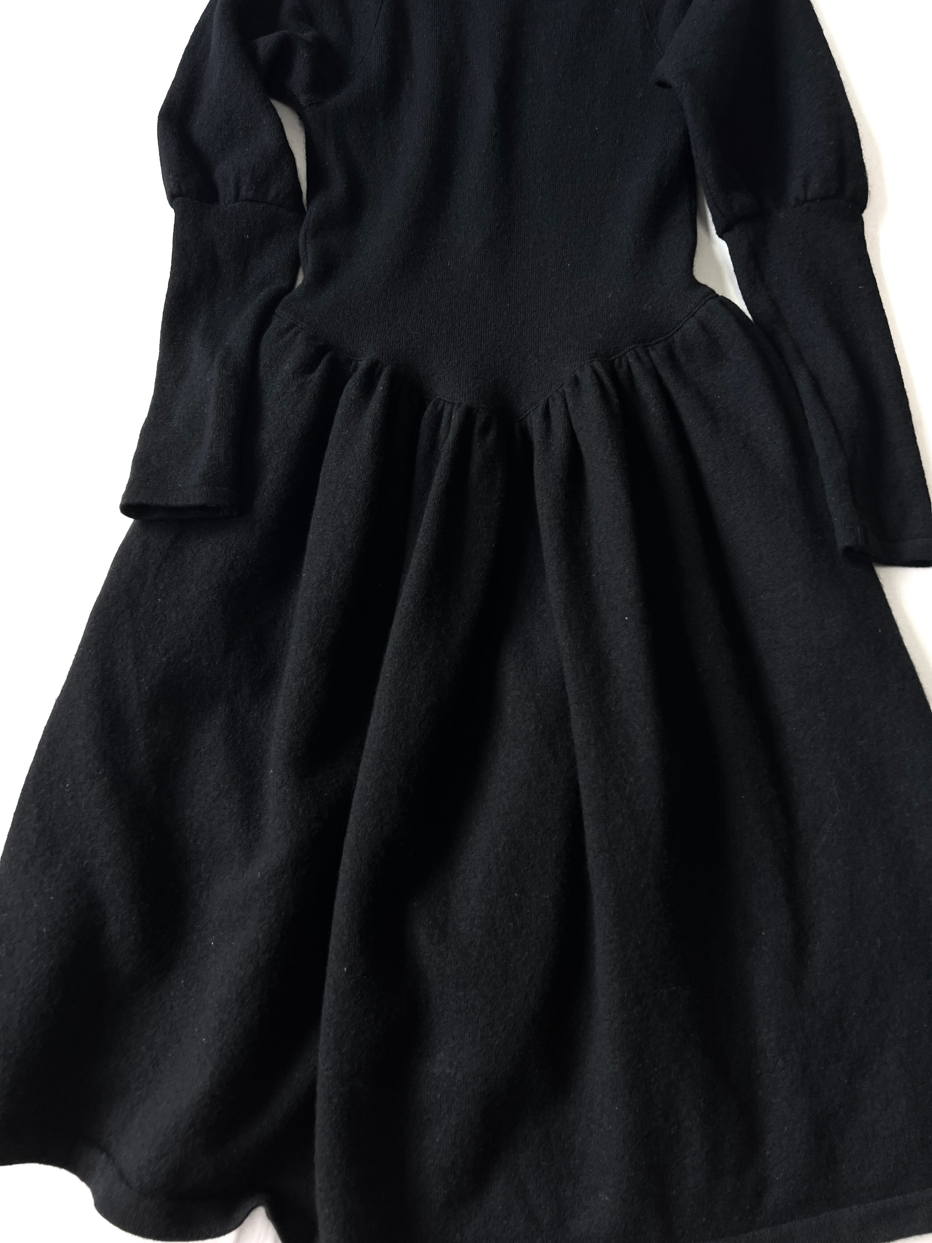こちらは身頃と袖口をタイトに作り、そこから裾に向かってドラマチックに広がるギャザーの効いたスカート、当時のパワードレスとも言える貴重な一着です。