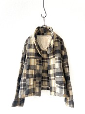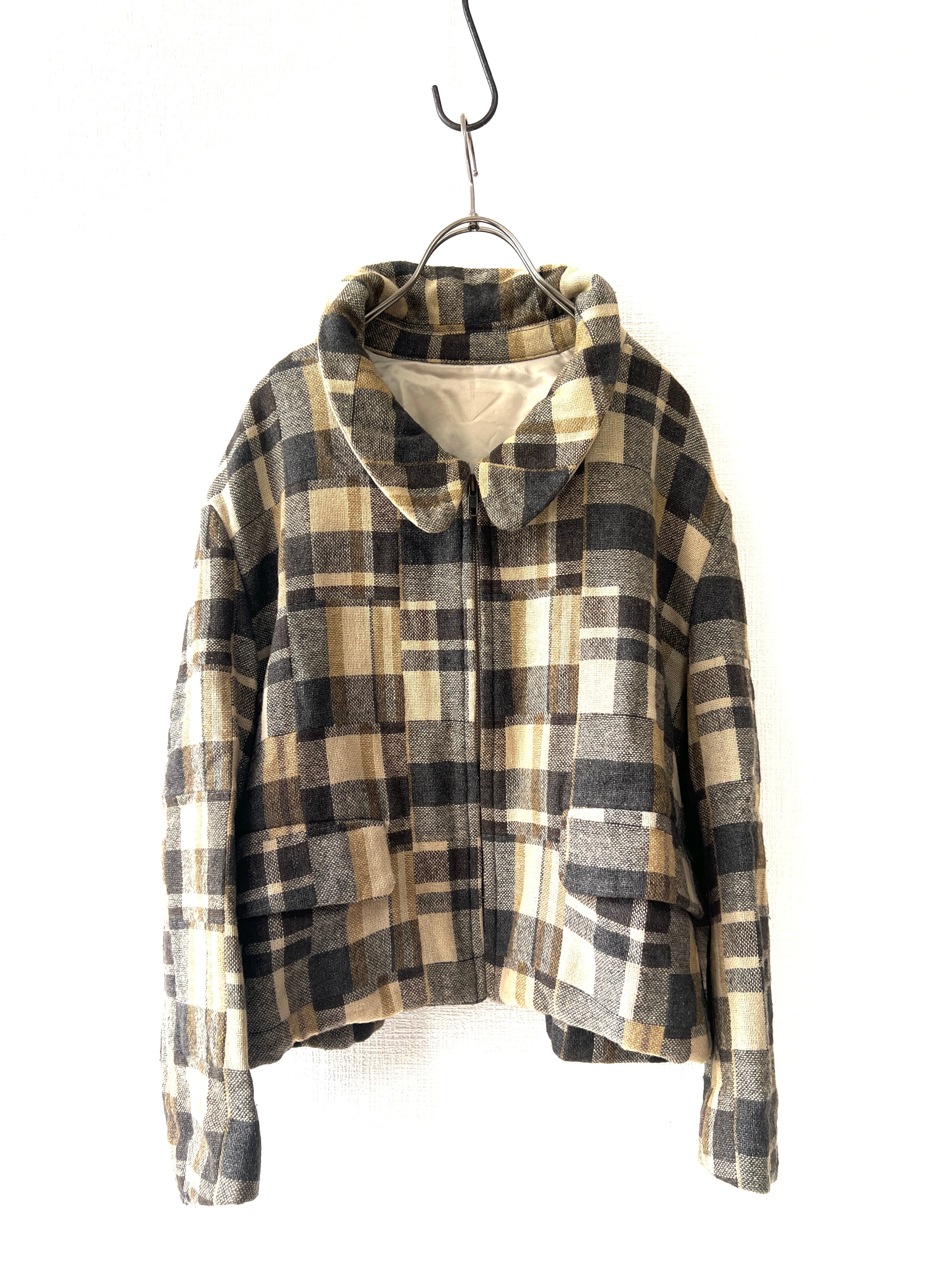 オリジナルチェックの落ち着いた色彩、ドロップショルダーのワイドシルエットが特徴的なクロップドジャケットです。