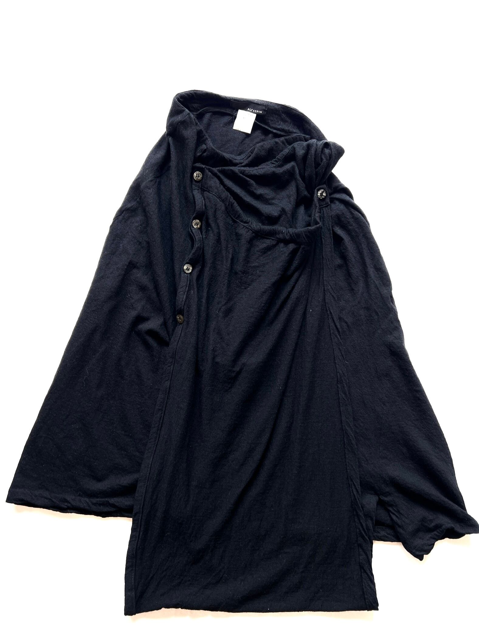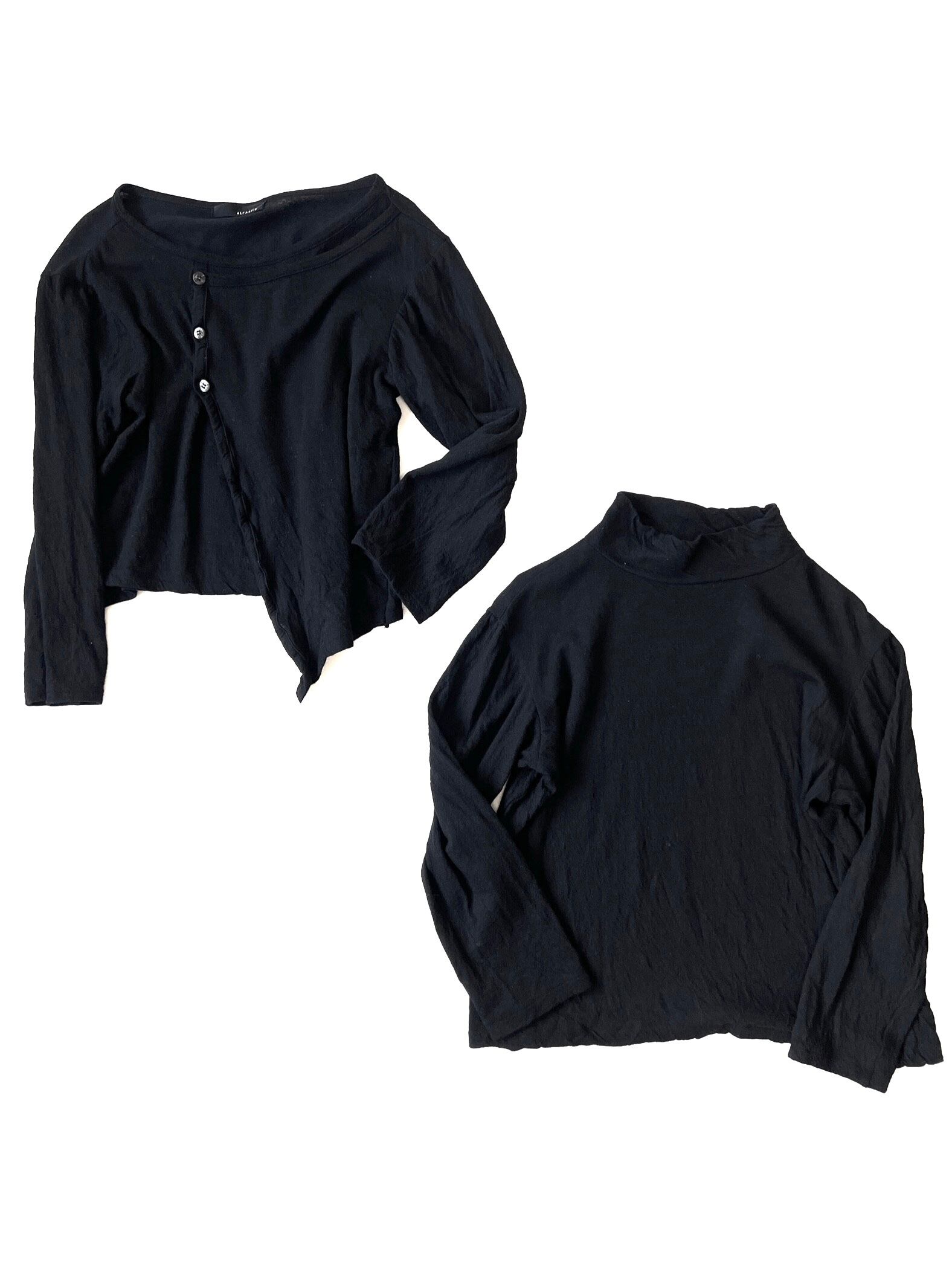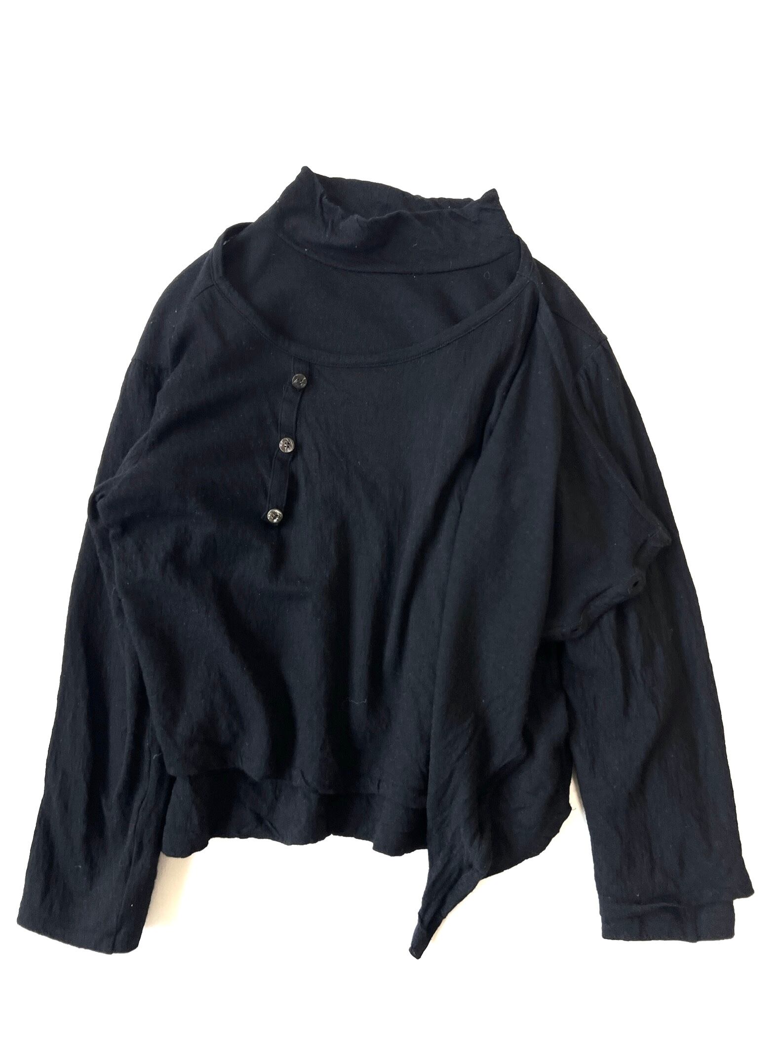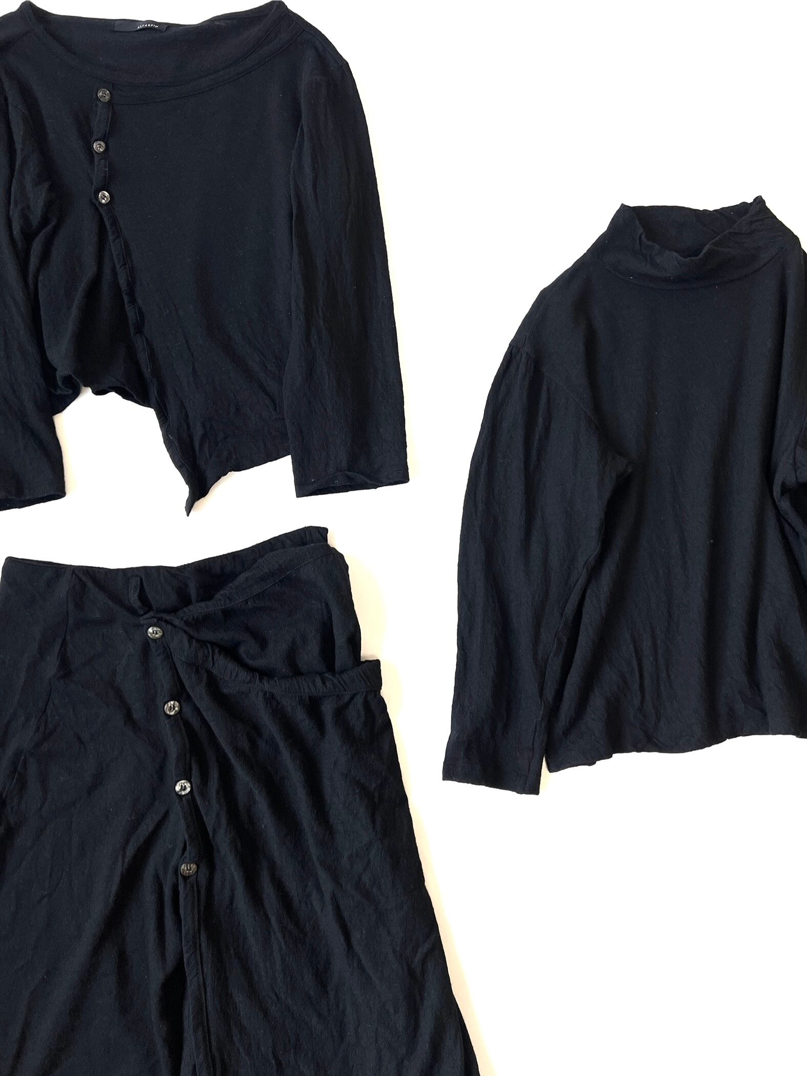 黒で統一しながらも、非対称なカッティング、ボタン配置、ドレープなど、ブランド哲学が色濃く反映された存在感のある3ピースです。