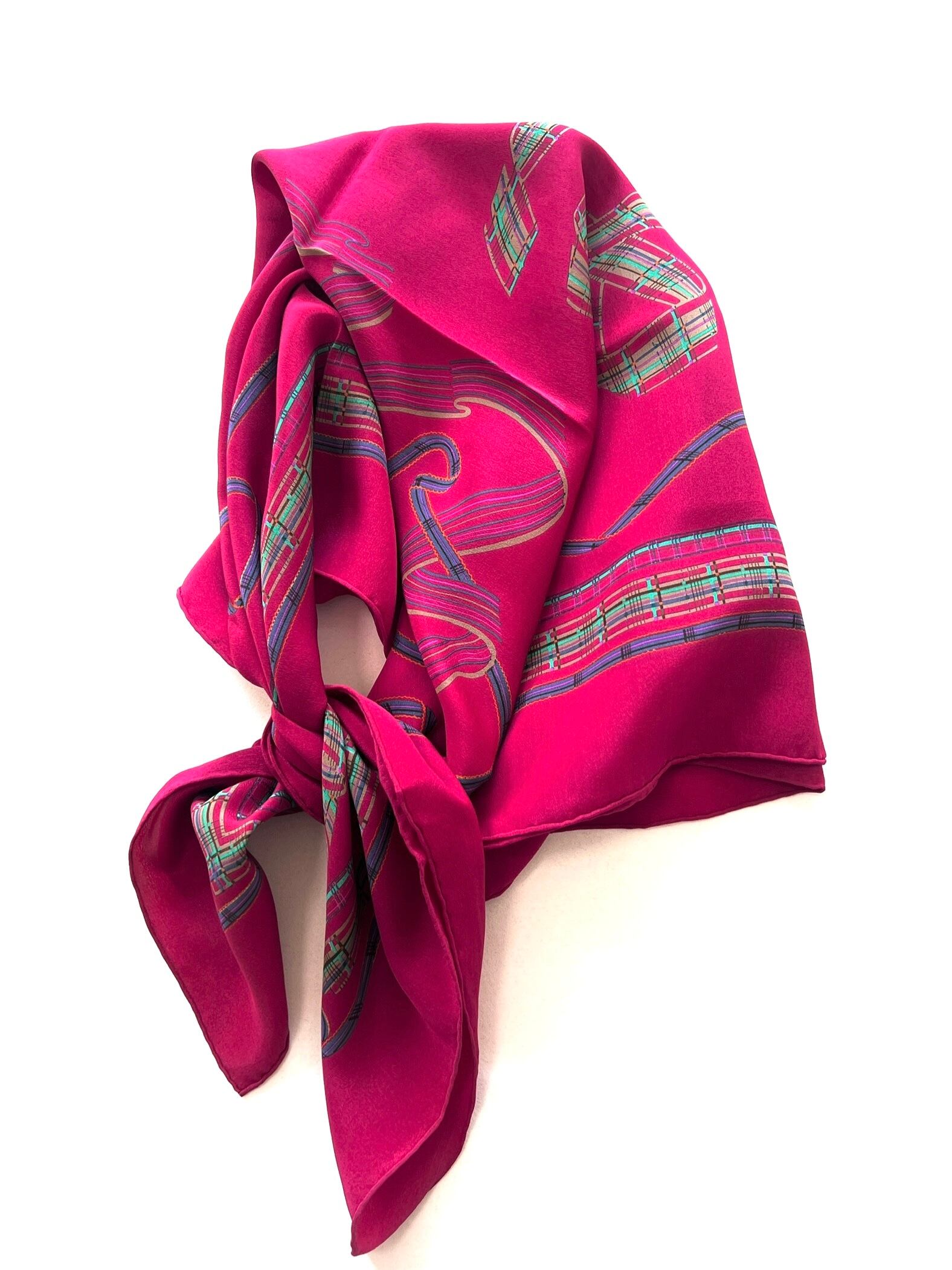 上質なシルクツイルの光沢と、端正な大判のスクエアフォルムが、首元に巻くのはもちろん、ヘッドターバンやバッグのアクセサリーとしてもラグジュアリーな存在感を発揮します。