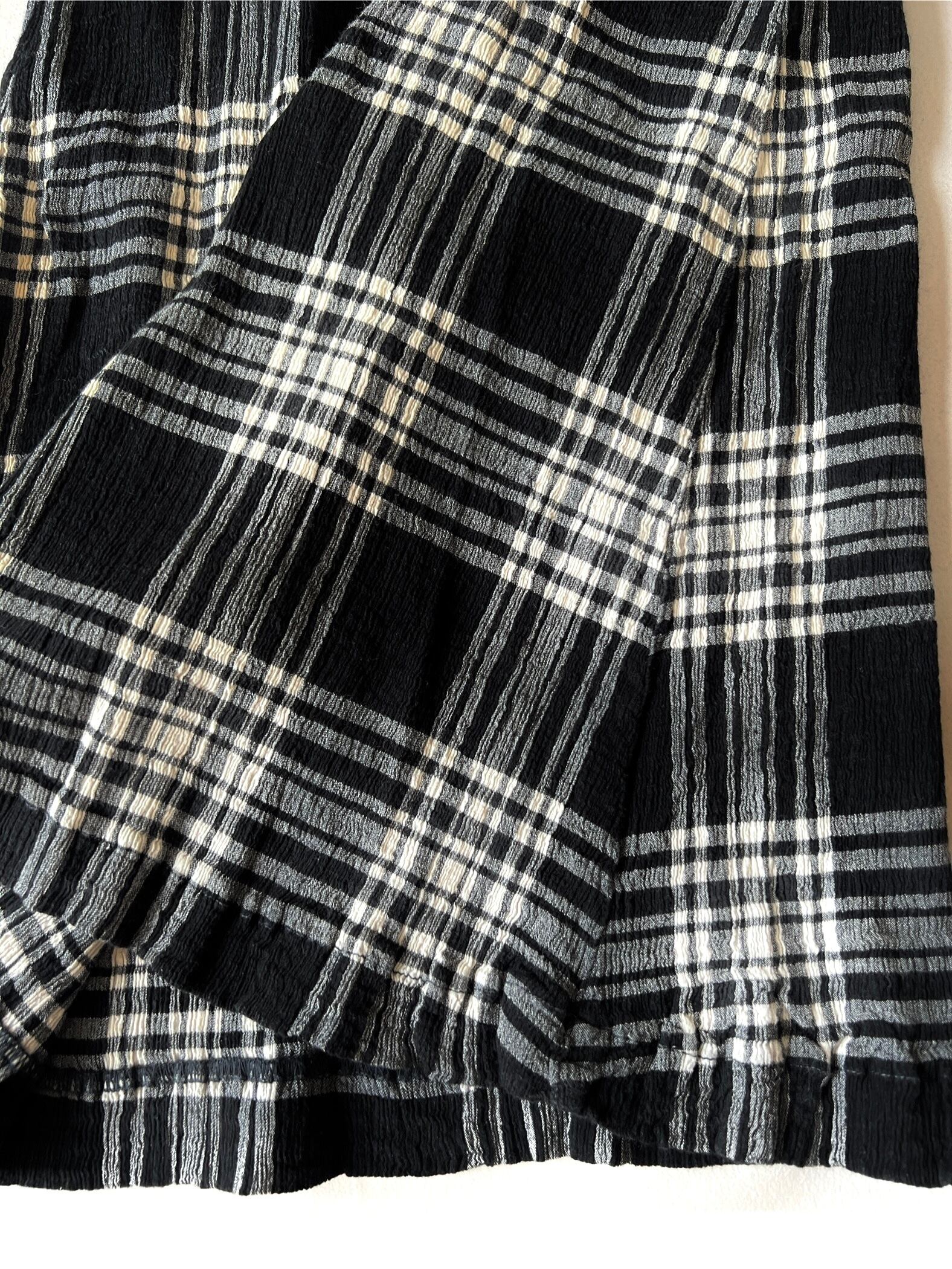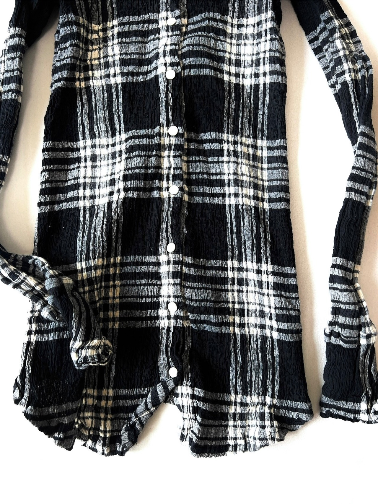 モノトーンのチェック柄がクラシックな雰囲気です。トップスはウエスタンシャツのディテールを採用した、スナップボタン留めのカジュアル仕様です。