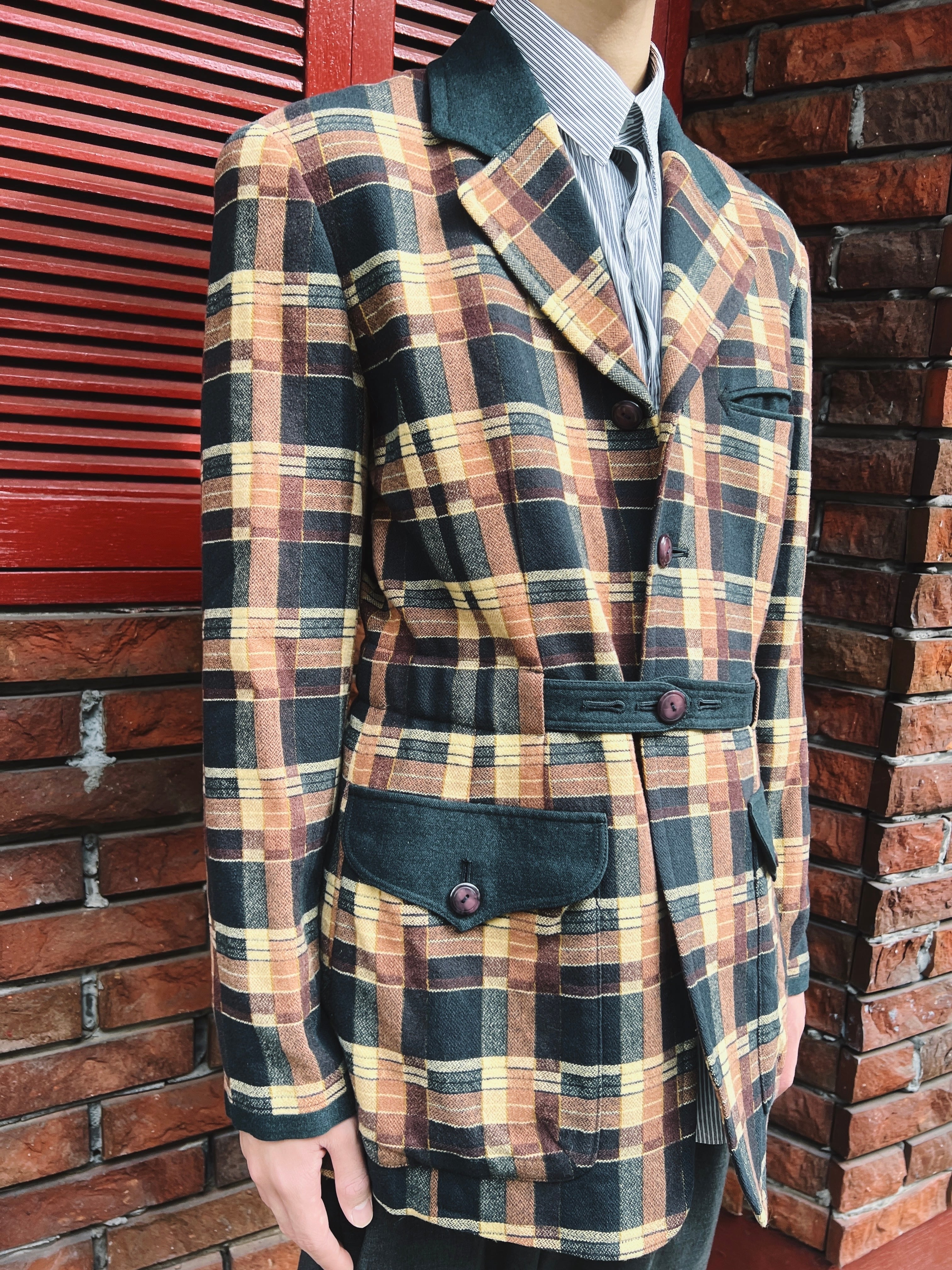 トラディショナルな要素にモダンなひねりが加えらたデザイン、洗練された色調で、狩猟服としての野暮ったさは消え、知的で都会的なエレガンスを感じる一着です。