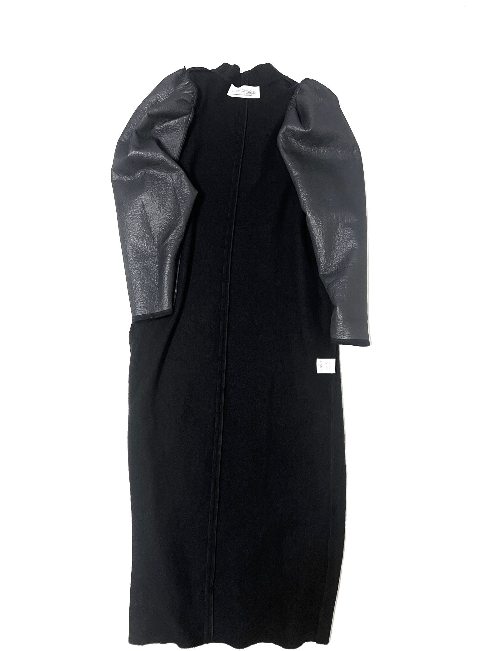 ボリュームのある構築的なスリーブと、体のラインを拾わないモダンなシルエットが特徴の、ロング丈ニットワンピースです。