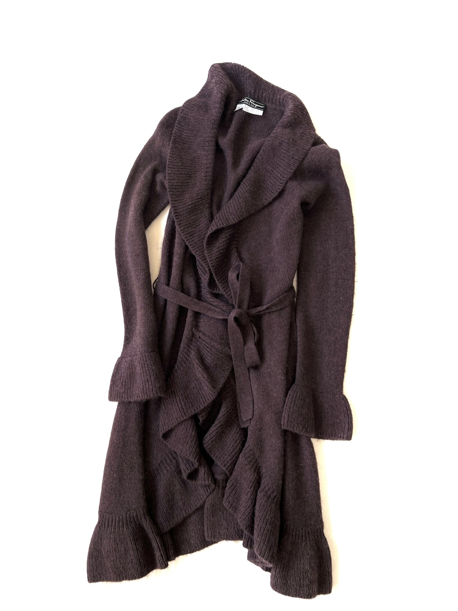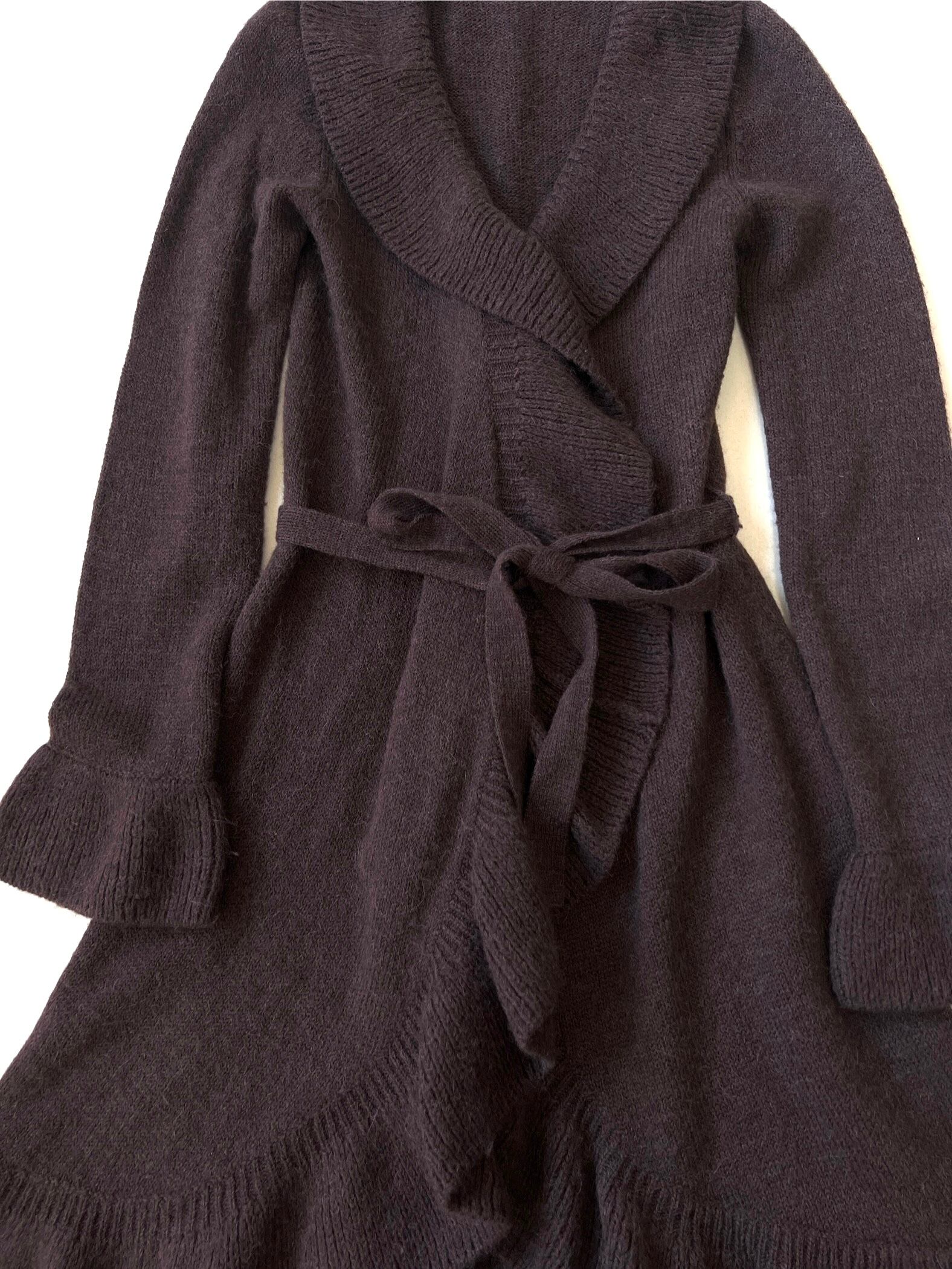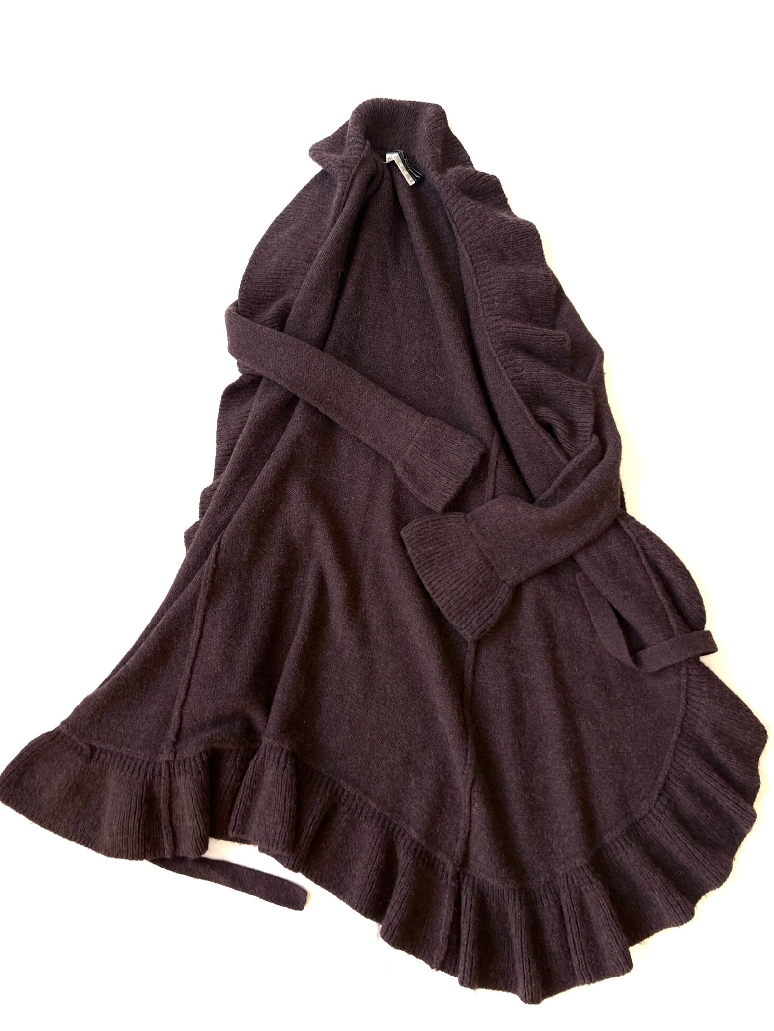 裾と前立てにあしらわれた大胆なフリルが、優雅に揺らめき、女性らしさと華やかさを演出してくれます。共布のベルトはきゅっと絞ればメリハリのあるラップドレスのような優美なシルエットに、開けて着れば流れるようなドレープのロングカーディガンとして楽しめます。
