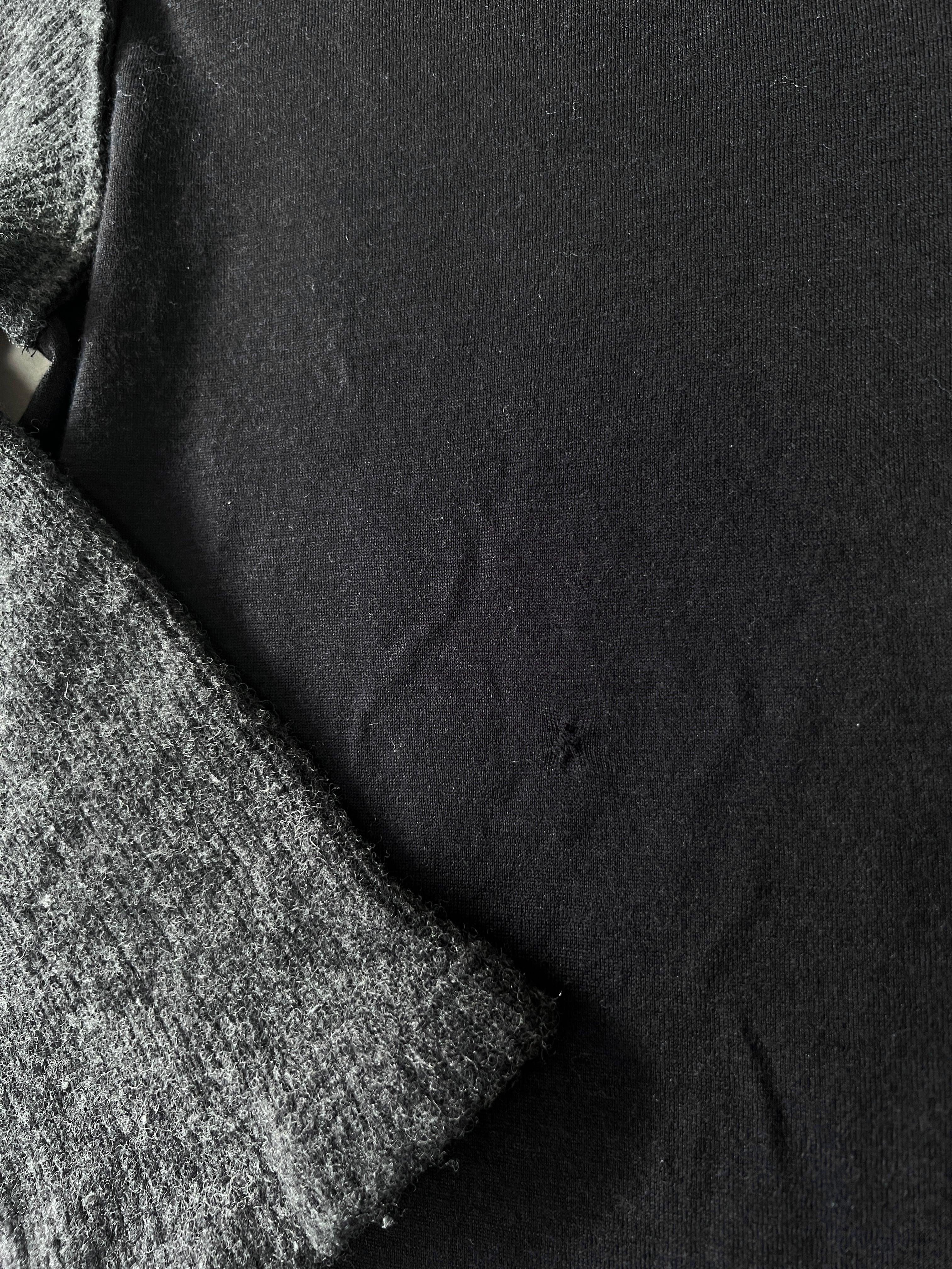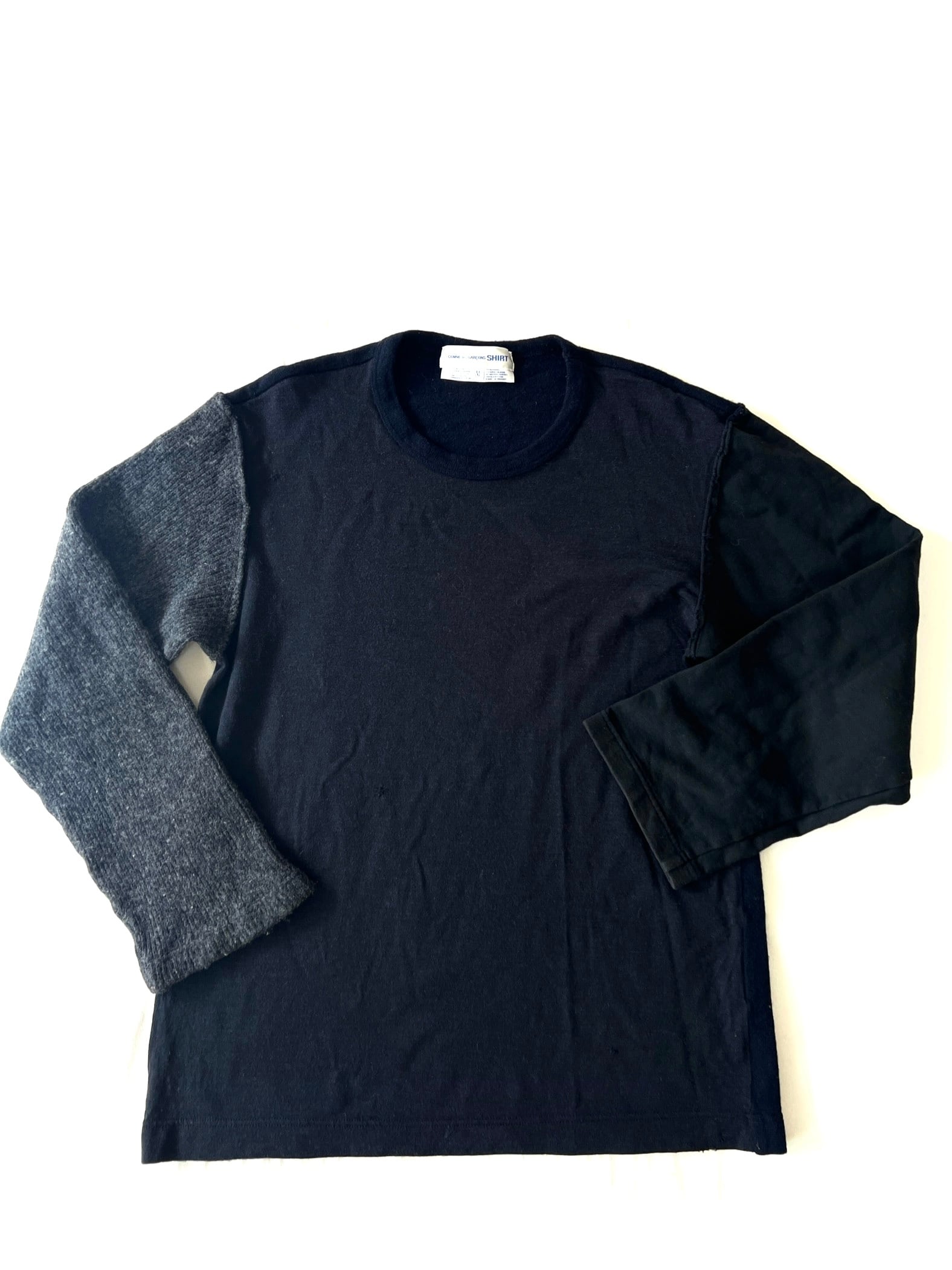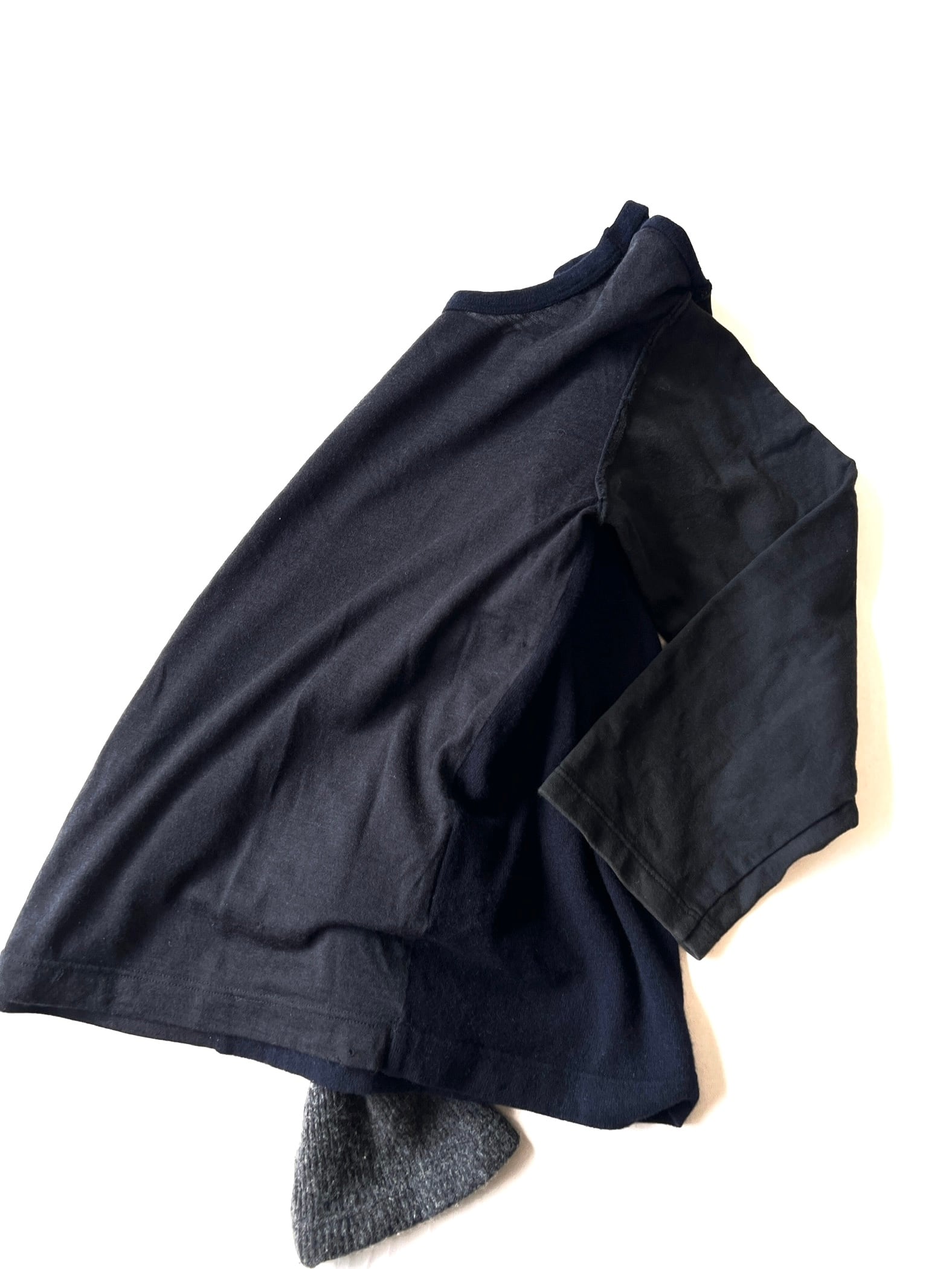 右袖はコットン天竺、左袖はリブ編みで起毛感を持つ厚手のチャコールグレーのウール。パーツ別に異なる素材で構築されたロングスリーブトップス。