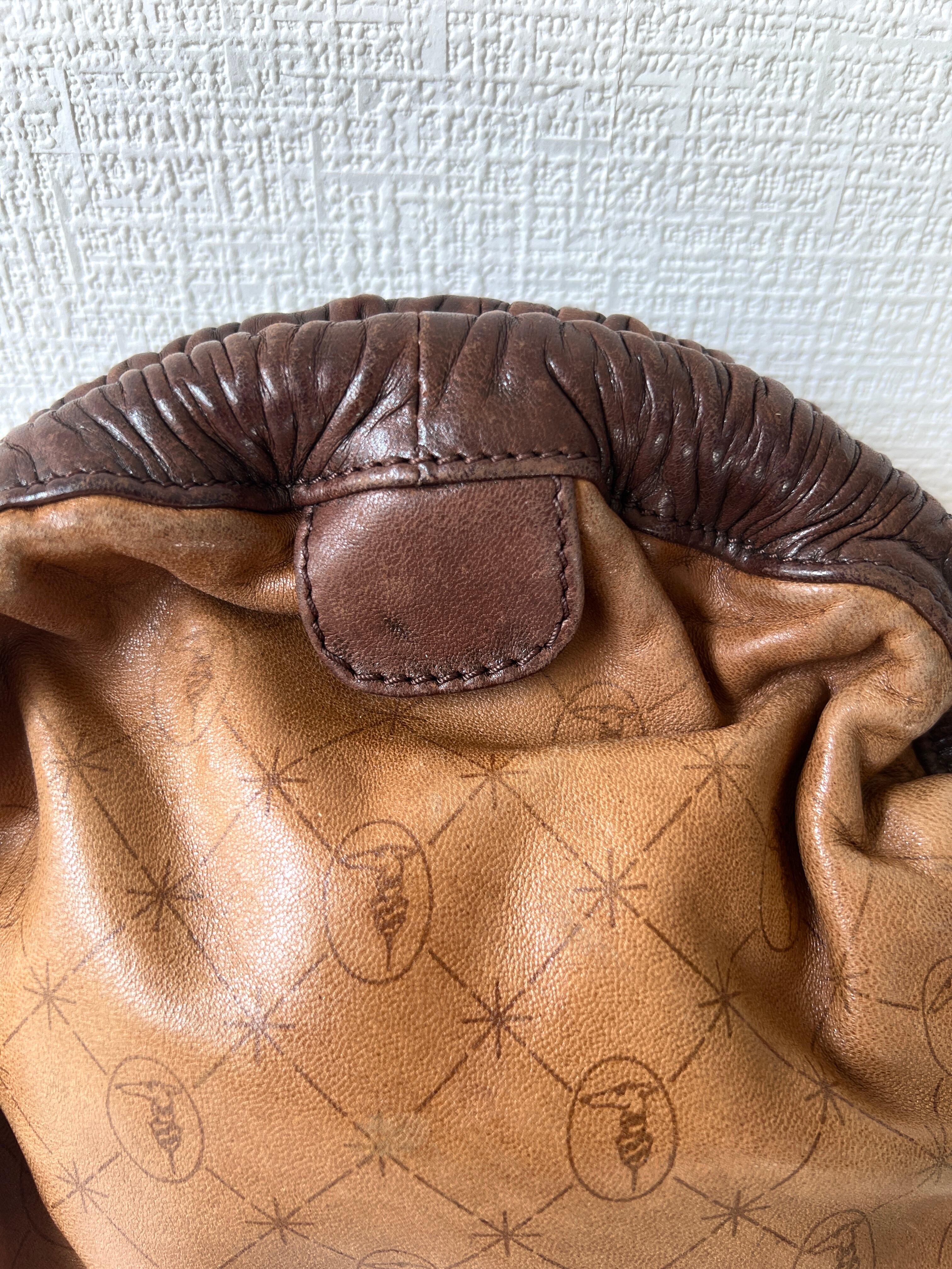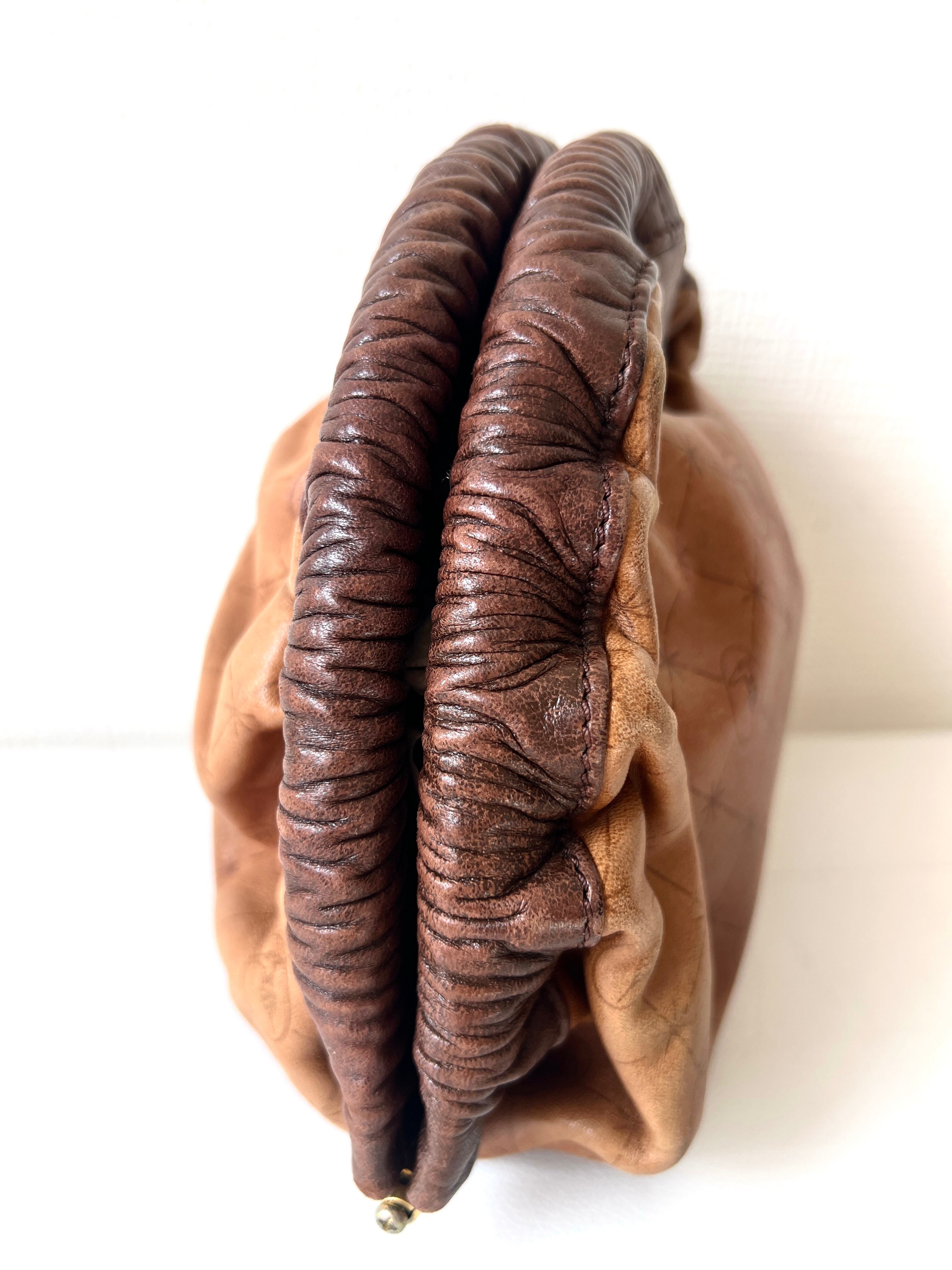 開口部とバッグの底にかけては、深いブラウンのレザーをギャザーのように寄せた、まるで甲羅のようなユニークで立体的なテクスチャー。
