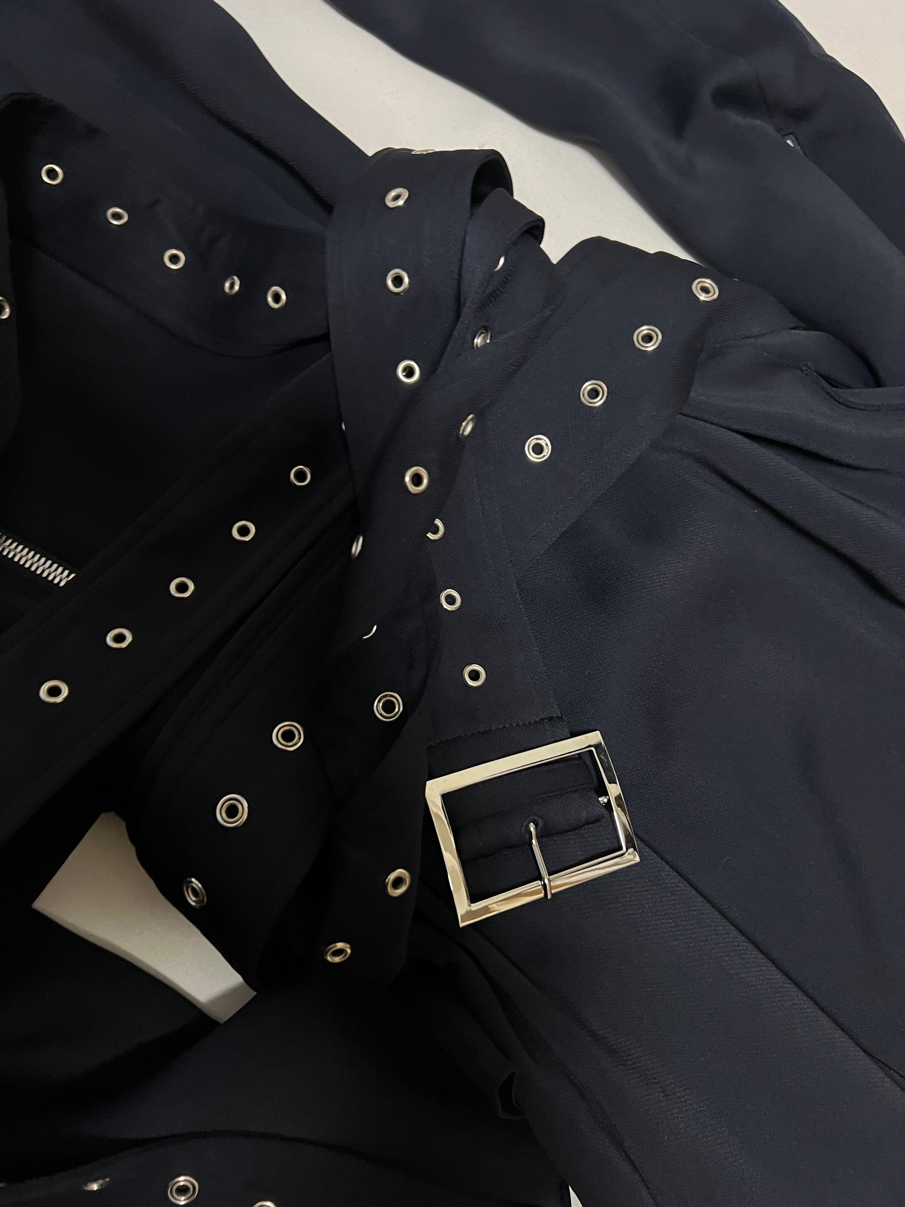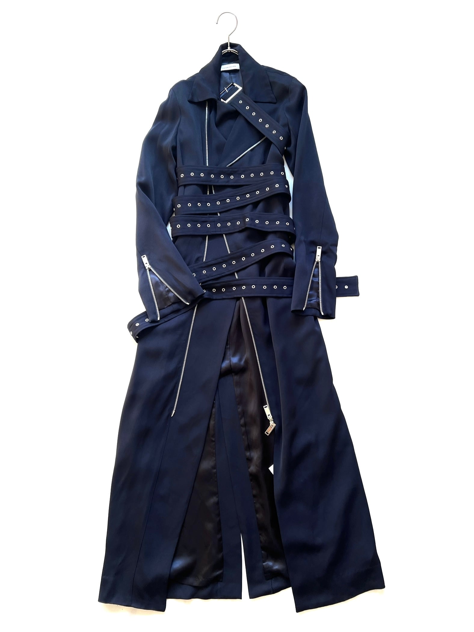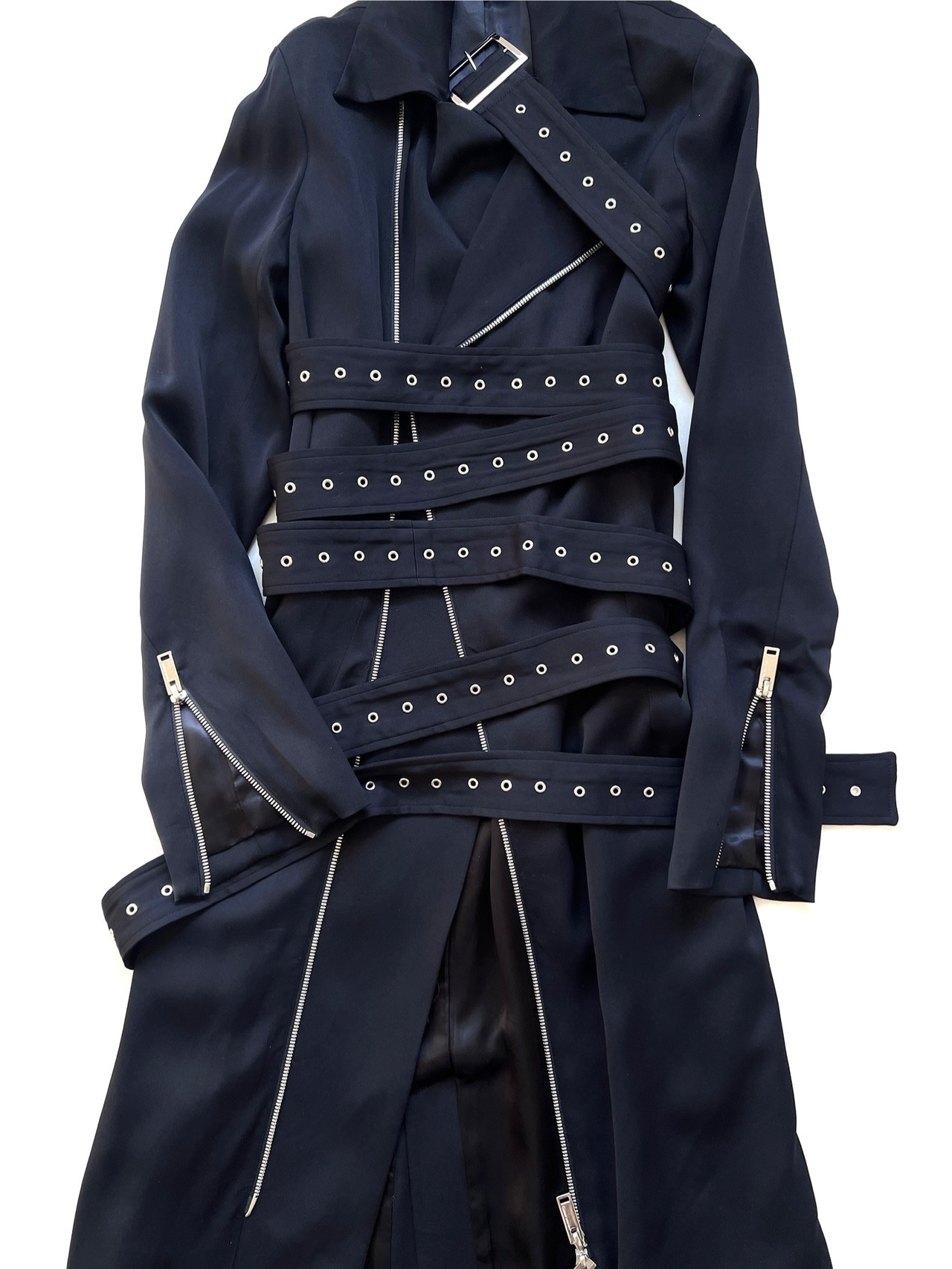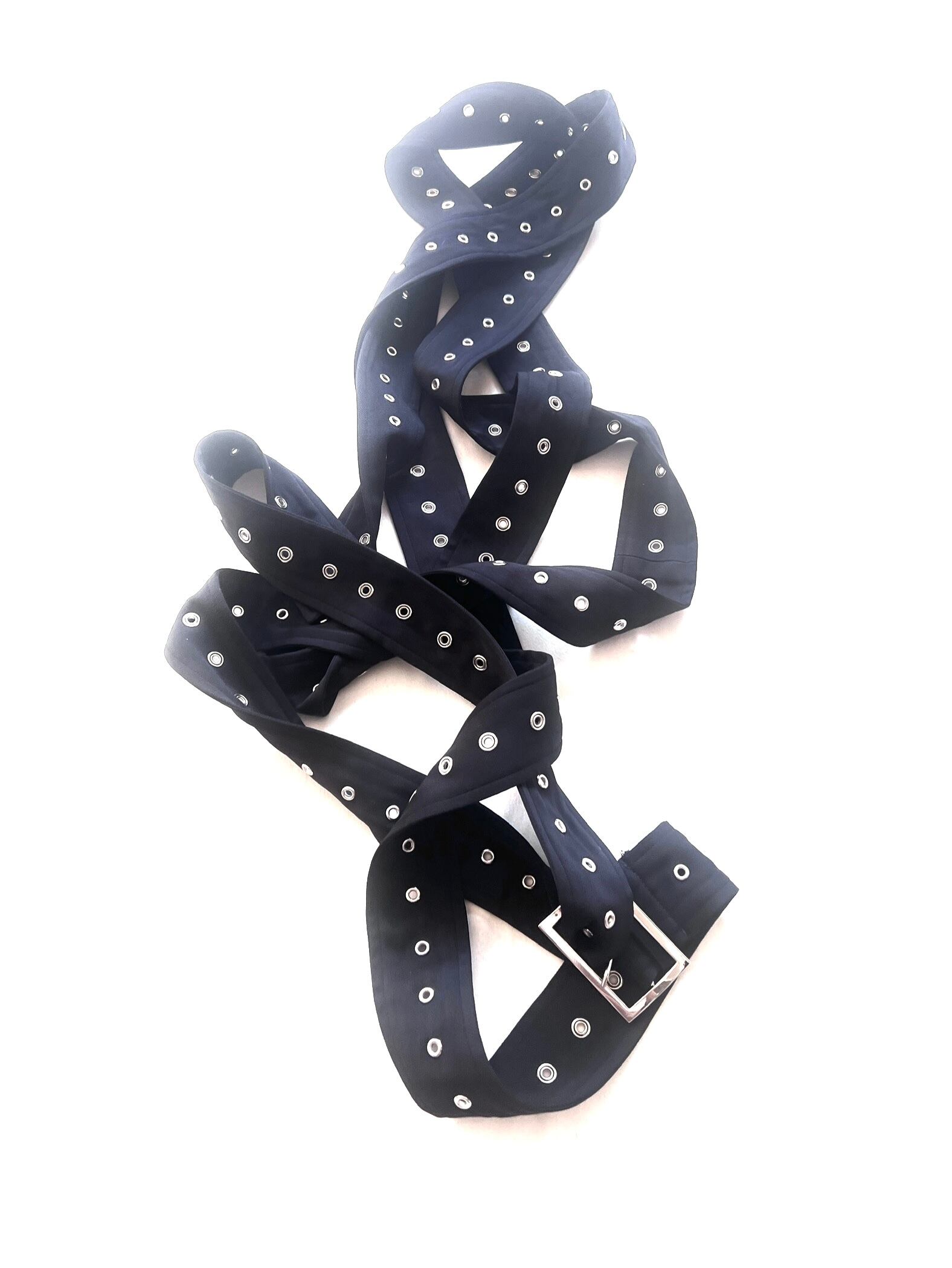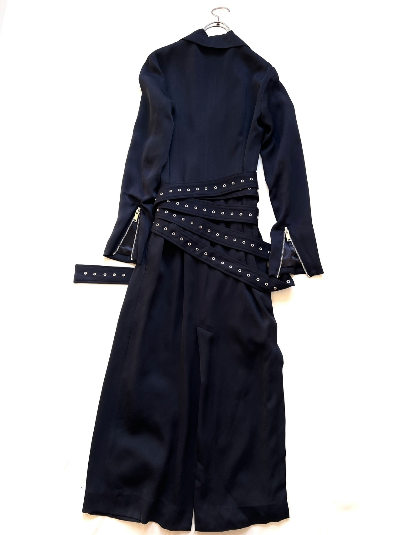 付属の超ロングベルトは自由にアレンジが可能です。ベルト一面にアイレットが施され、どの長さでも留めることができます。使用方法によって、ミニマルなドレスを一瞬でパンク/ゴシック的なムードへと変貌させてくれるとても魅力的な逸品です。