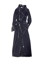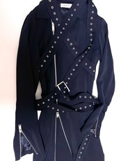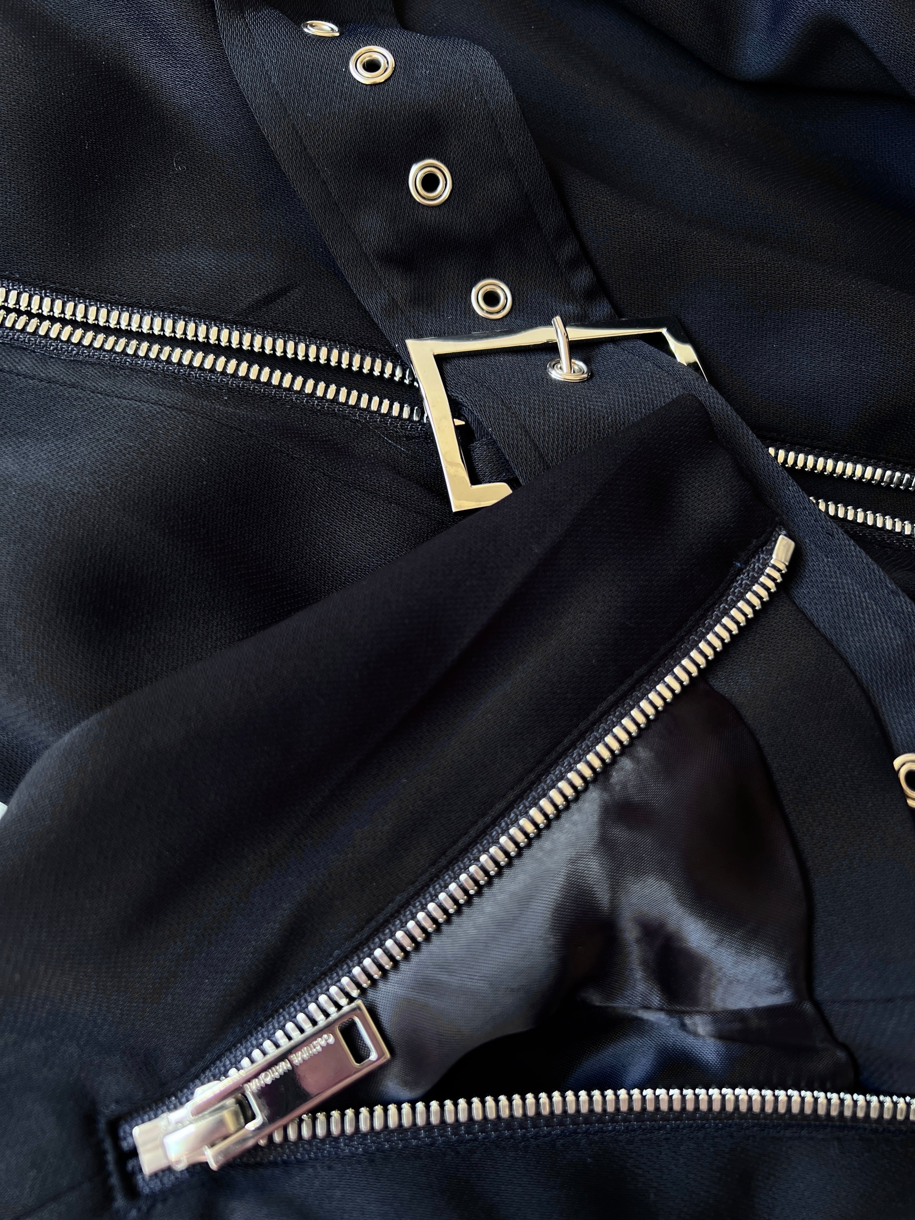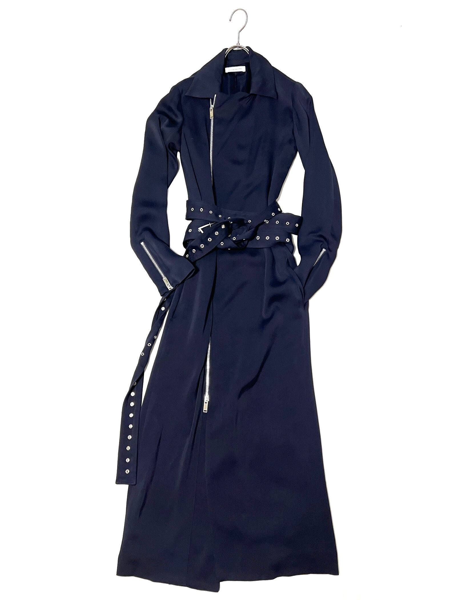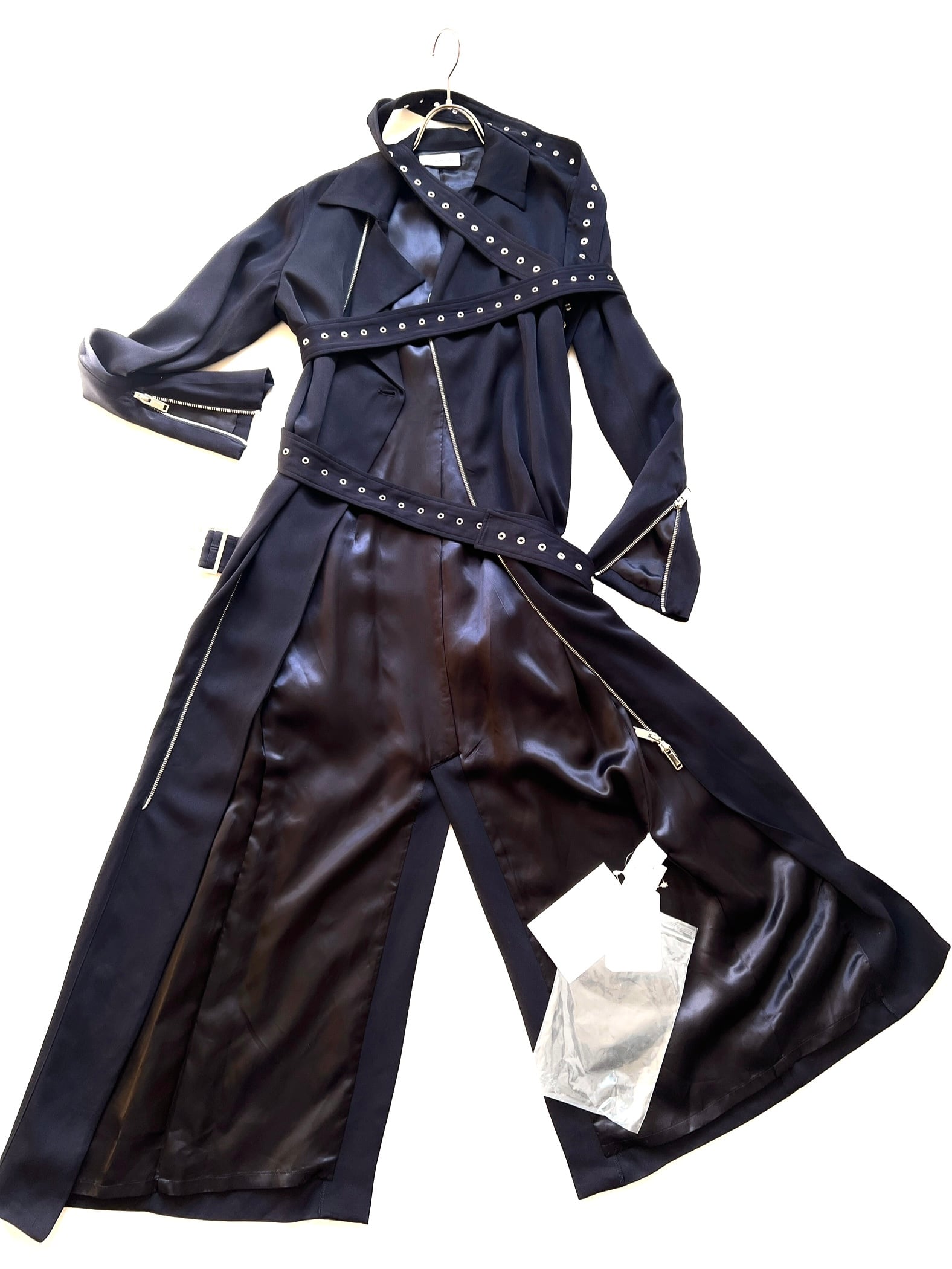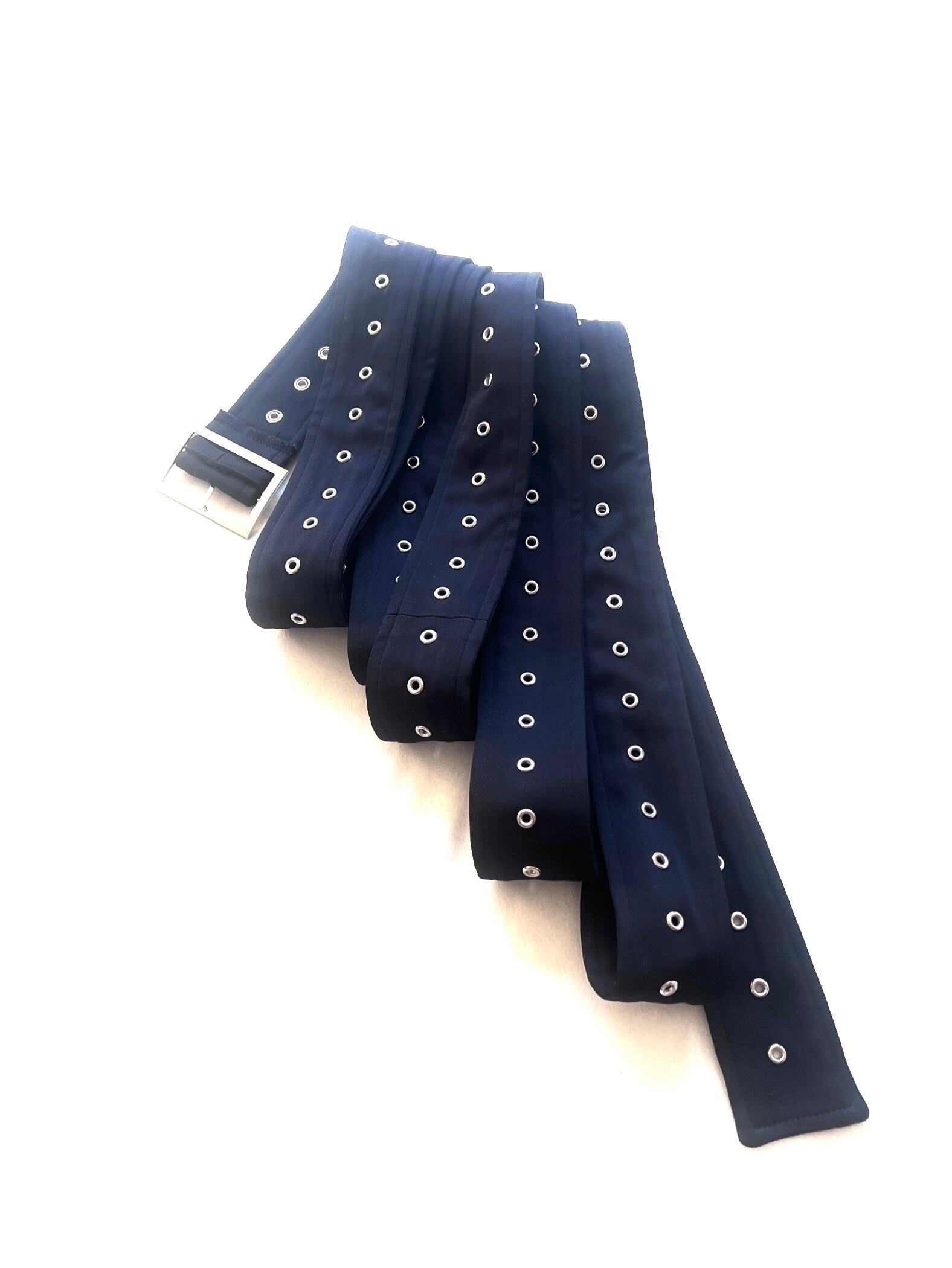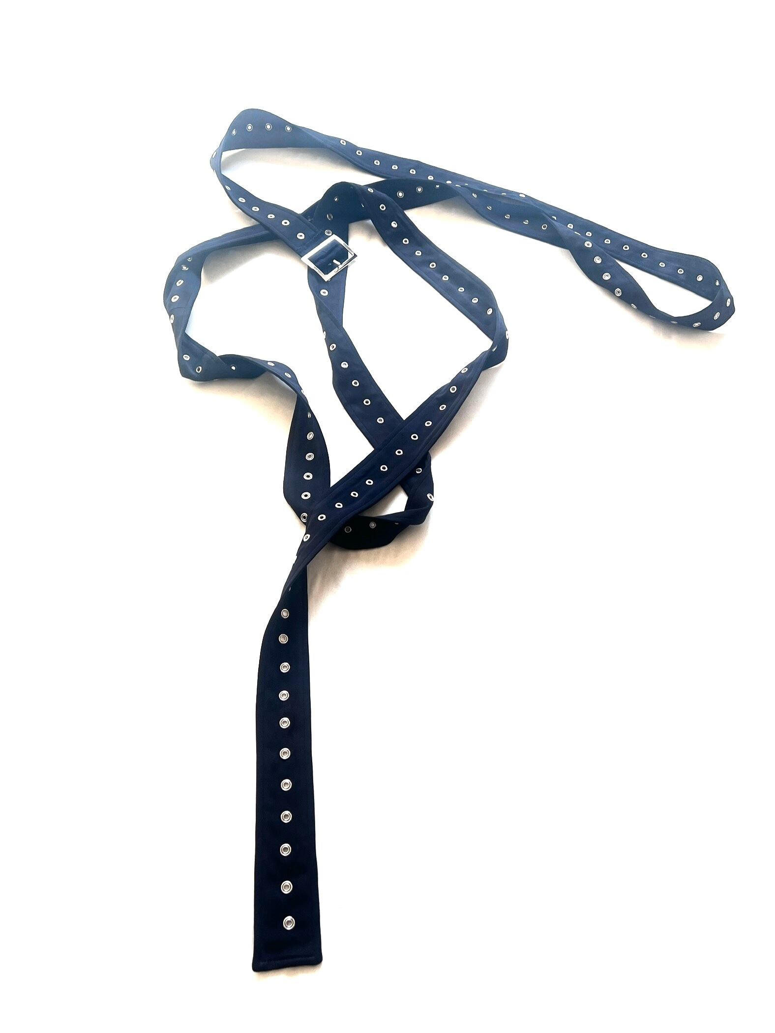 付属の超ロングベルトは自由にアレンジが可能です。ベルト一面にアイレットが施され、どの長さでも留めることができます。使用方法によって、ミニマルなドレスを一瞬でパンク/ゴシック的なムードへと変貌させてくれるとても魅力的な逸品です。
