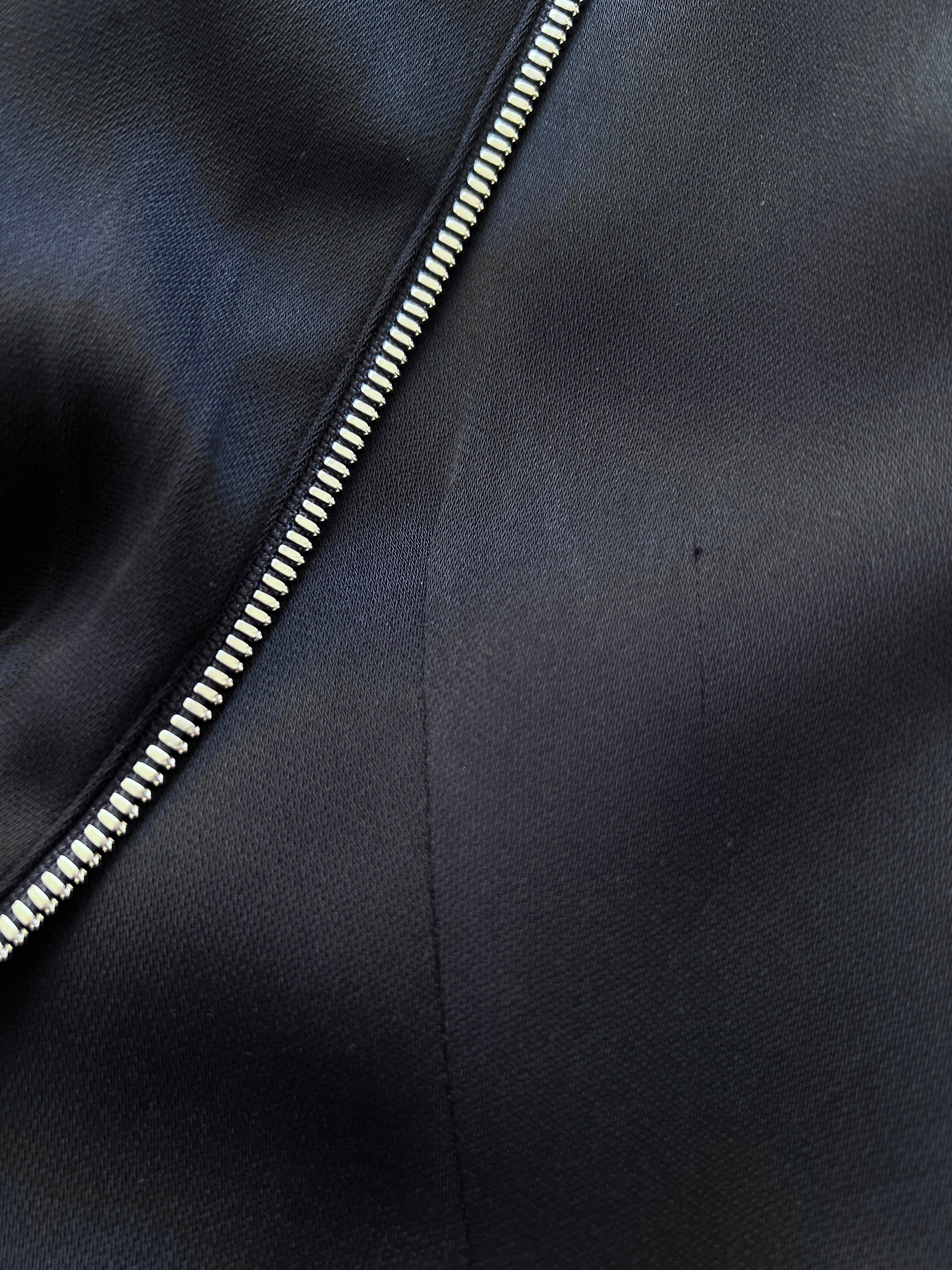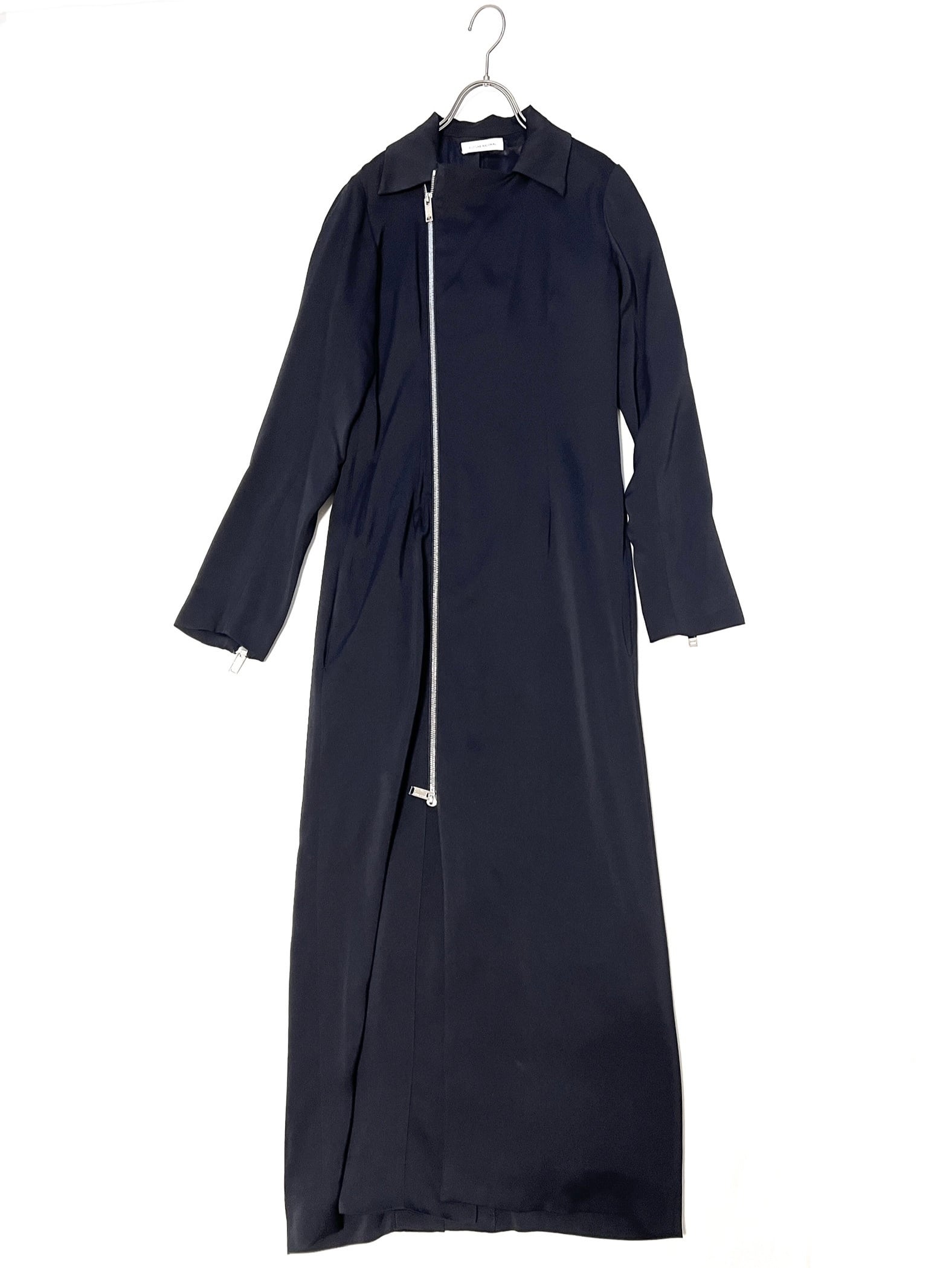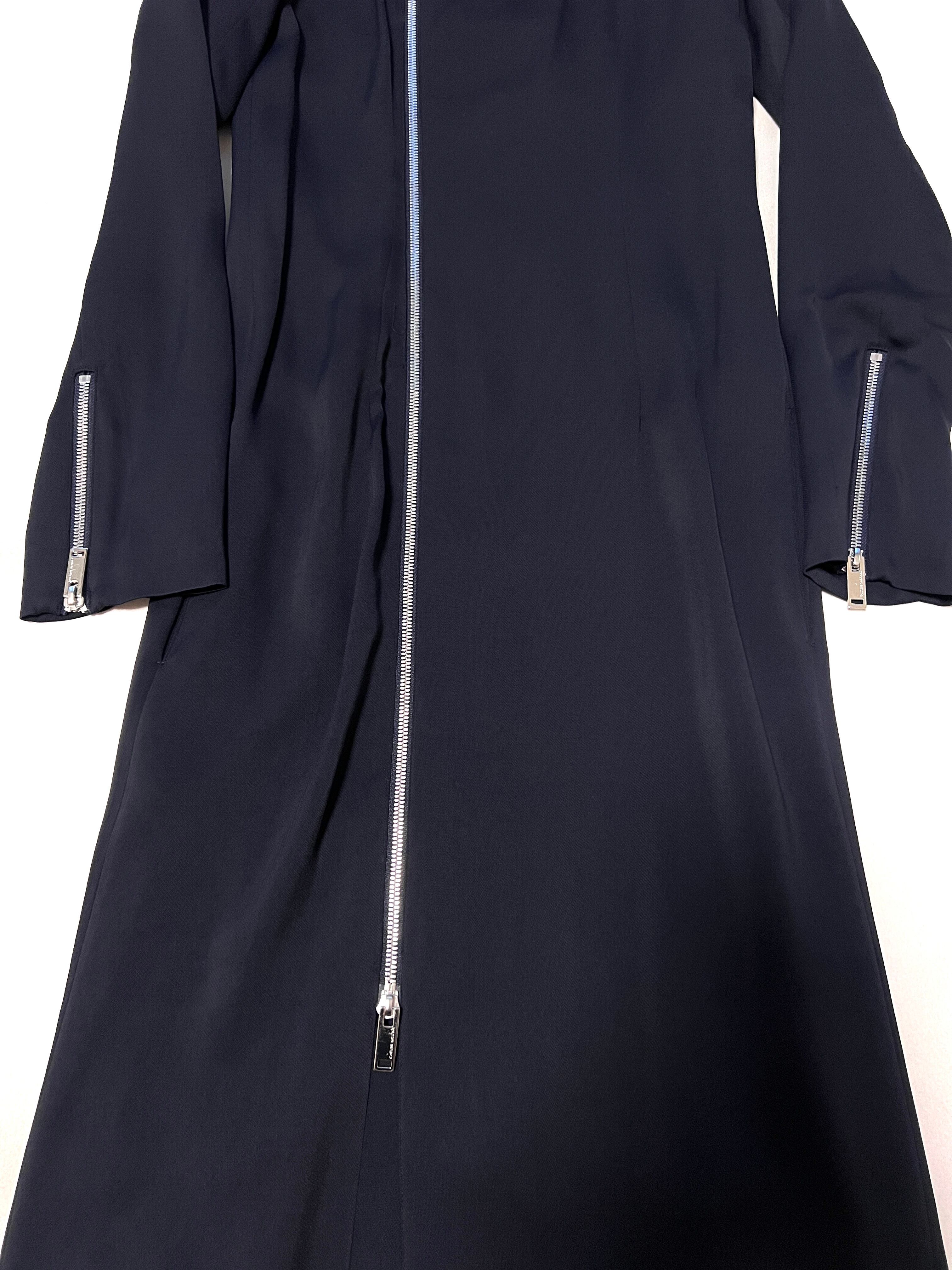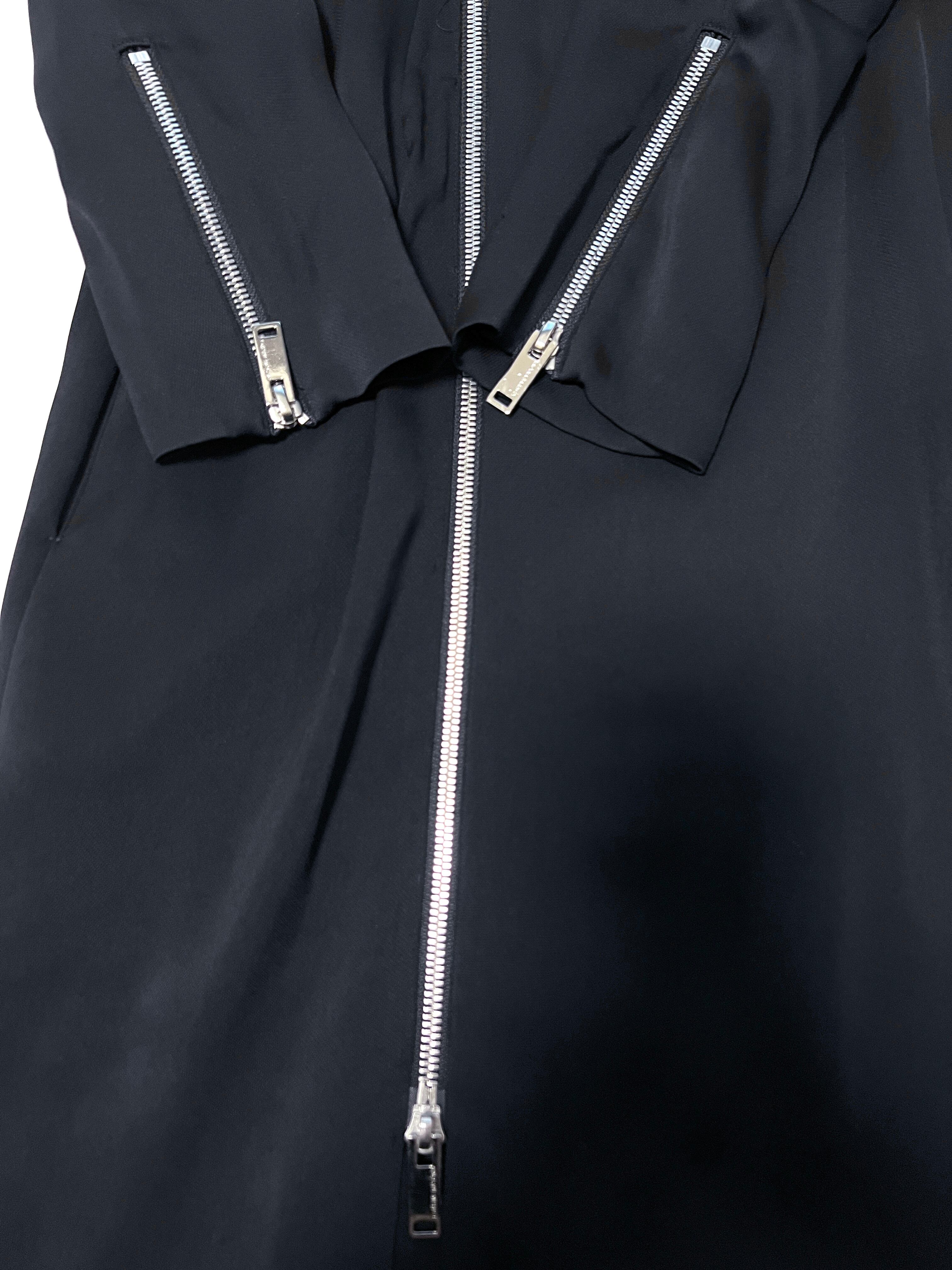 フロントの襟元から裾まで大胆に走る、ダブルブレストライダースのようなフルジップデザイン。ジップの開閉によって、シルエットや表情を大きく変化させてくれます。