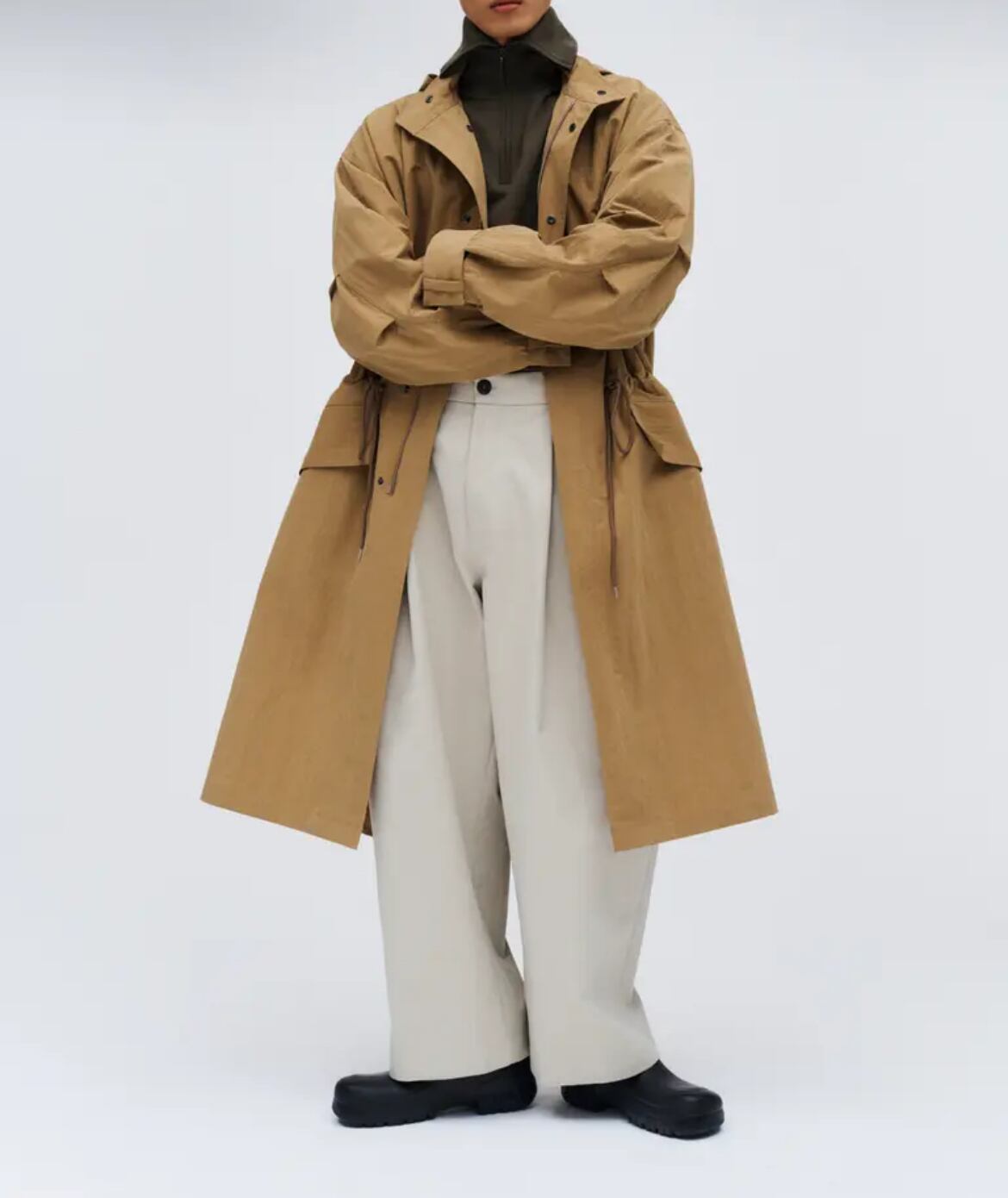 腰回りはスッキリしながら、太腿から大きくボリュームを出した独特なシルエットが目を惹きます。