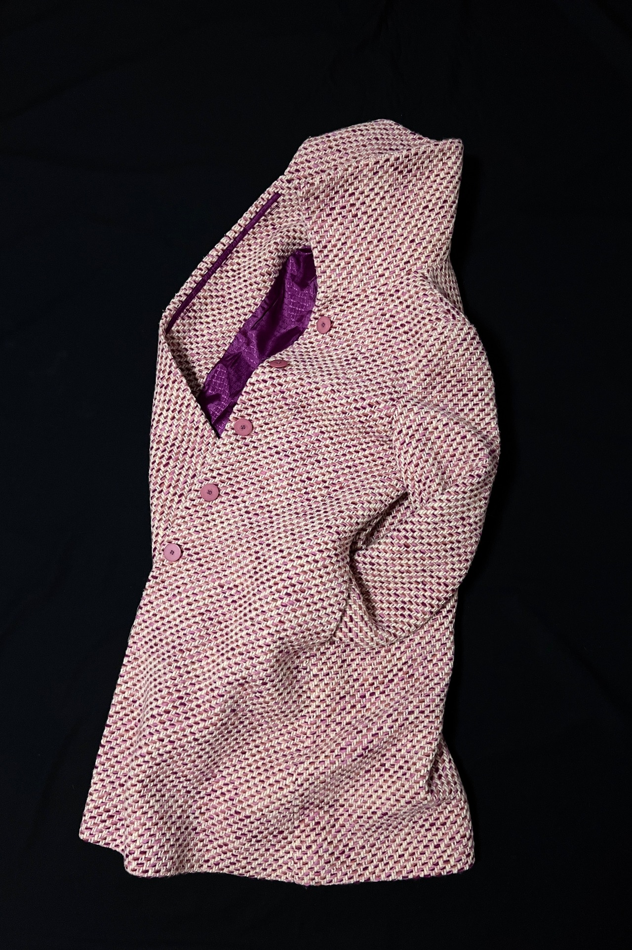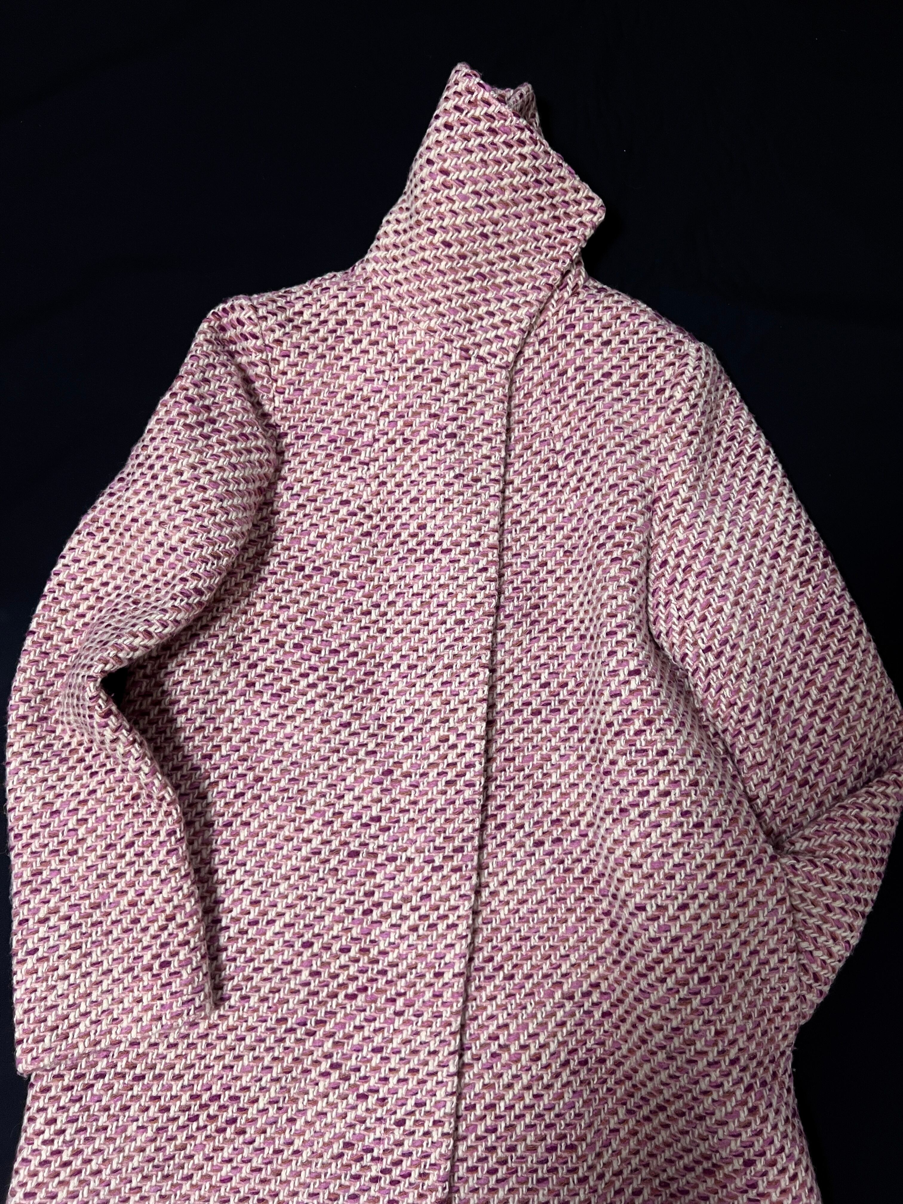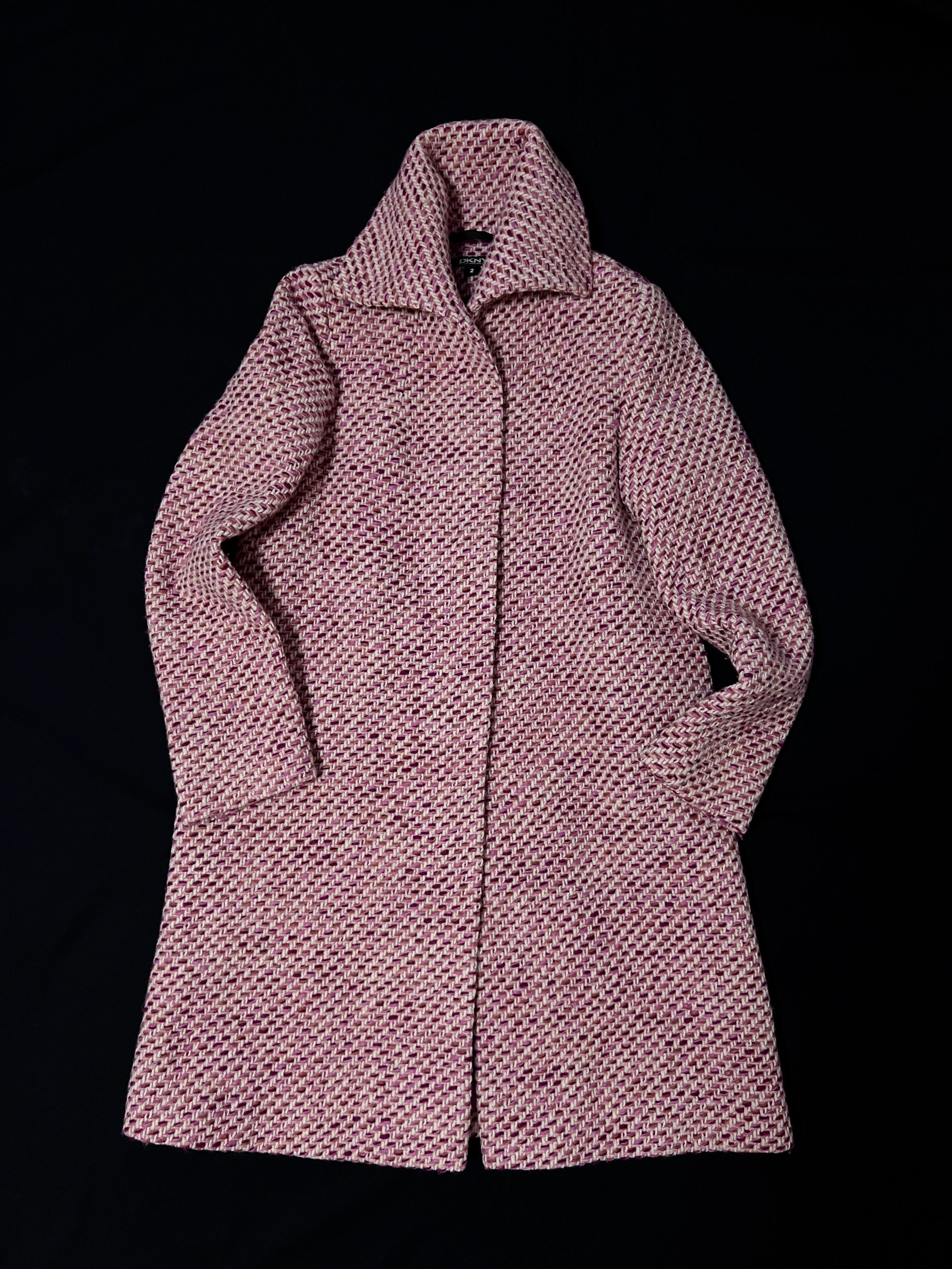 鮮やかなパープルやワインレッドの糸が織り込まれた美しいミックスツイード素材。立体感のある織り地は非常に表情豊かで、シンプルながらも着こなしの主役になる存在感を放ちます。