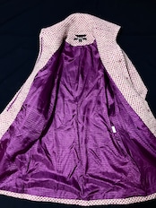 首元を暖かく包み込むエレガントで構築的なショールカラーと、優雅なAラインシルエット、裏地は鮮やかなパープルカラーで、さりげないブランドロゴの織り柄入りです。