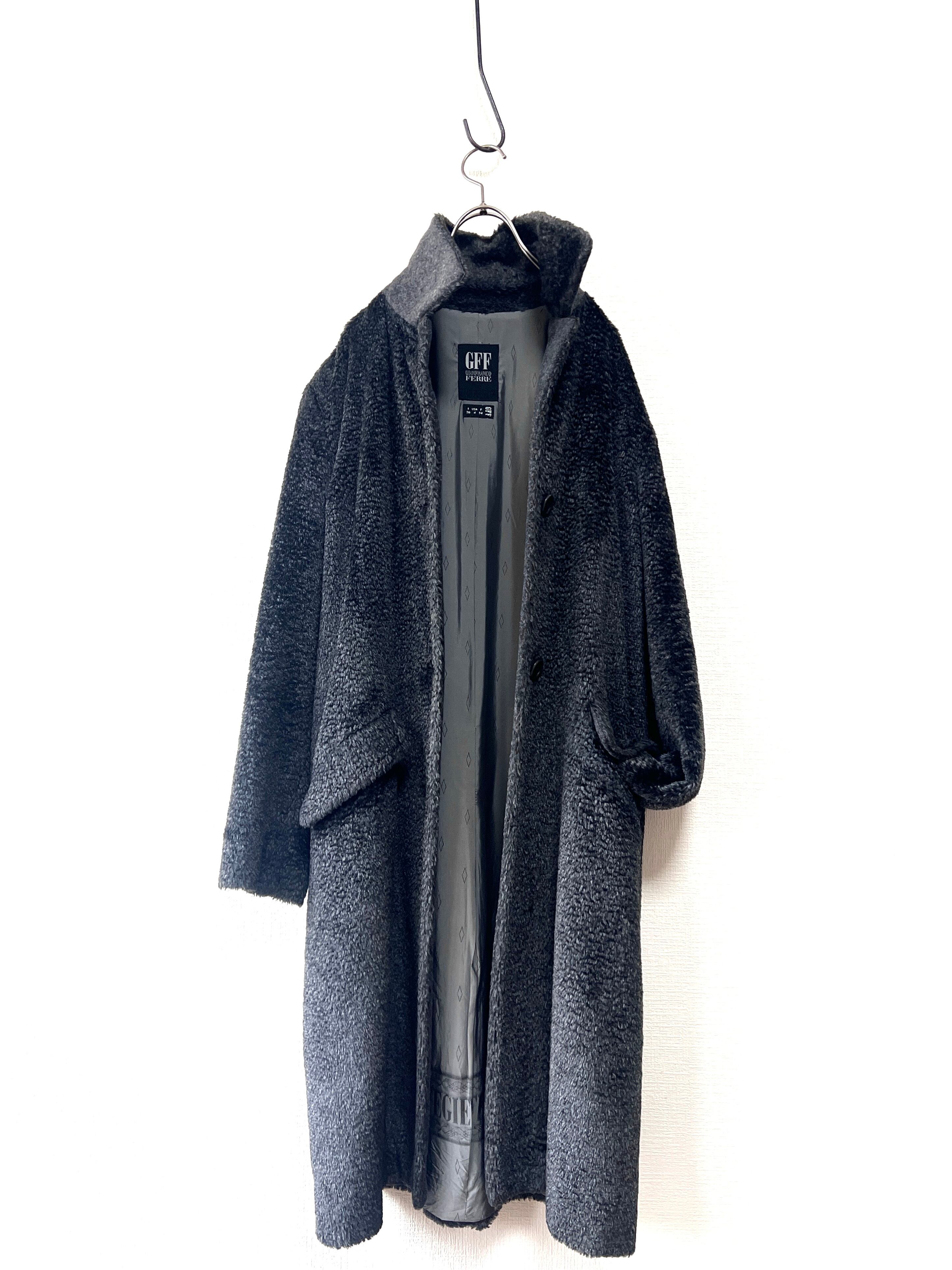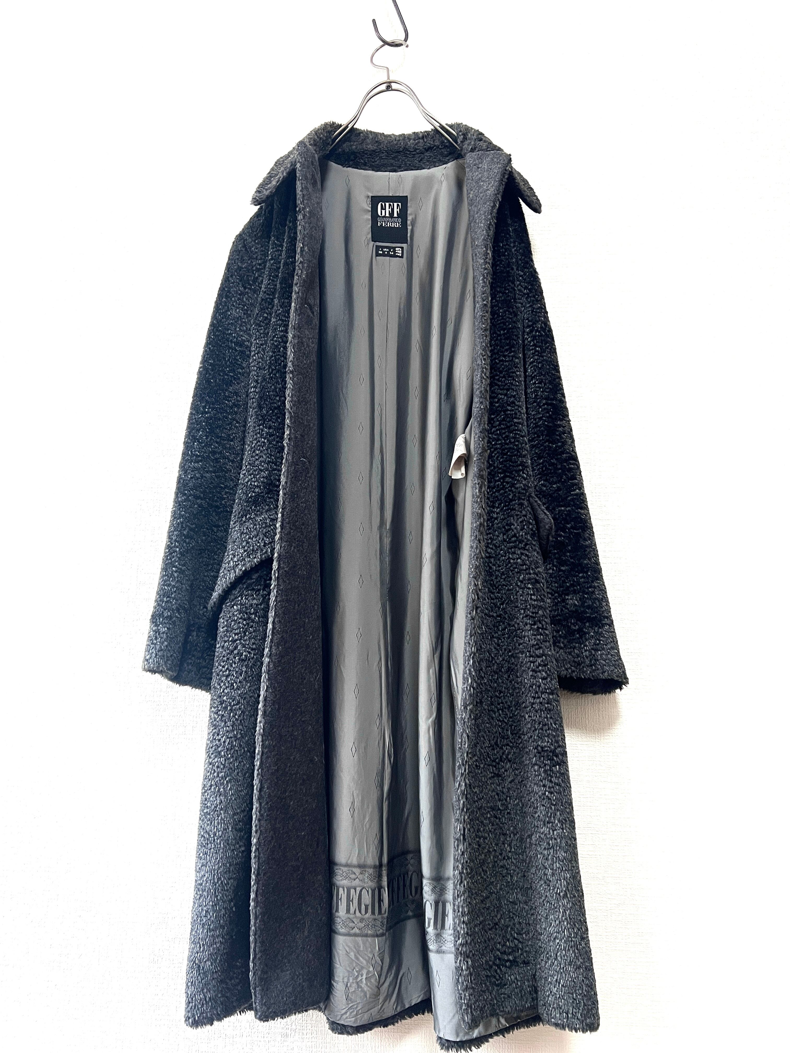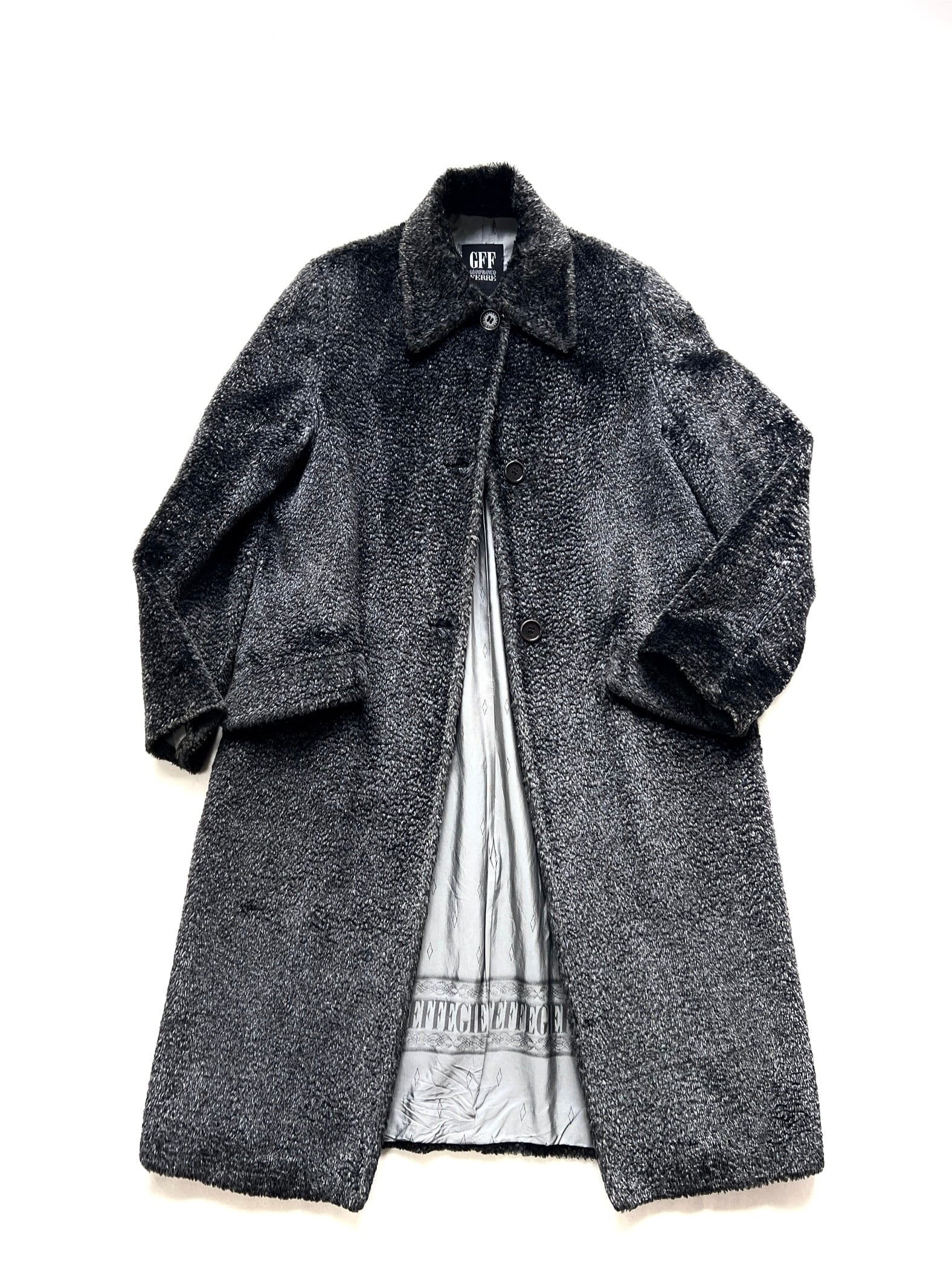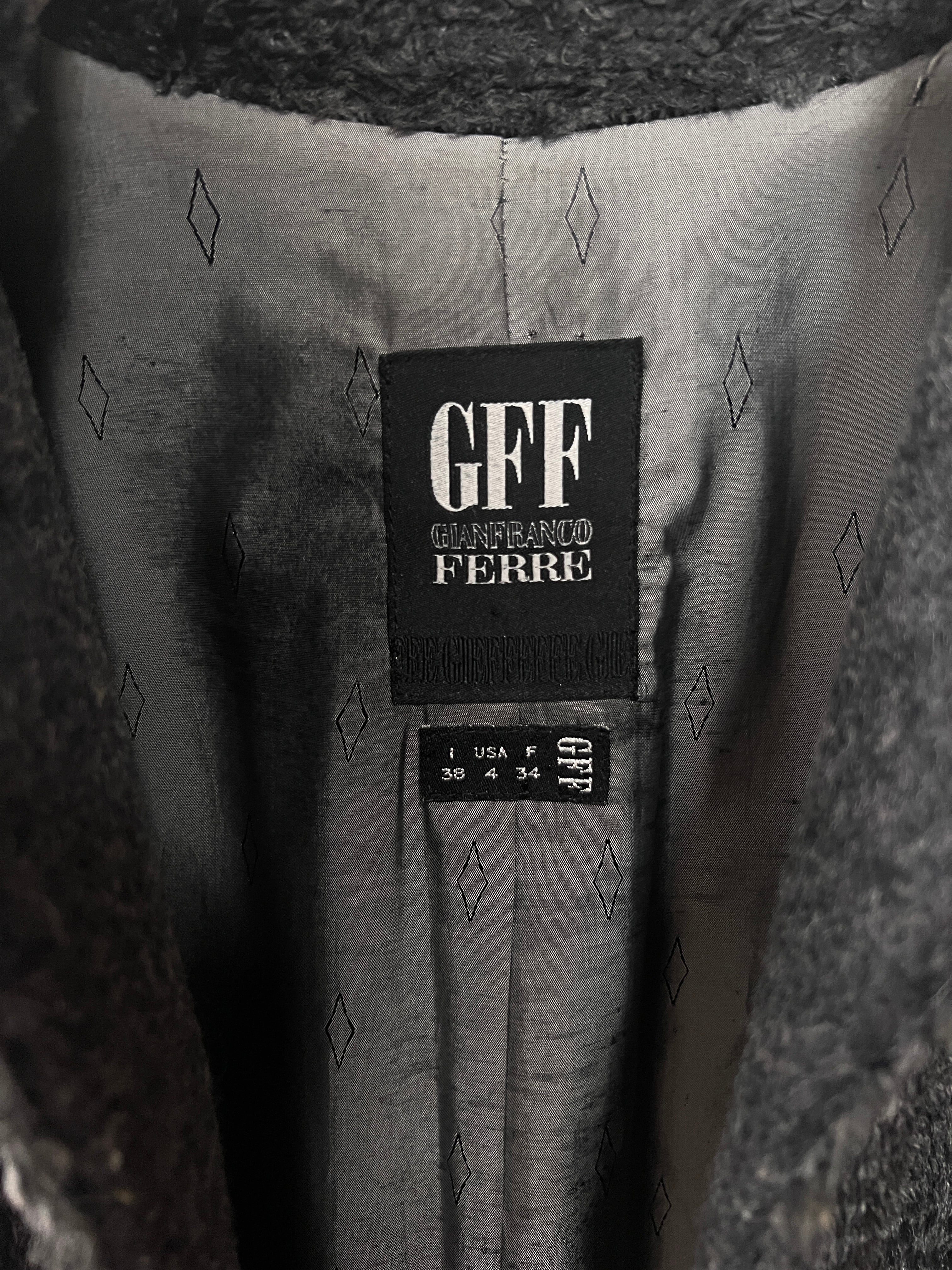 計算された美しいシルエットに、裏地の'GFF FERRE" の文字が連続するボーダーデザイン、ボタンに刻印されたロゴも、当時のラグジュアリーブランドならでは端正な作り。