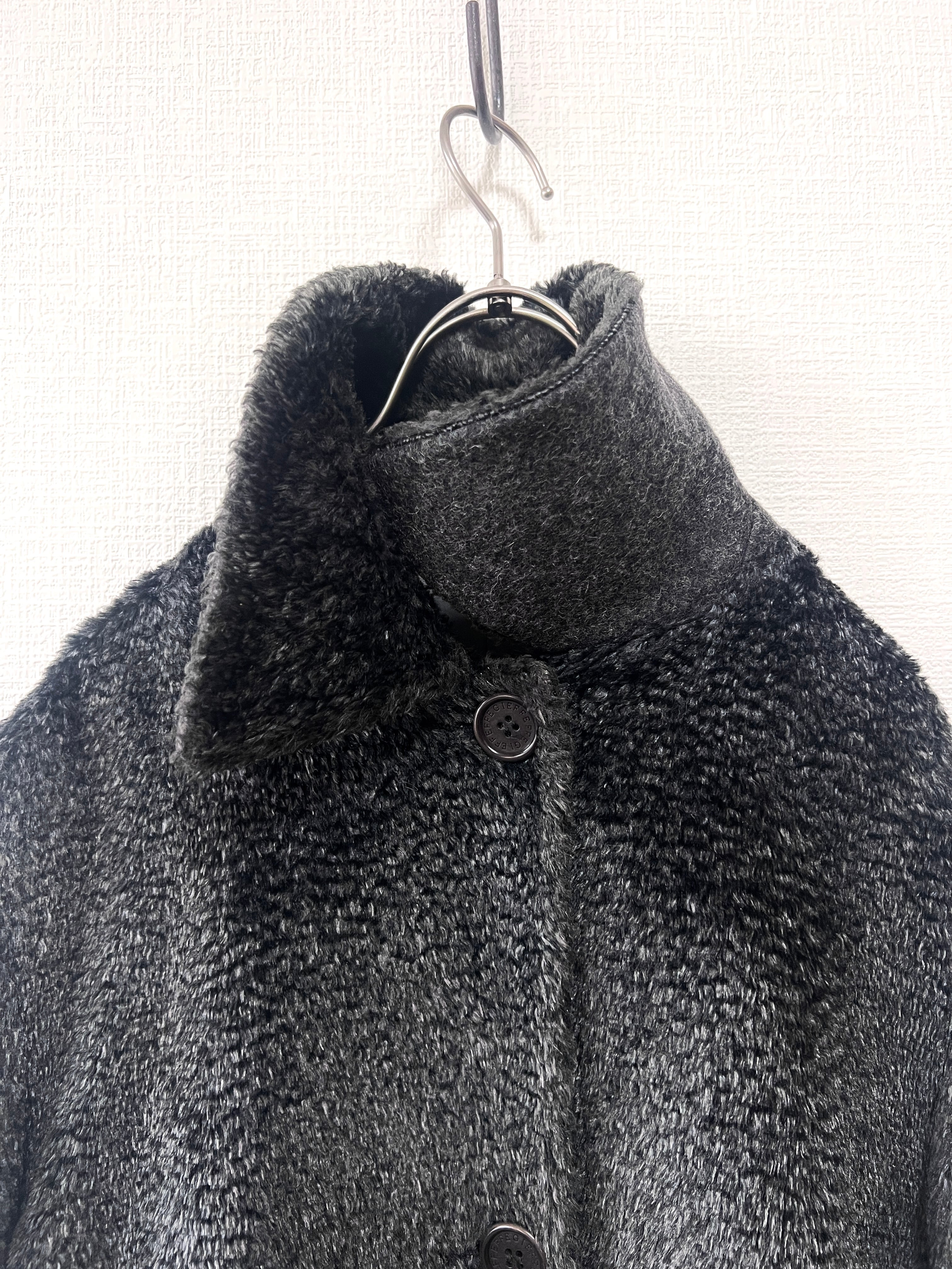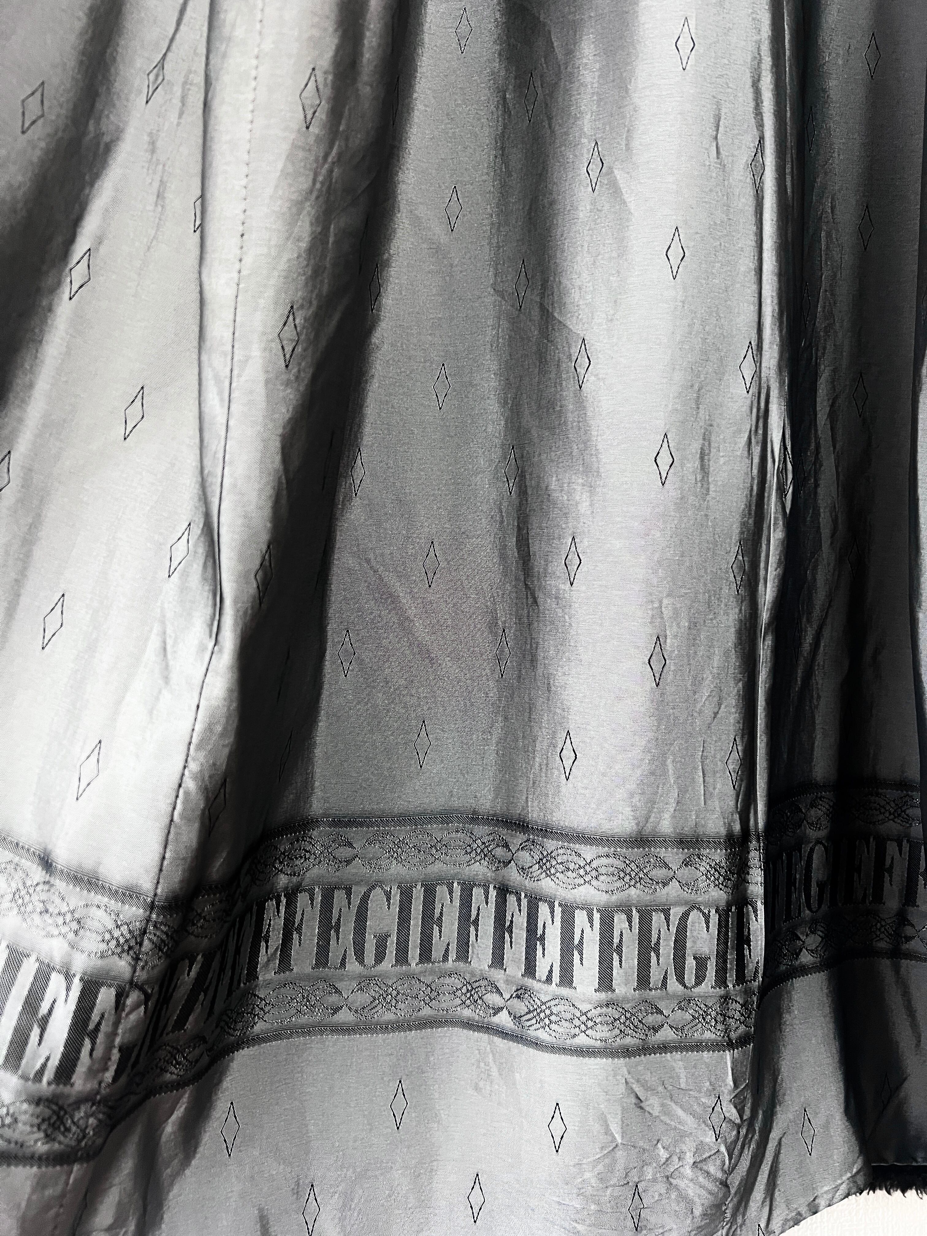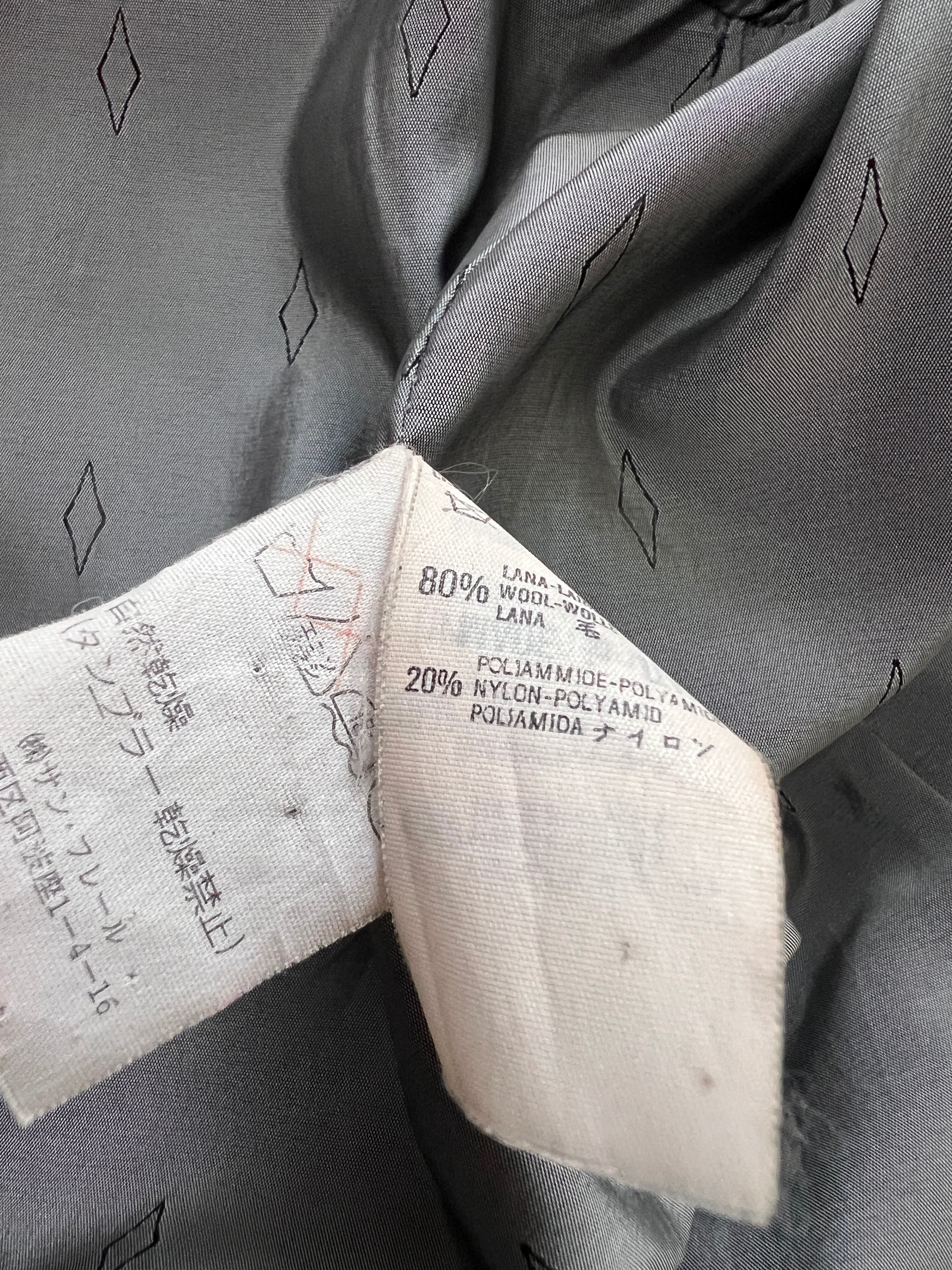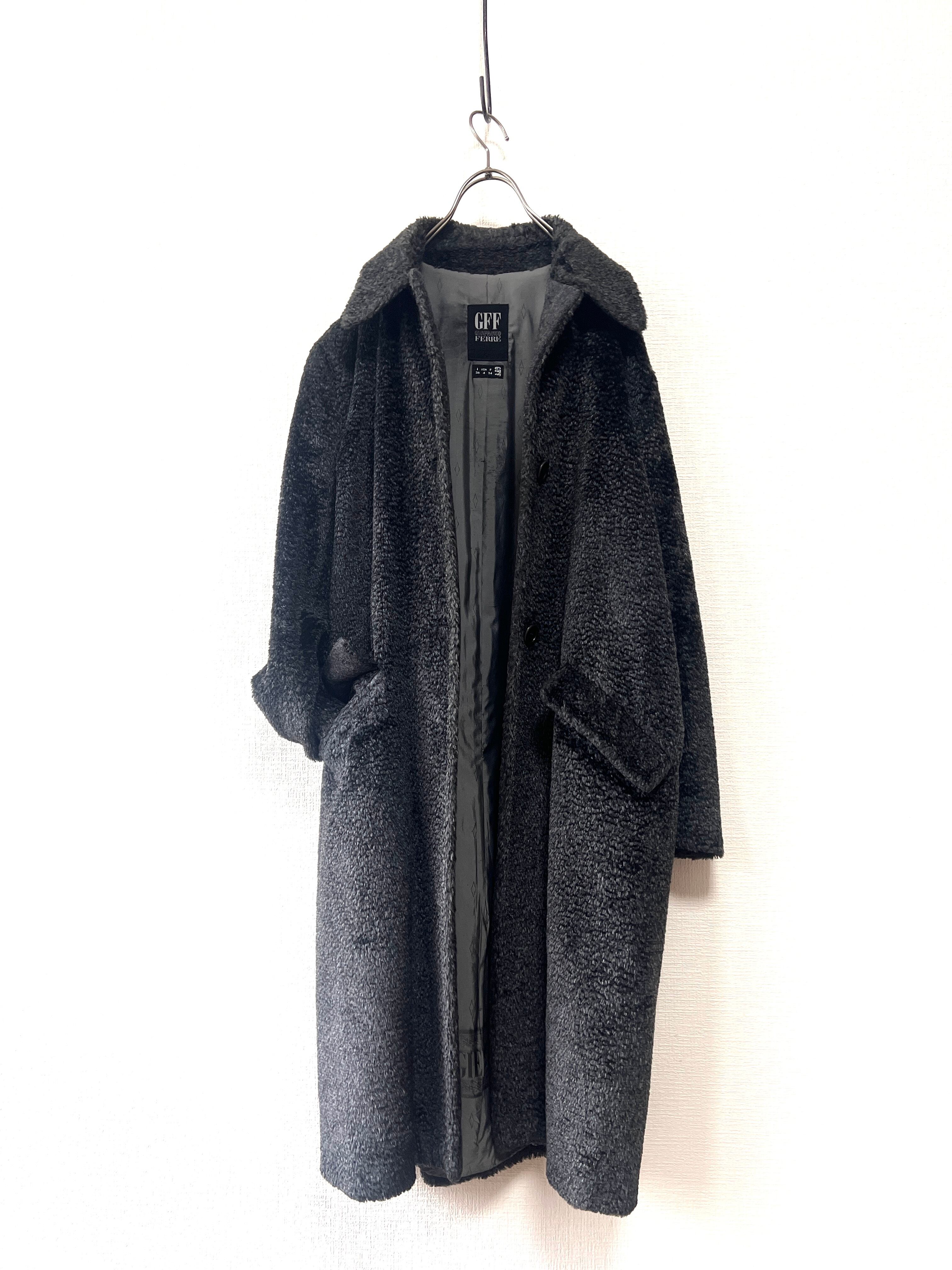 計算された美しいシルエットに、裏地の'GFF FERRE" の文字が連続するボーダーデザイン、ボタンに刻印されたロゴも、当時のラグジュアリーブランドならでは端正な作り。