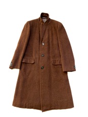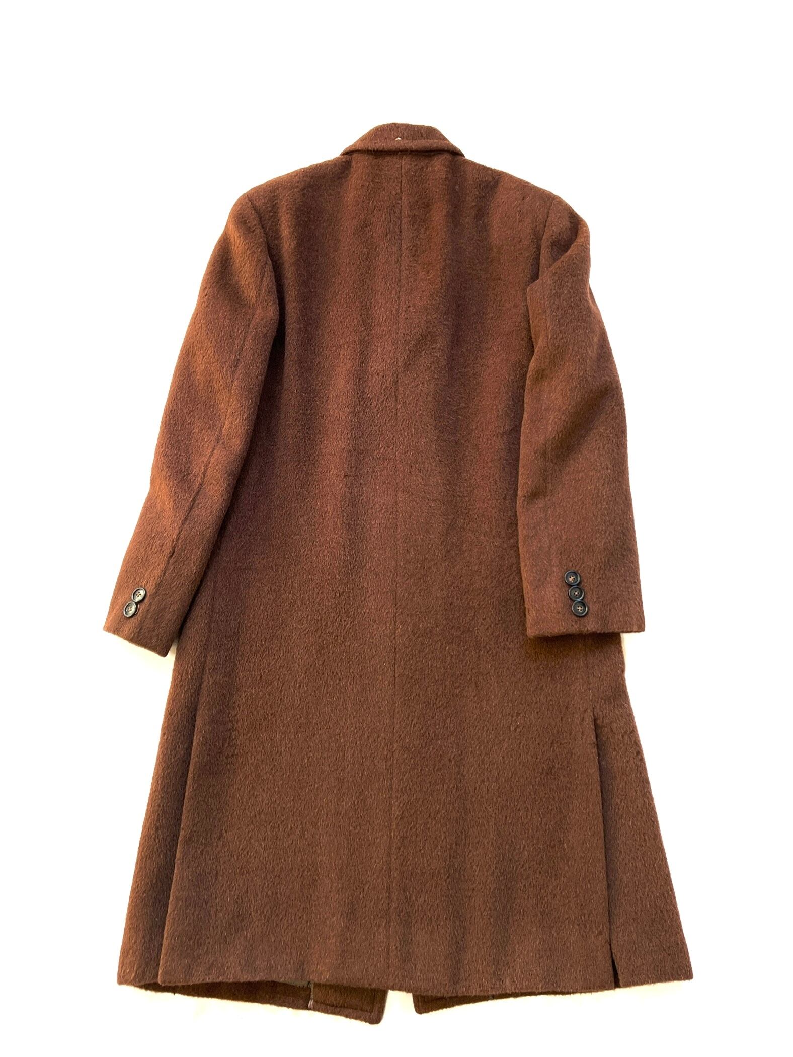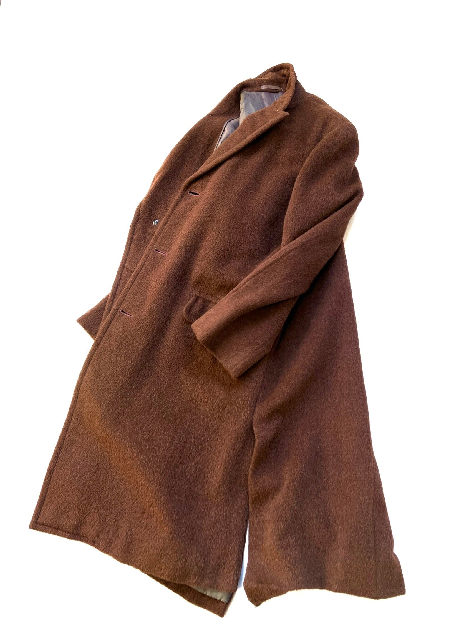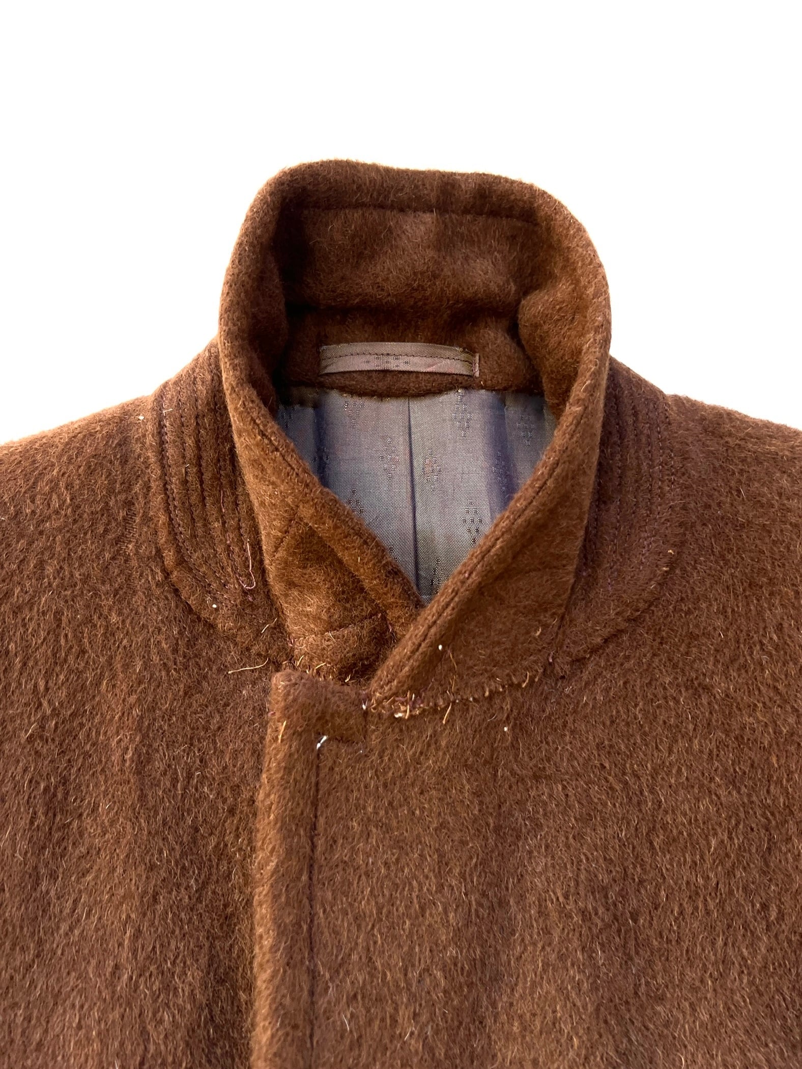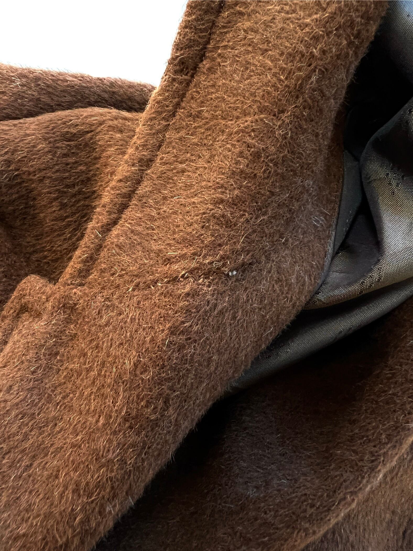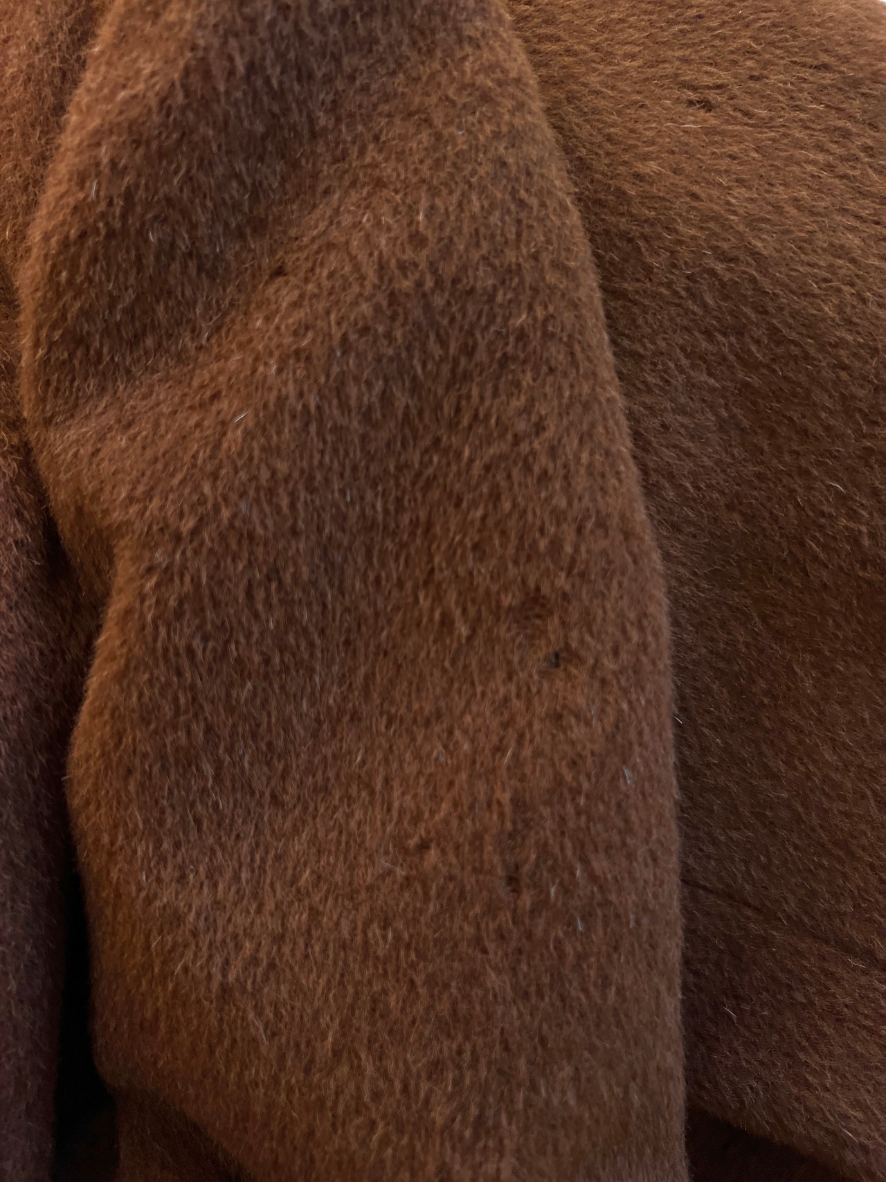 豊かなチョコレートブラウンのアニマルファーのような起毛感(おそらくモヘアやアルパカなどが考えられます)を持つ、ふっくらとした上質な素材。