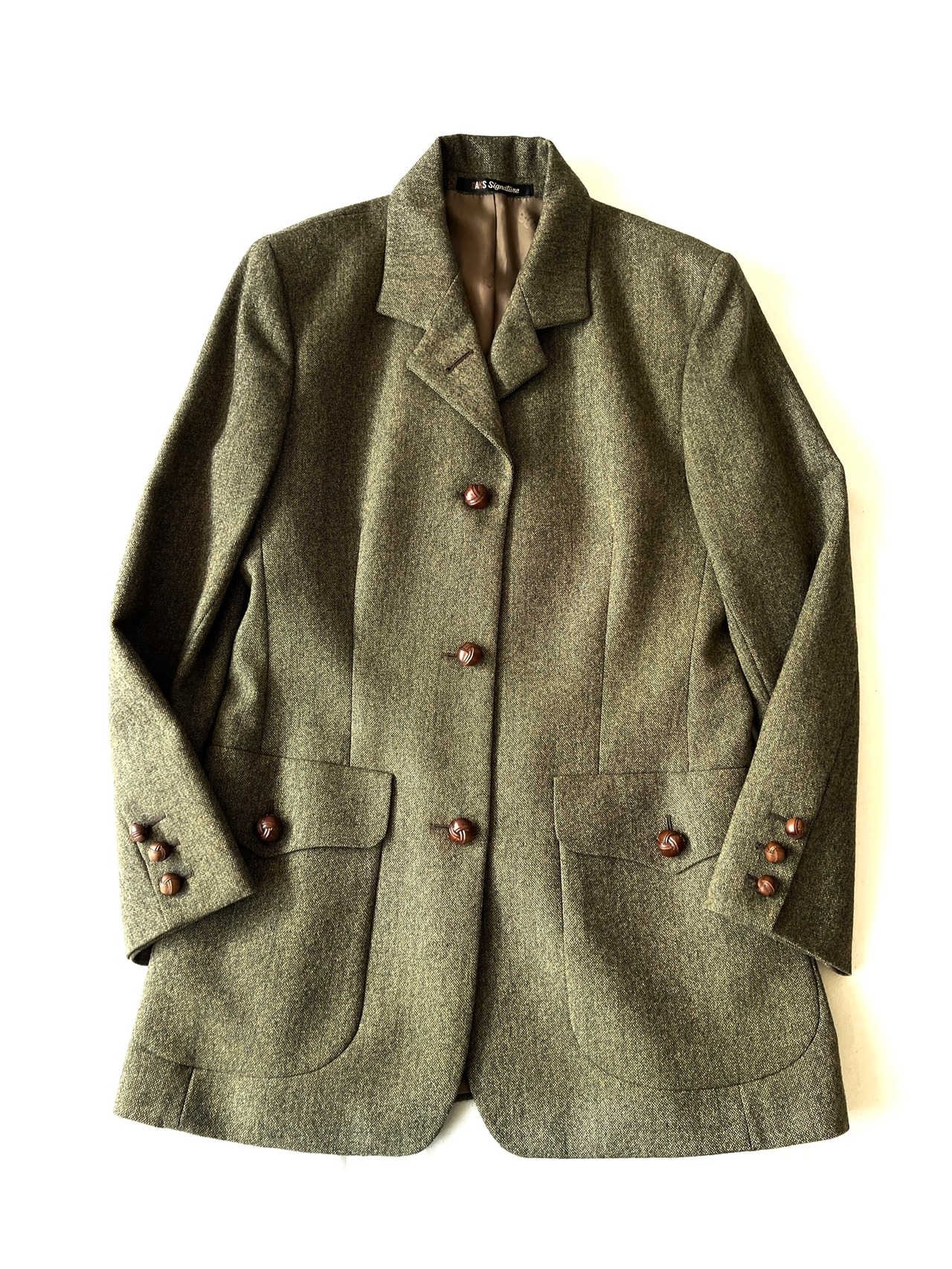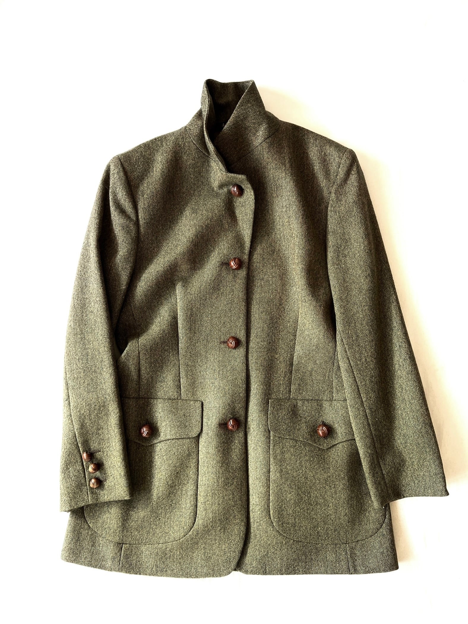 袖とフロントにはしっかりとした茶色の編み込みレザーボタン、丸みを帯びたフラップ付きのパッチポケットなど特徴的なディテールが目を惹きます。
