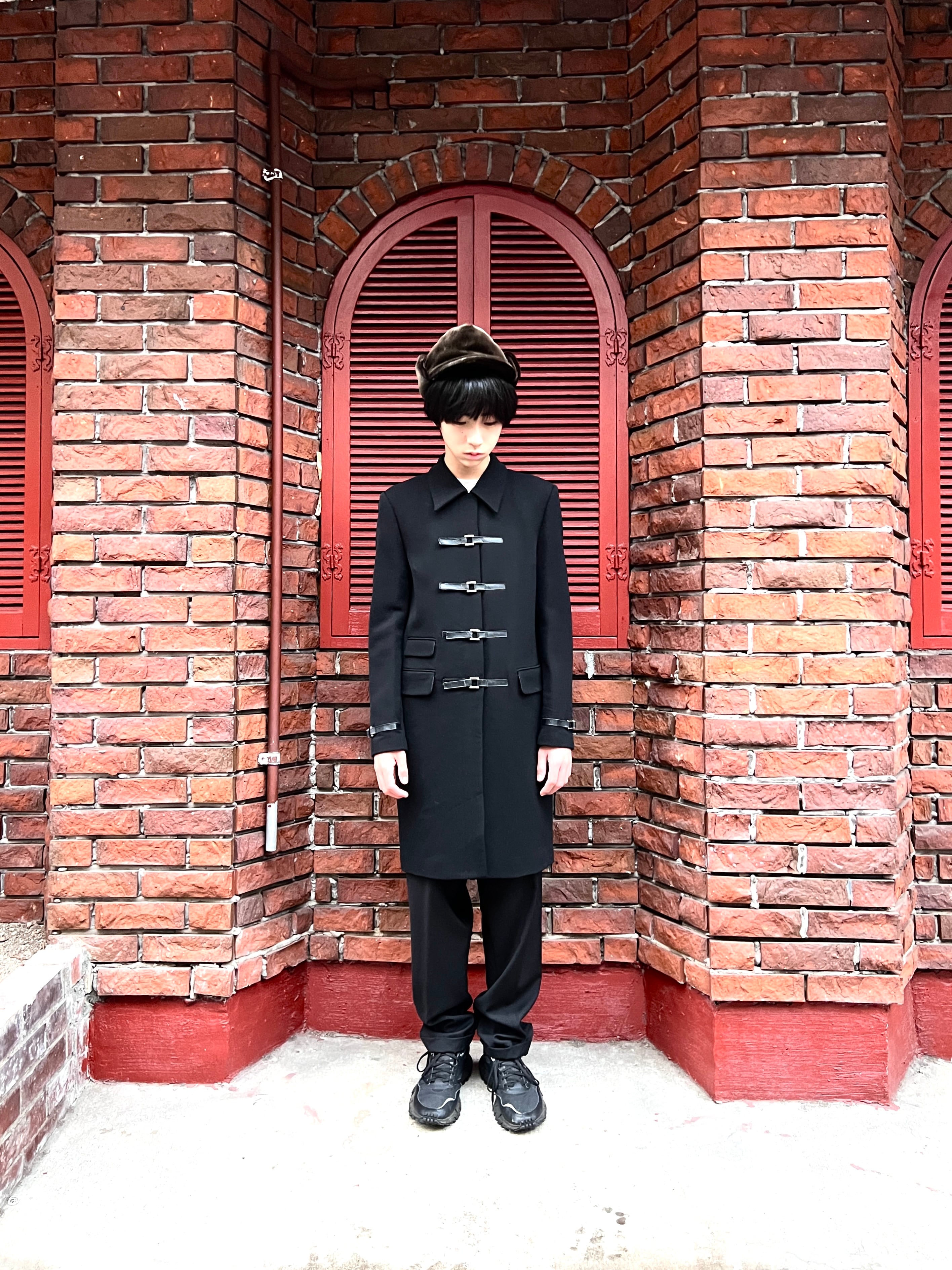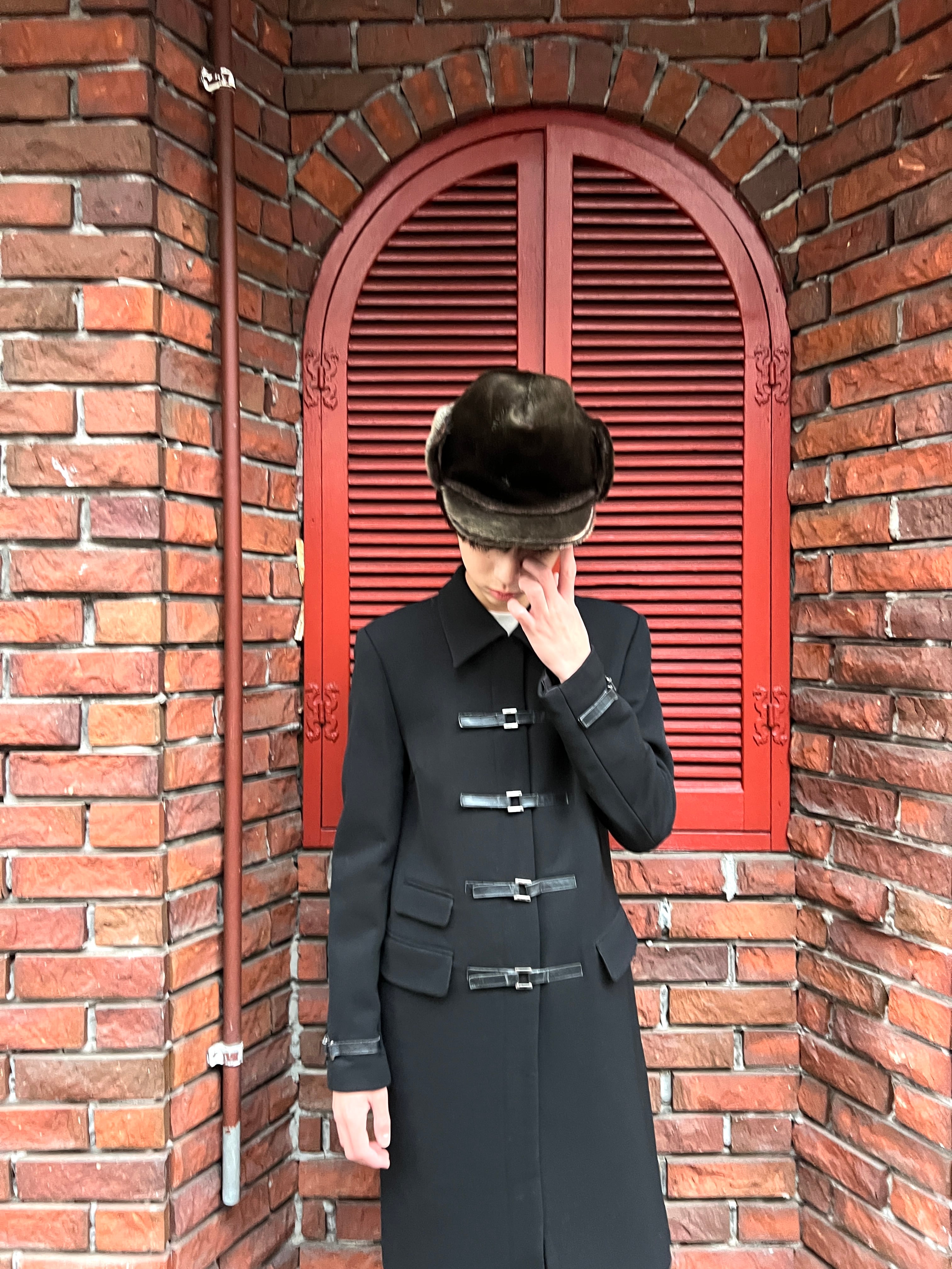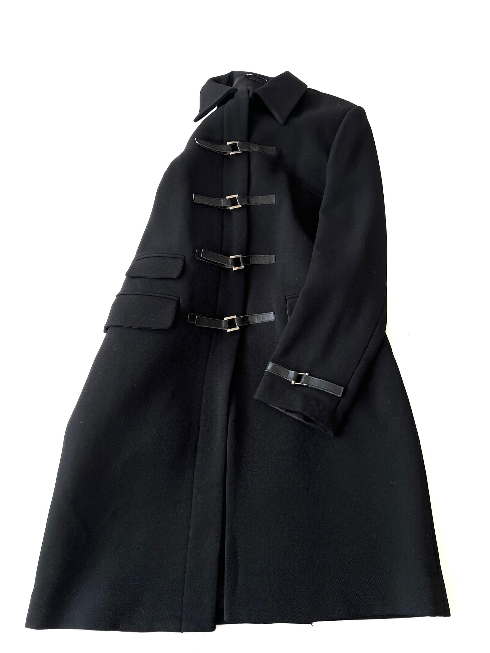 このコートの主役とも言える、フロントに大胆に配置された4連のバックルストラップ。フェイクレザーとシルバーの金具が、モードなスパイスを効かせています。