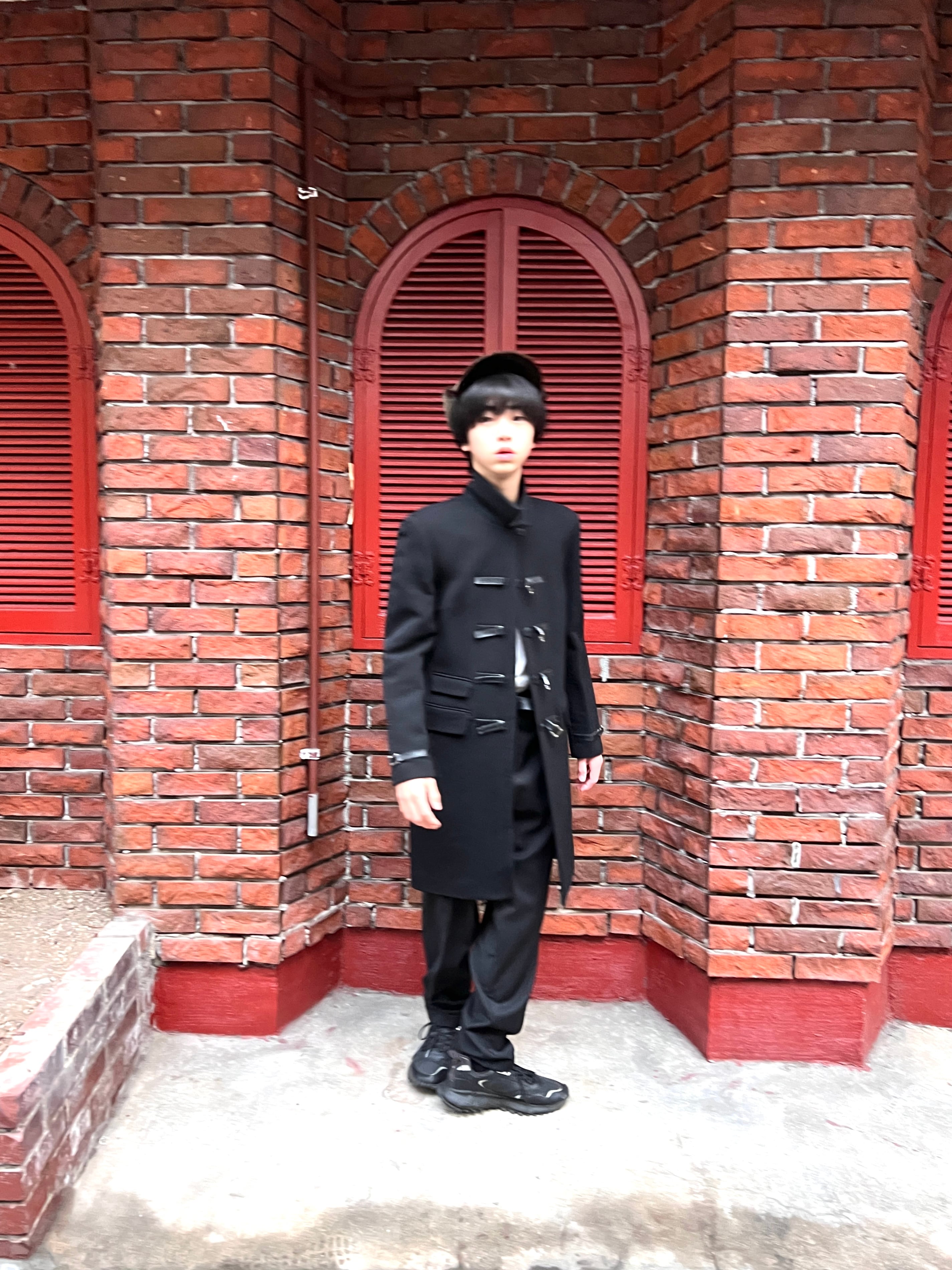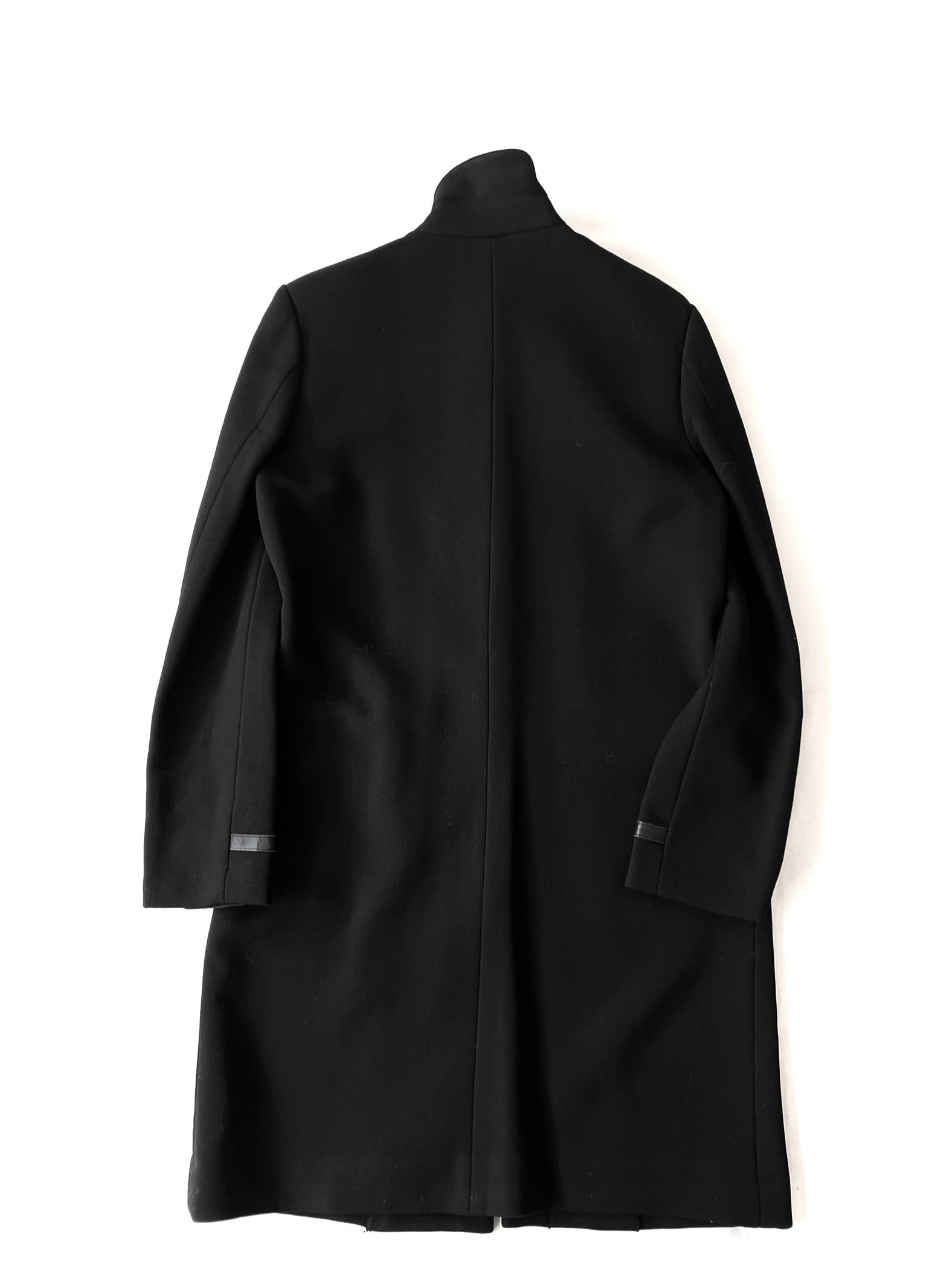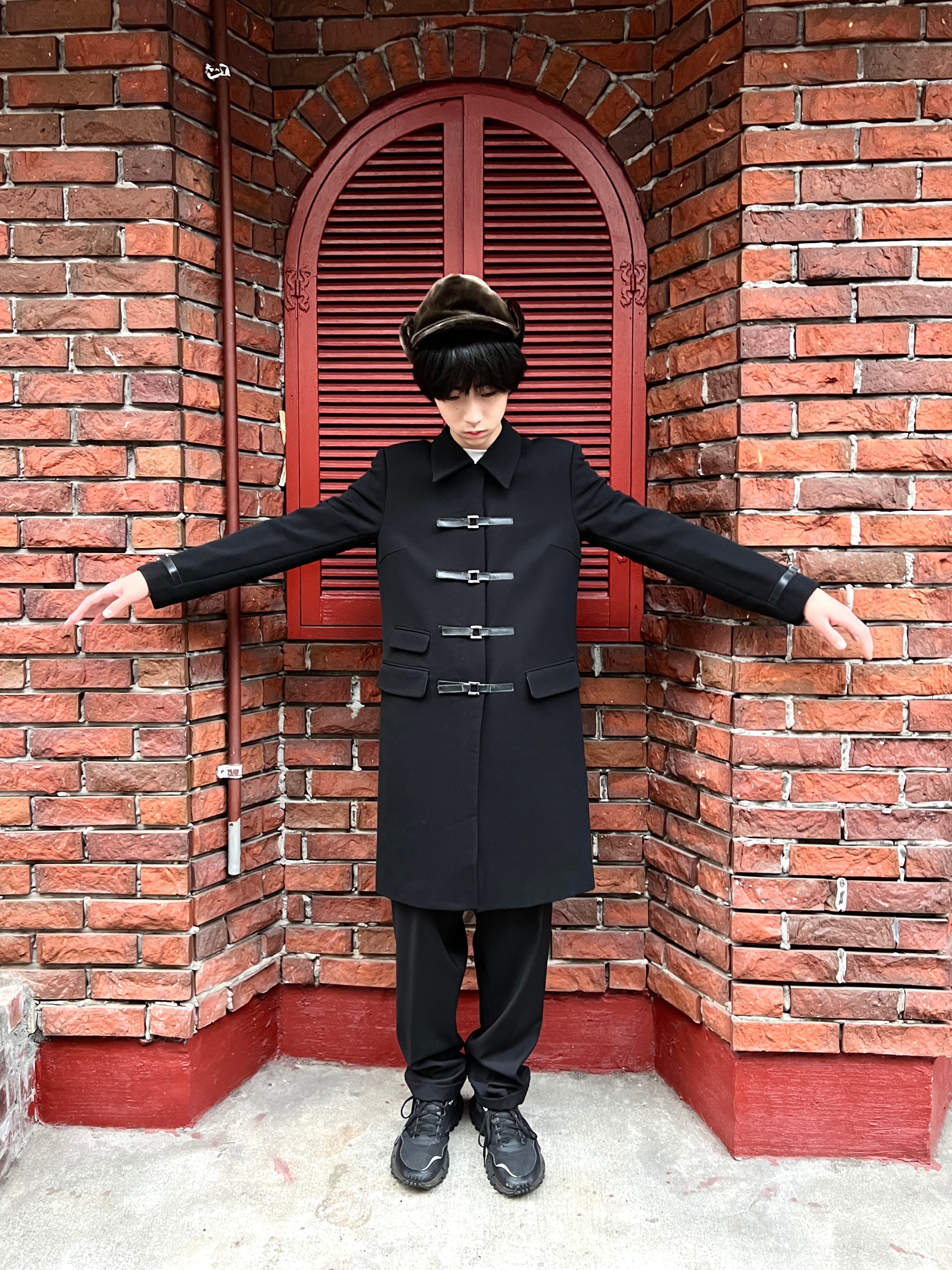 このコートの主役とも言える、フロントに大胆に配置された4連のバックルストラップ。フェイクレザーとシルバーの金具が、モードなスパイスを効かせています。